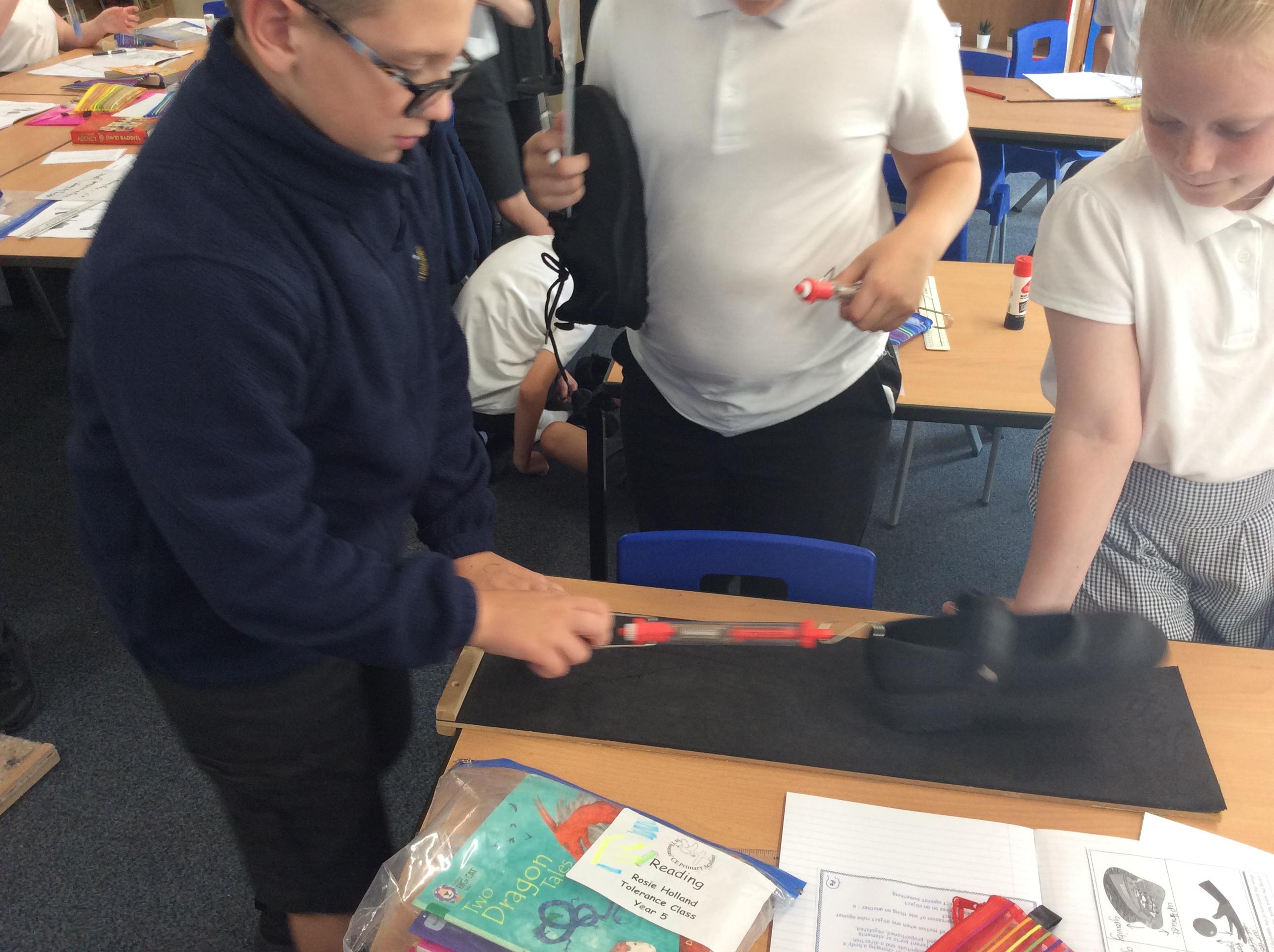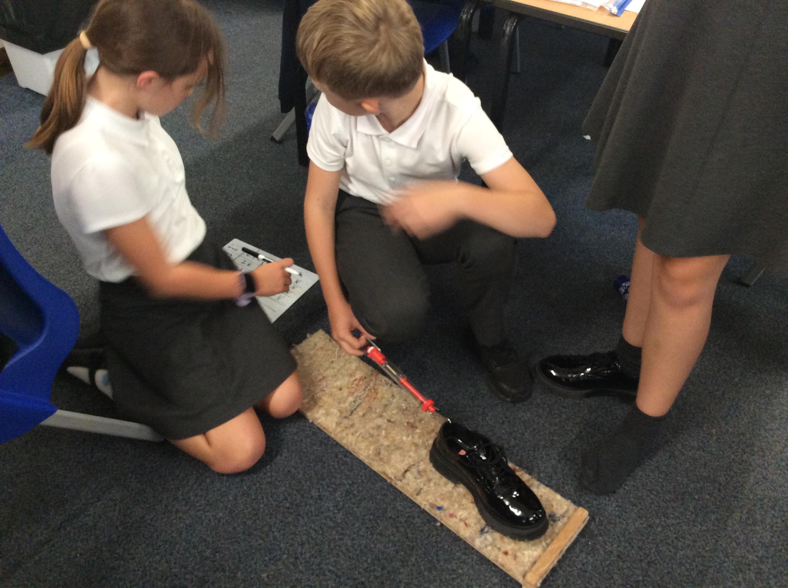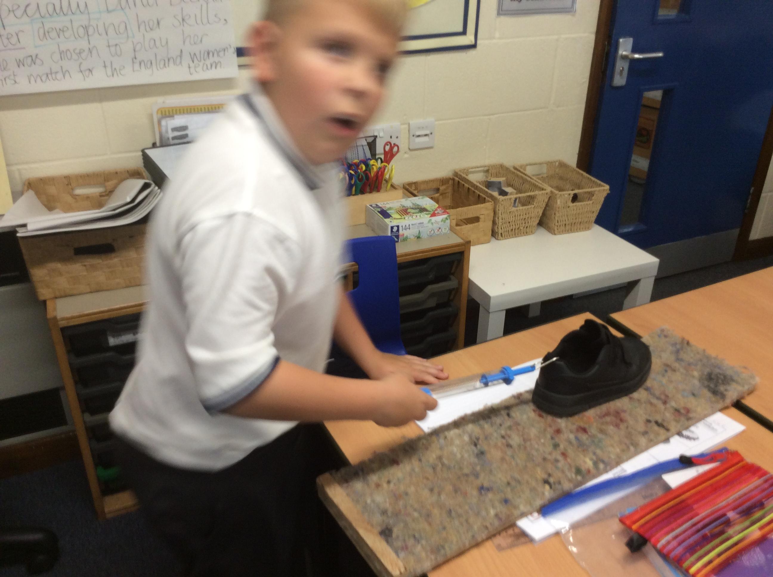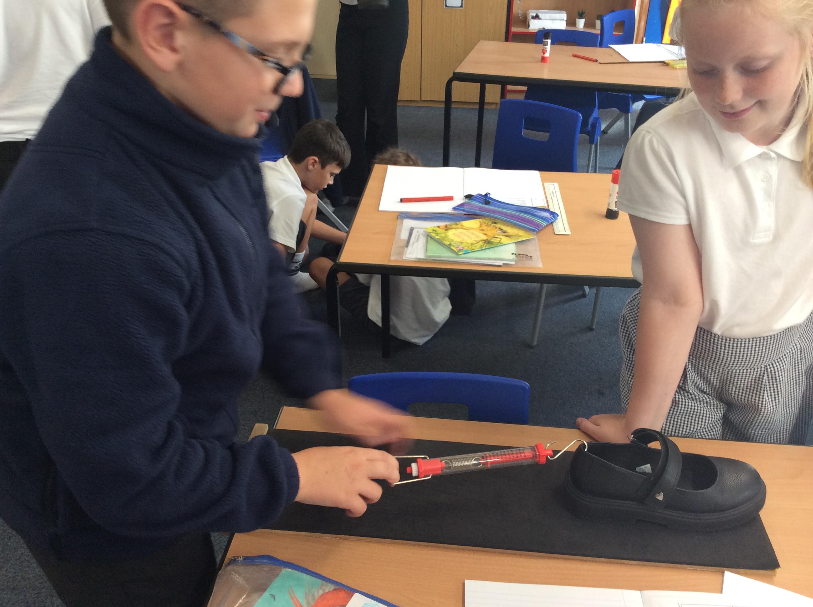 We explored friction by pulling our shoes over different surfaces. We pulled our shoe three times over each surface, measured the force needed in Newtons and then found the average. We ensured it was a fair test by only changing one variable each time, the surface the shoe was pulled over. Ask us about what we found out!