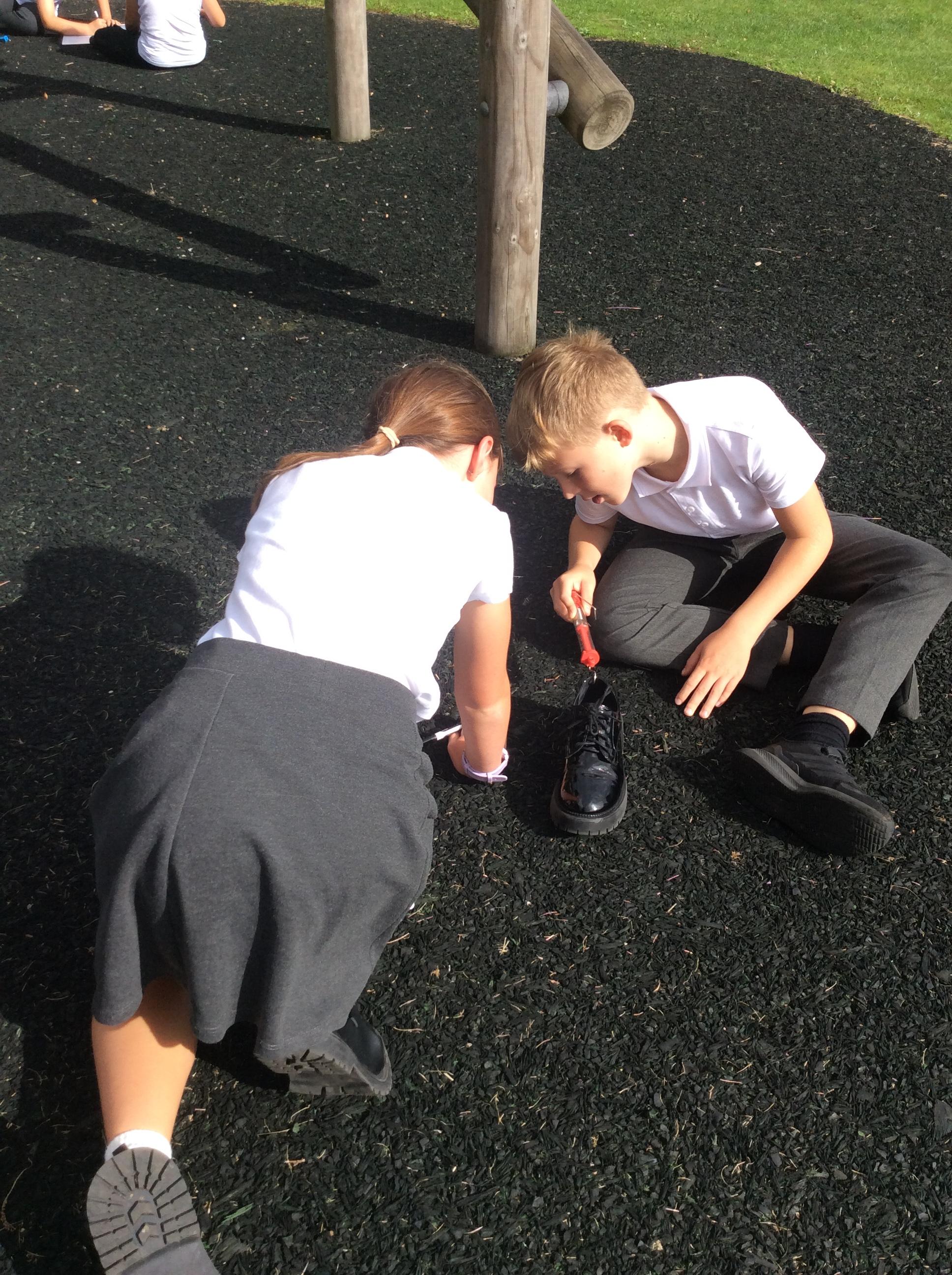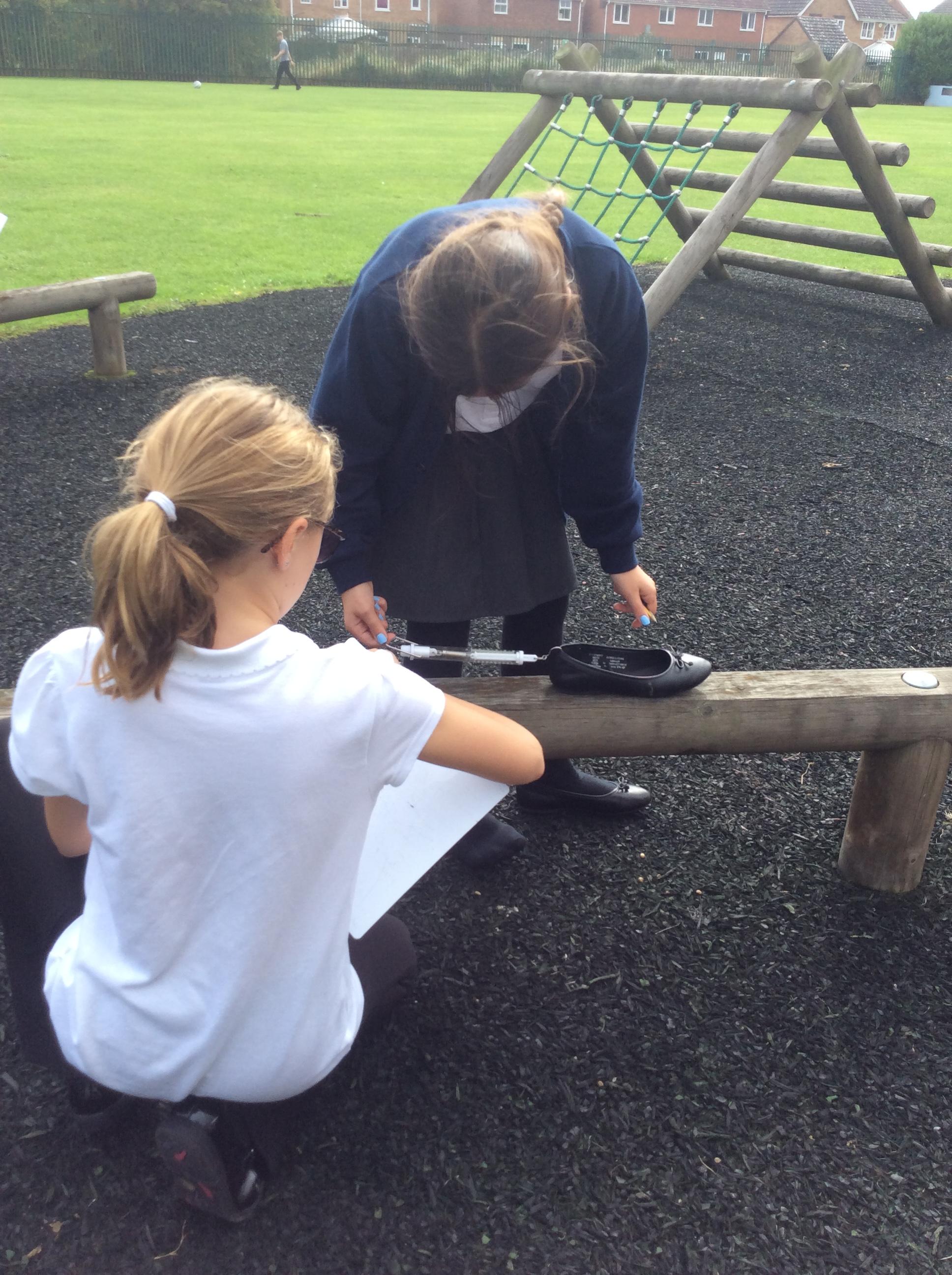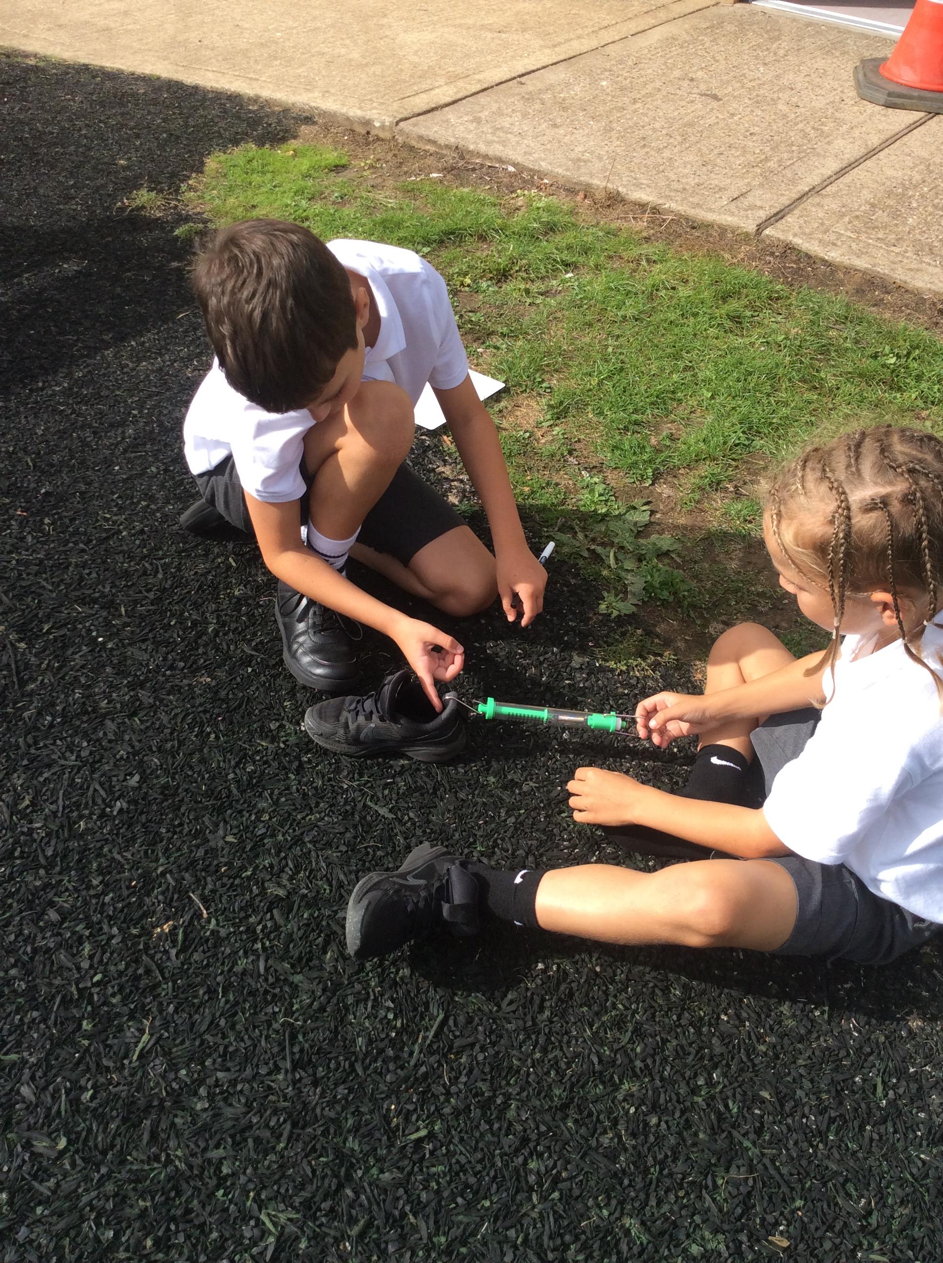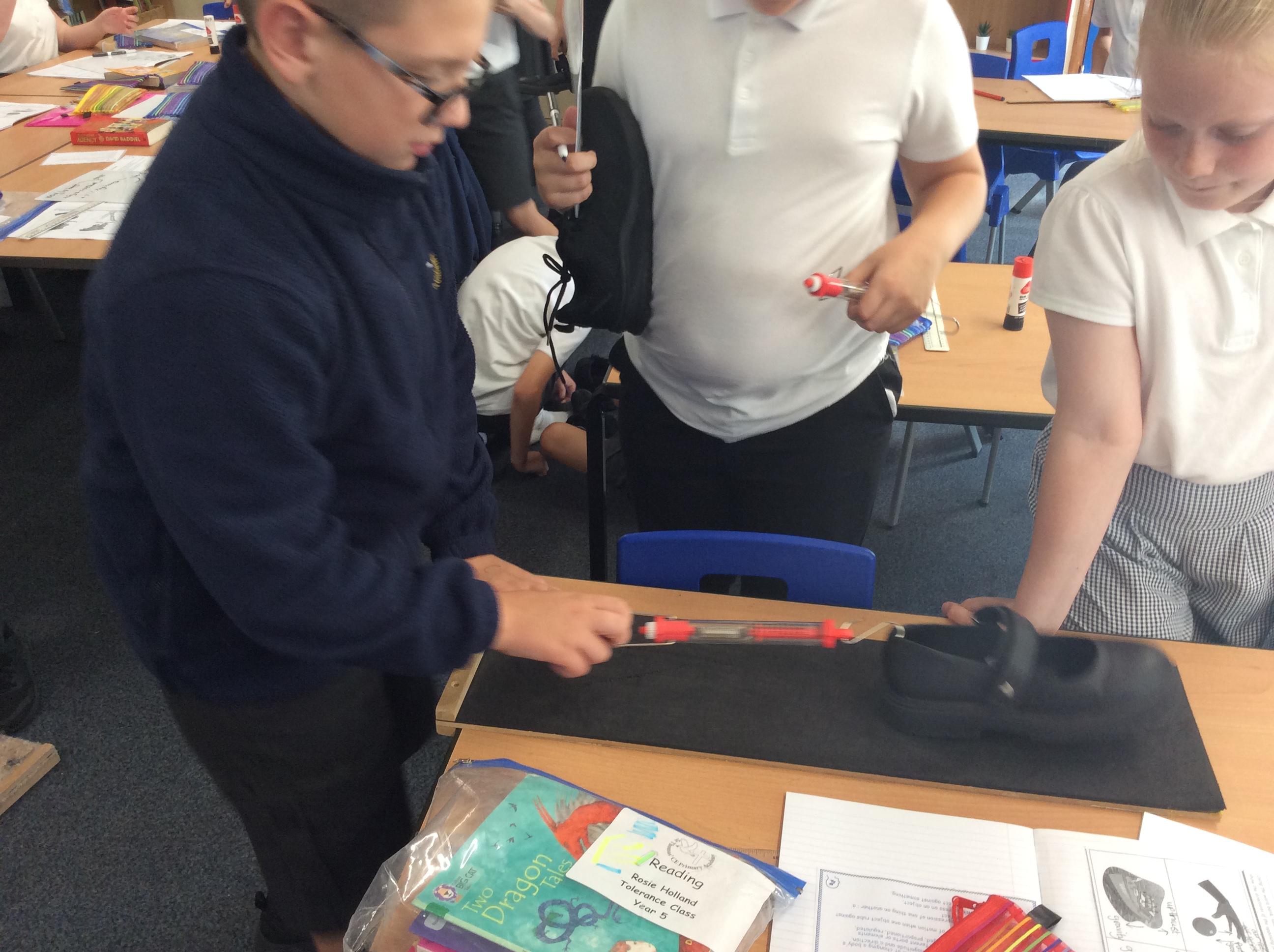 We explored friction by pulling our shoes over different surfaces. We pulled our shoe three times over each surface, measured the force needed in Newtons and then found the average. We ensured it was a fair test by only changing one variable each time, the surface the shoe was pulled over. Ask us about what we found out!