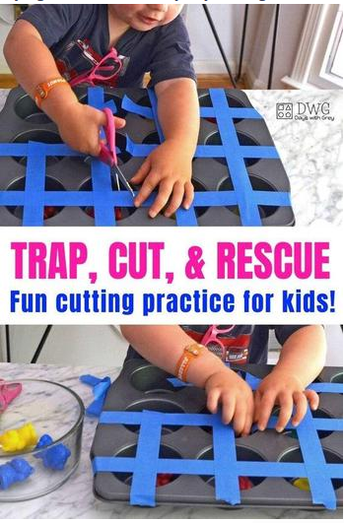 Put some small toys into your muffin tins and then cover with masking tape. Let your child practice trying to rescue their toys by cutting the masking tape.