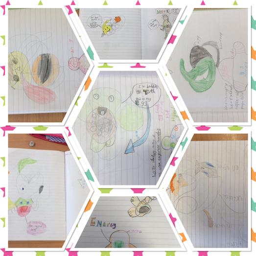 Year 1 also took part in the squiggle game, it opened their imaginations and created pictures of all sorts including fish and cakes.