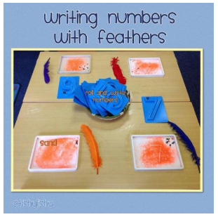 Let your child have fun with feathers. Place some coloured sand in a tray and then give your child some numbers to copy using the feather.
