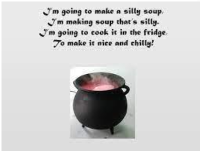 Can you make some silly soup. Each soup that you create needs to have 3 ingredients that start with the same sound. For example, toast, toffee and tomatoes. Perhaps you can repeat the rhyme below and list the different types of ingredients.