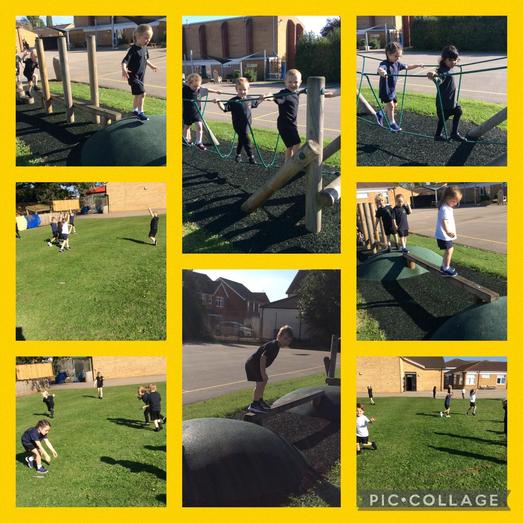 The children are getting much quicker at getting changed for PE and this week we took the opportunity to explore our outdoor trim trail as well as using our bodies to reach high and low whilst moving around a large area, changing directions when they hear different instructions.
