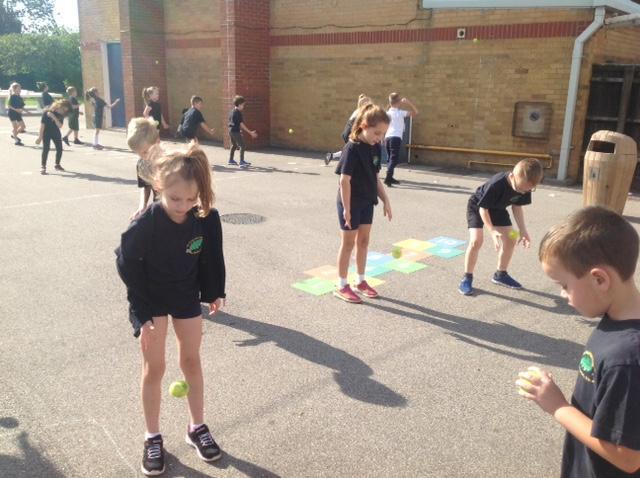To improve the children's coordination and agility, the children have been learning to bounce and receive the ball in a variety of ways - on the their own, with a partner and to the wall. They have realised they have to move their feet and hands towards the ball as well as be ready.