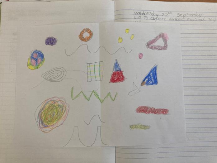 Whilst listening to a piece of music, the children explained how it made them feel and what emotions it drew out of them. They quickly linked it to the terms of 'pitch and tempo' and drew shapes and patterns to represent this.