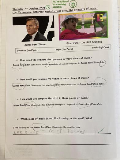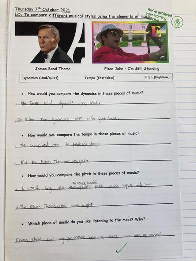 Whilst listening to a James Bond theme tune and an Elton John track, the children were able to compare for similarities and differences. They were able to pick out the tempos and ranges in pitch and also began considering the musical element of 'dynamics'.