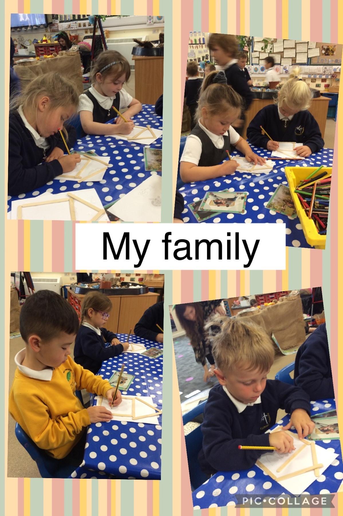 This week the children have been learning about families. They were able to name the people who live in their homes and also talk about those who are special to them. This has included the children talking about extended family members such as cousins, aunties, uncles and grandparents. The children could see how some families are large and some families are small. In groups, the children created their own houses using lollypop sticks and then drew their family members.