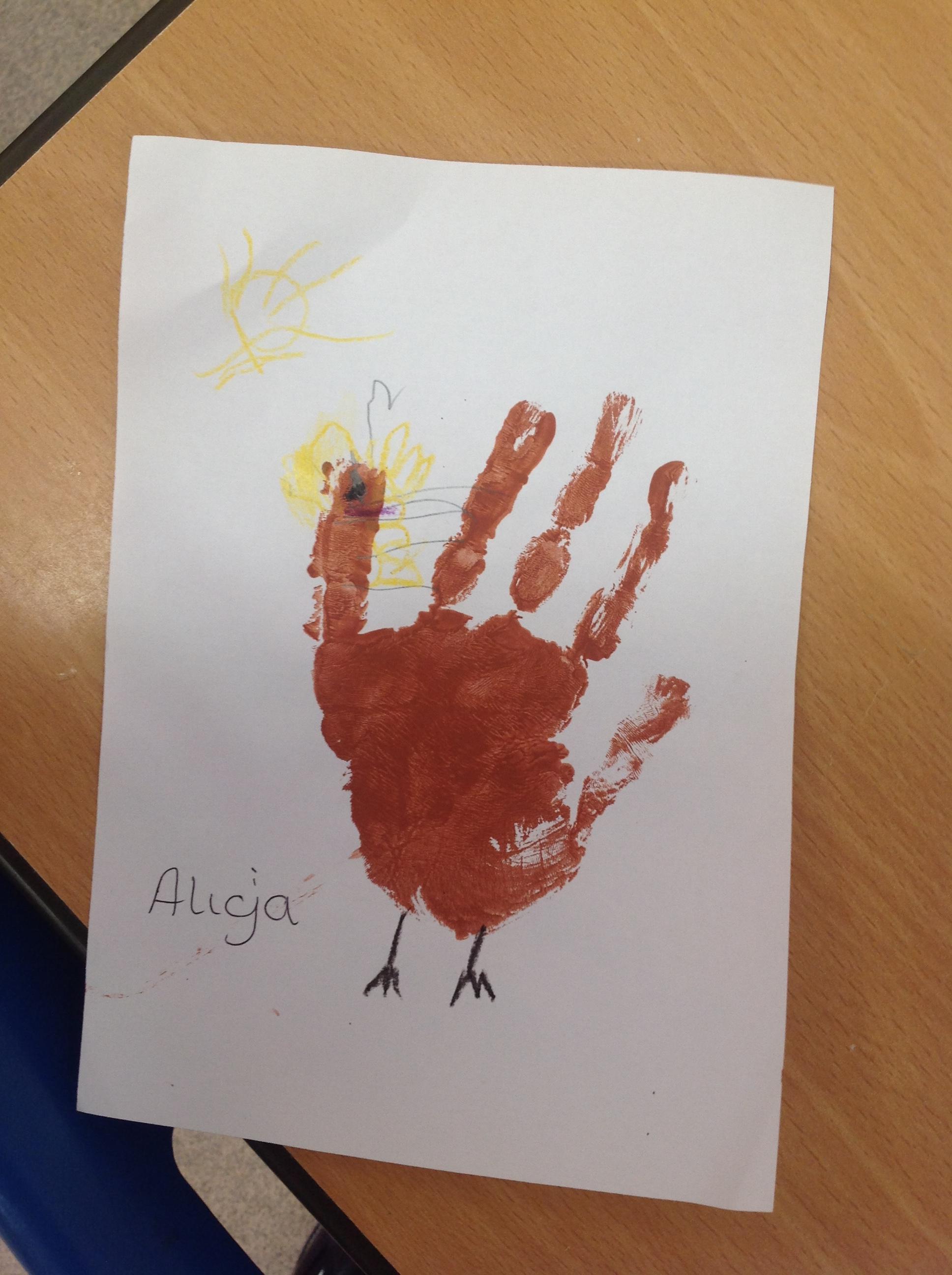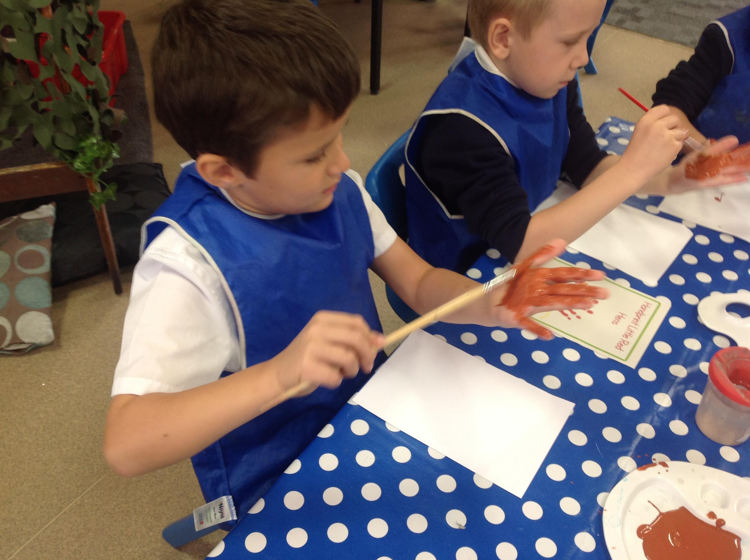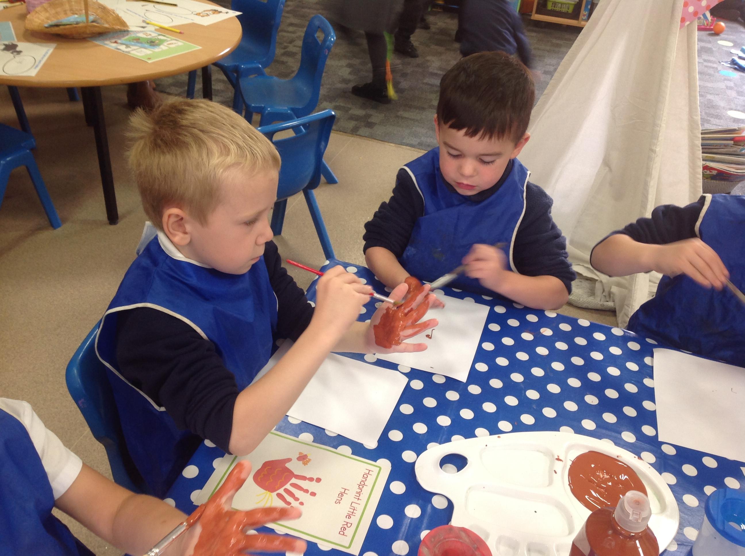 The children have also explored the printing technique to create their own representation of The Little Red Hen. They painted their own hands independently to create the body and feathers. After, they used wax crayons to add details such as feet, wings and a beak.