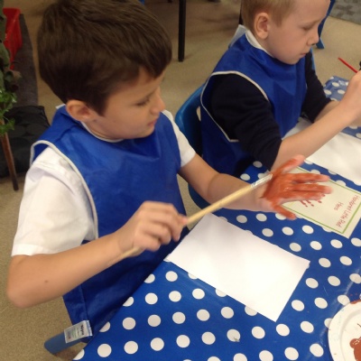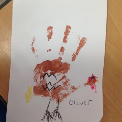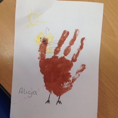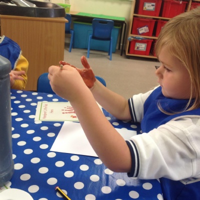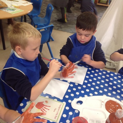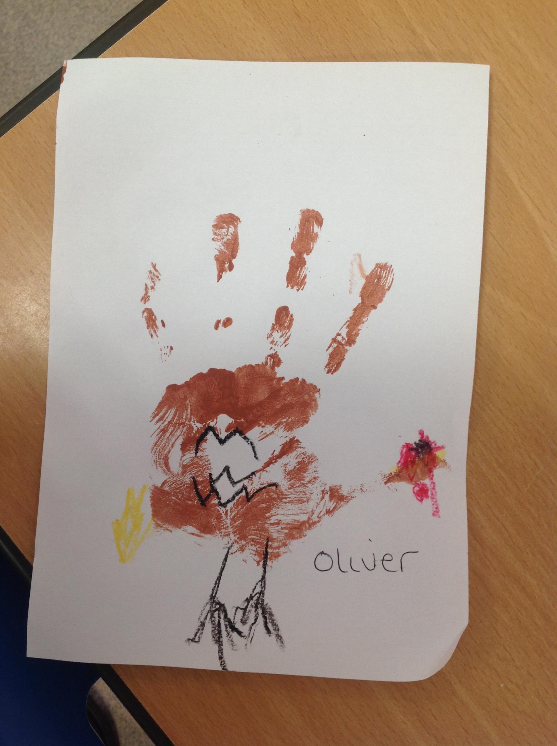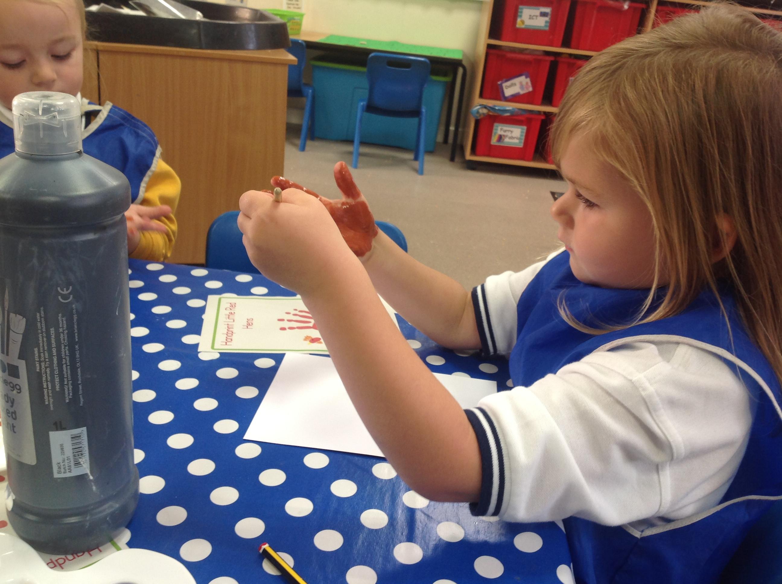 The children have also explored the printing technique to create their own representation of The Little Red Hen. They painted their own hands independently to create the body and feathers. After, they used wax crayons to add details such as feet, wings and a beak.