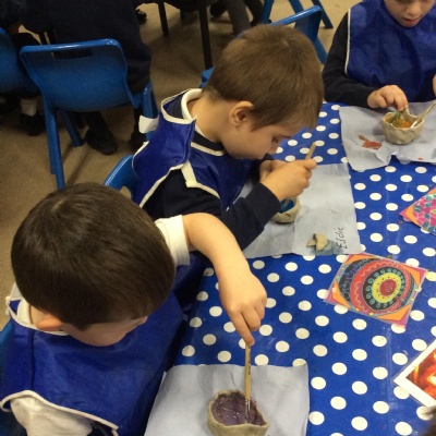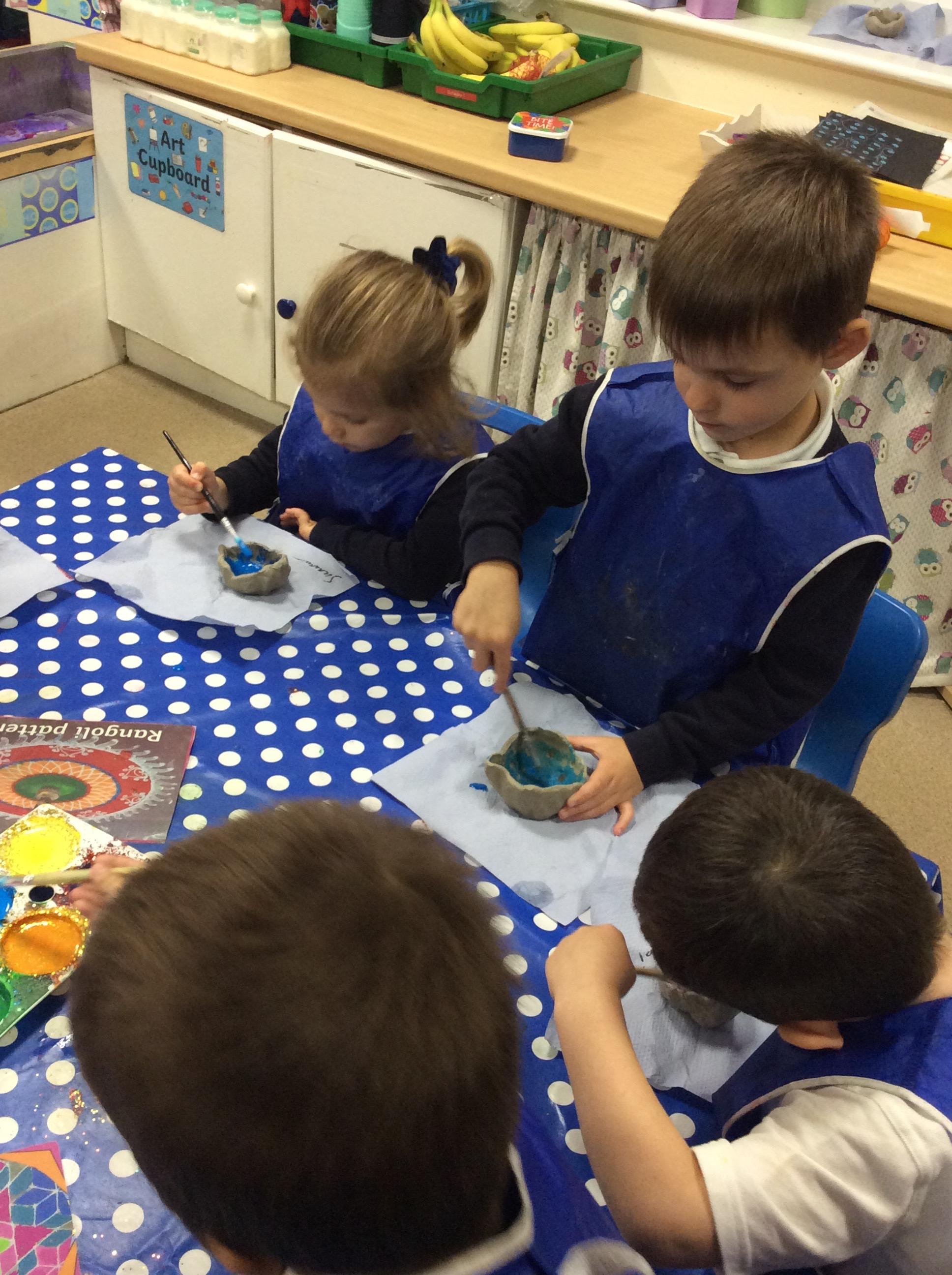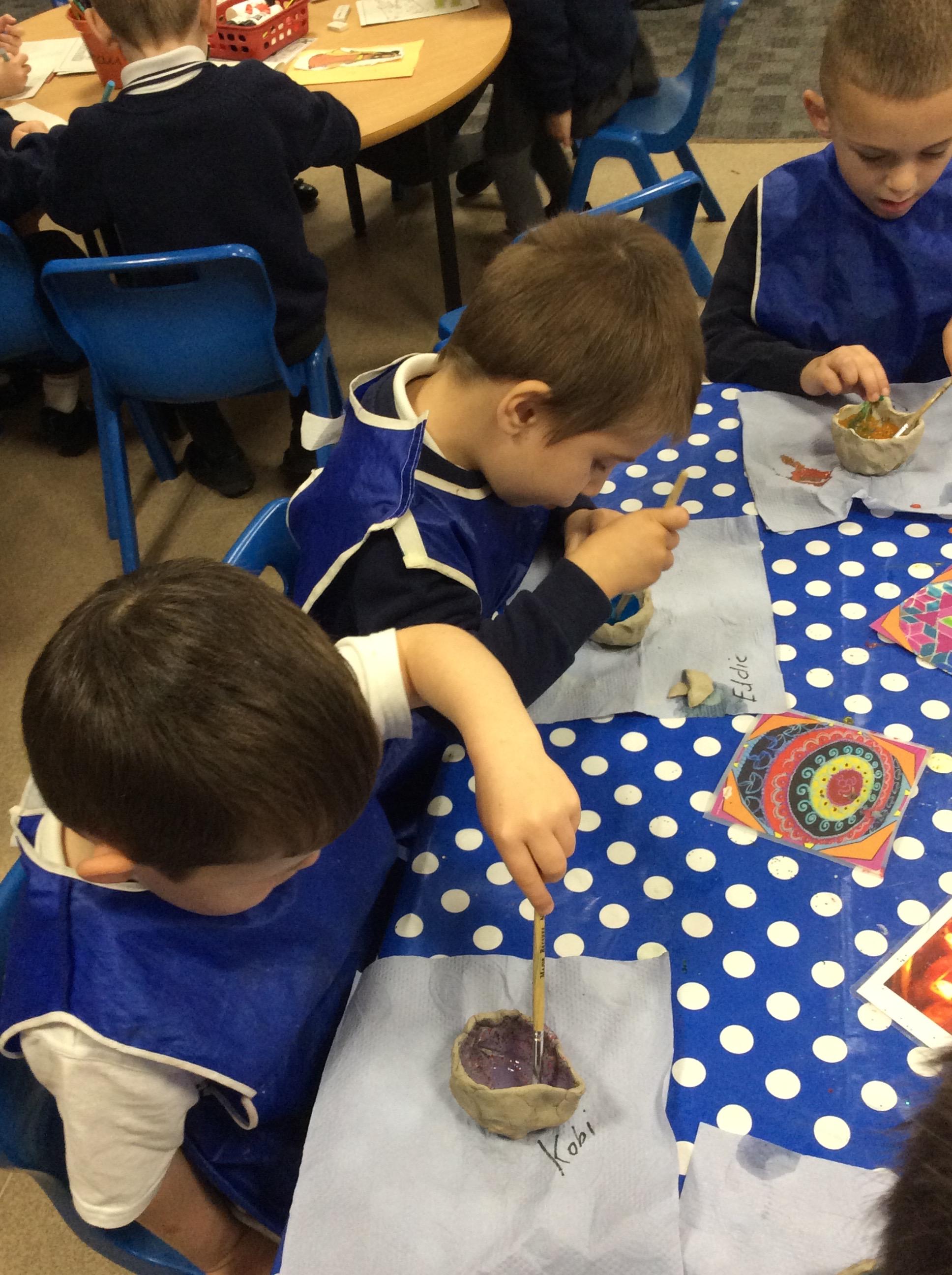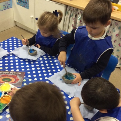 This week the children have been learning about the Diwali and how it is celebrated around the world. They all created a Diya lamp using clay and painted them in bright colours and glitter. Throughout the week, everyone has had the opportunity to create Rangoli patterns, make Diwali cards and tell the story of Rama and Sita.