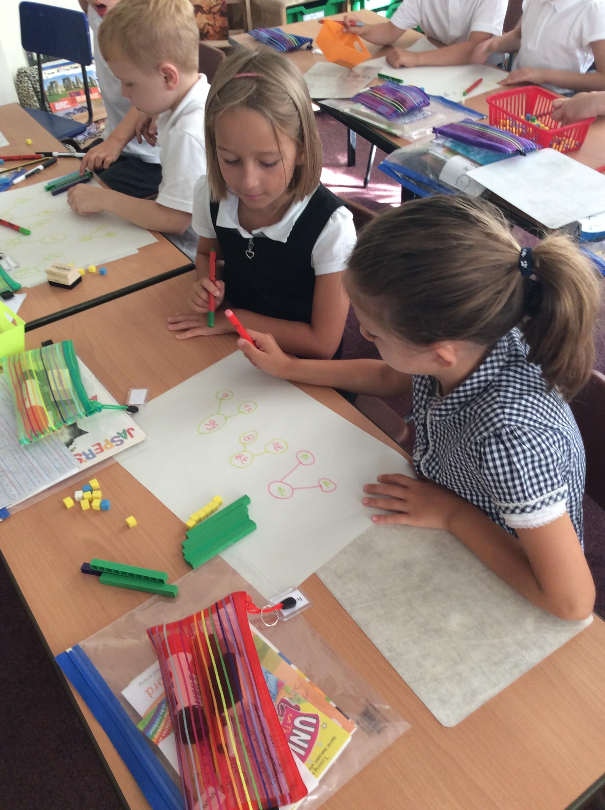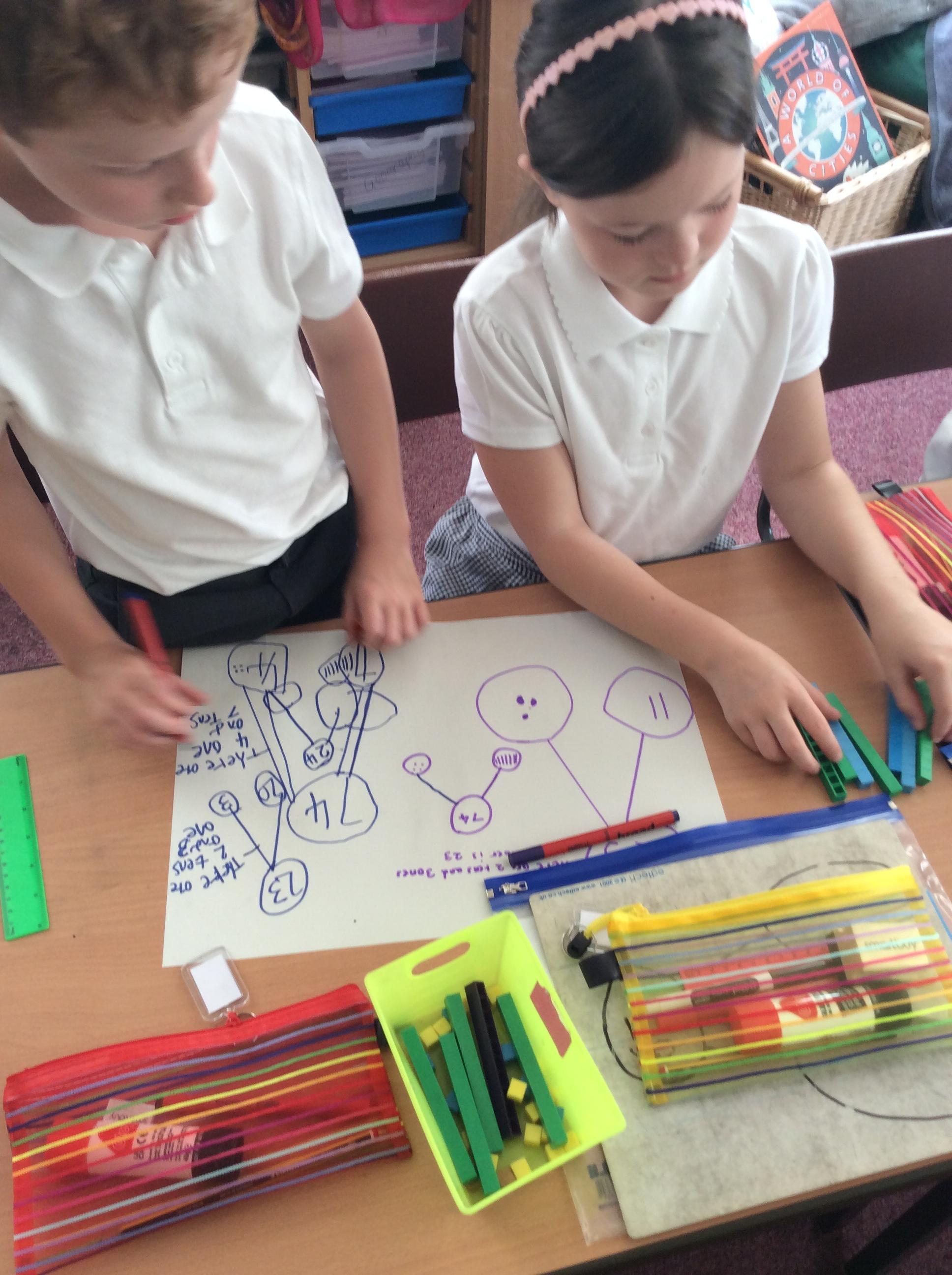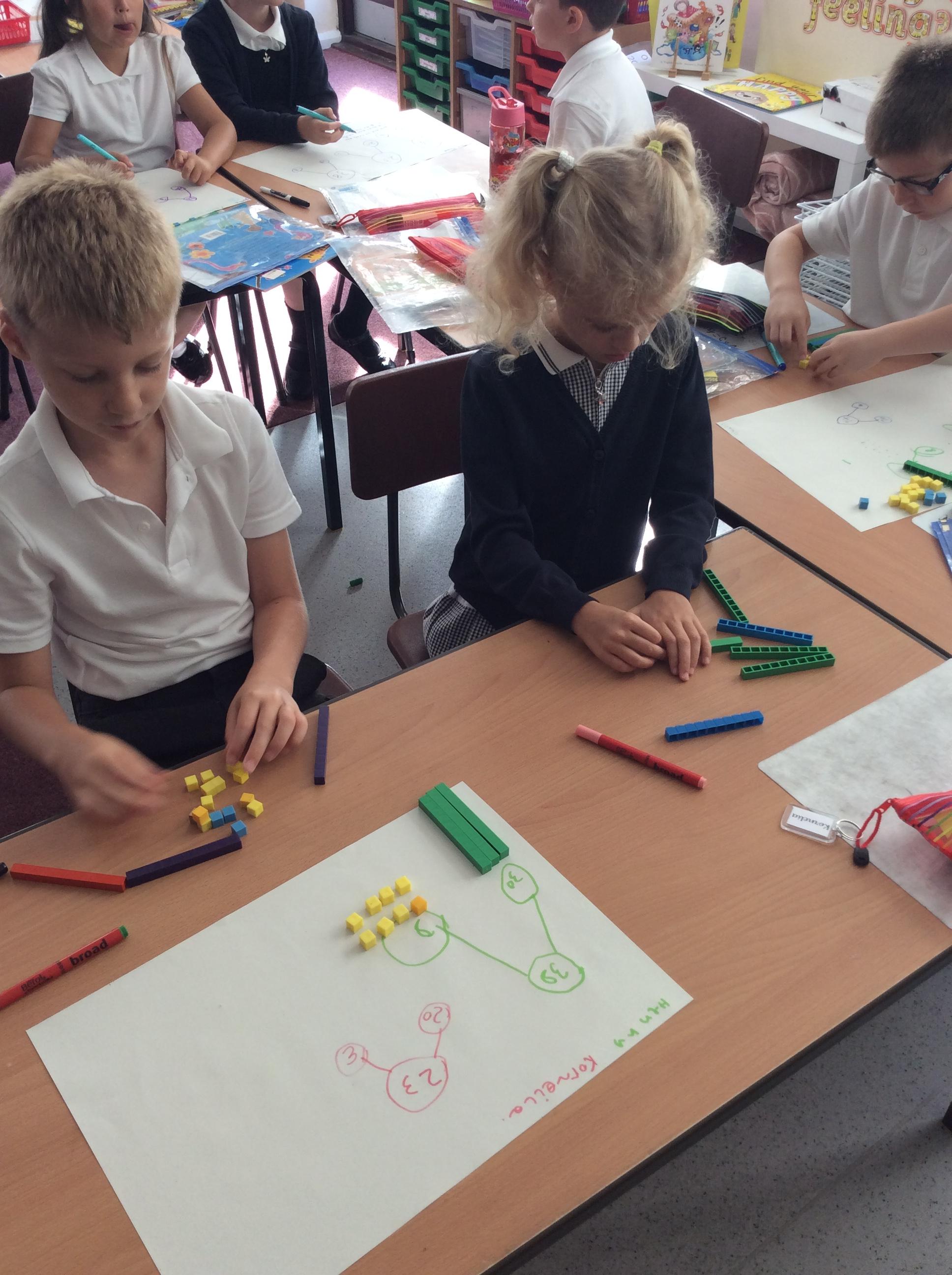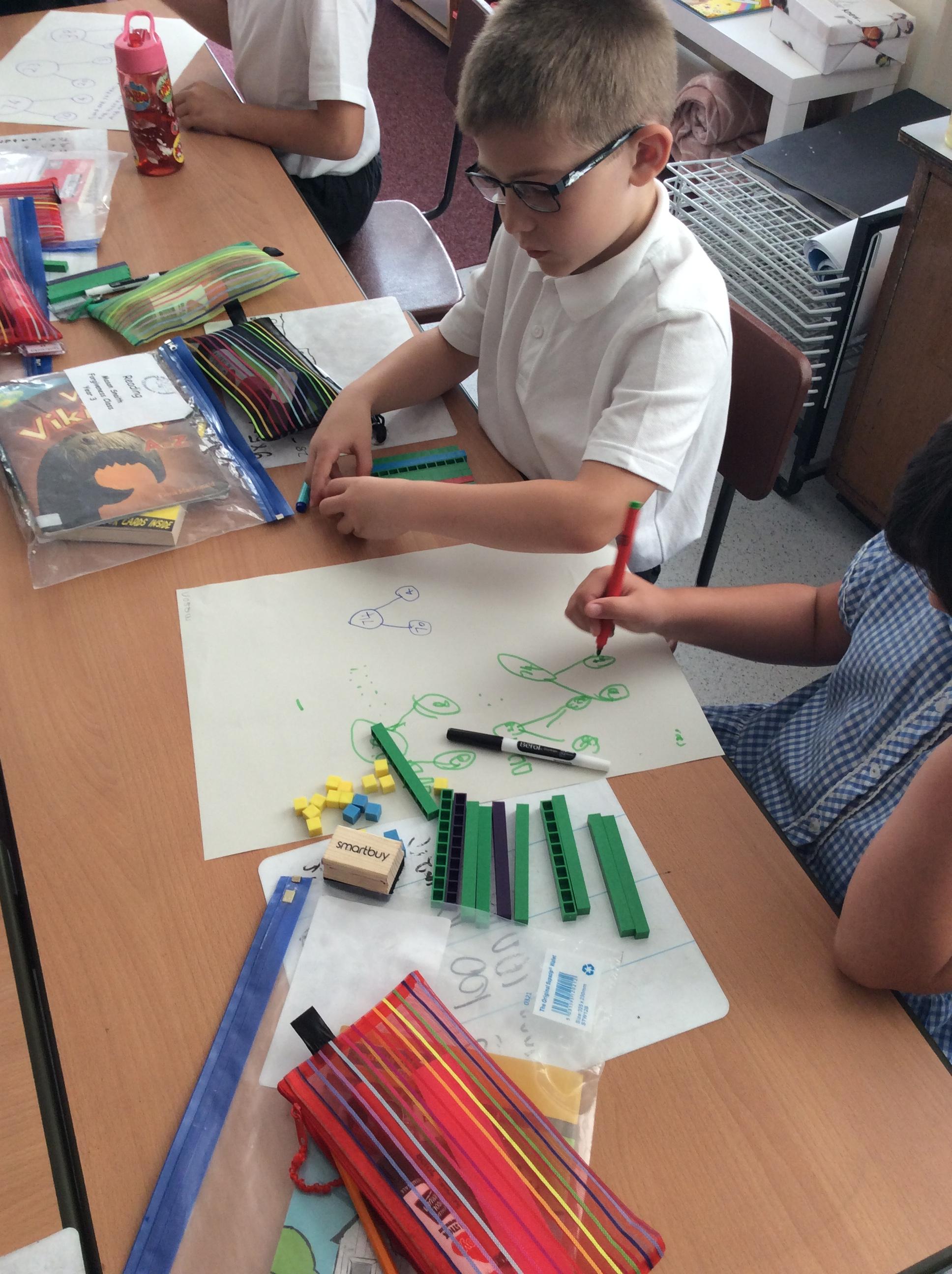 Using manipulatives, we made two and then three digit numbers as we explored the place value of each digit. After making the number, we drew part whole models to show the different ways numbers can be partitioned.