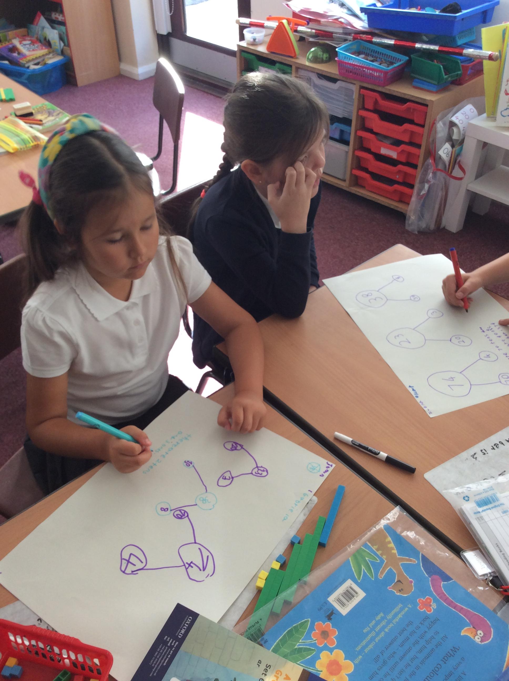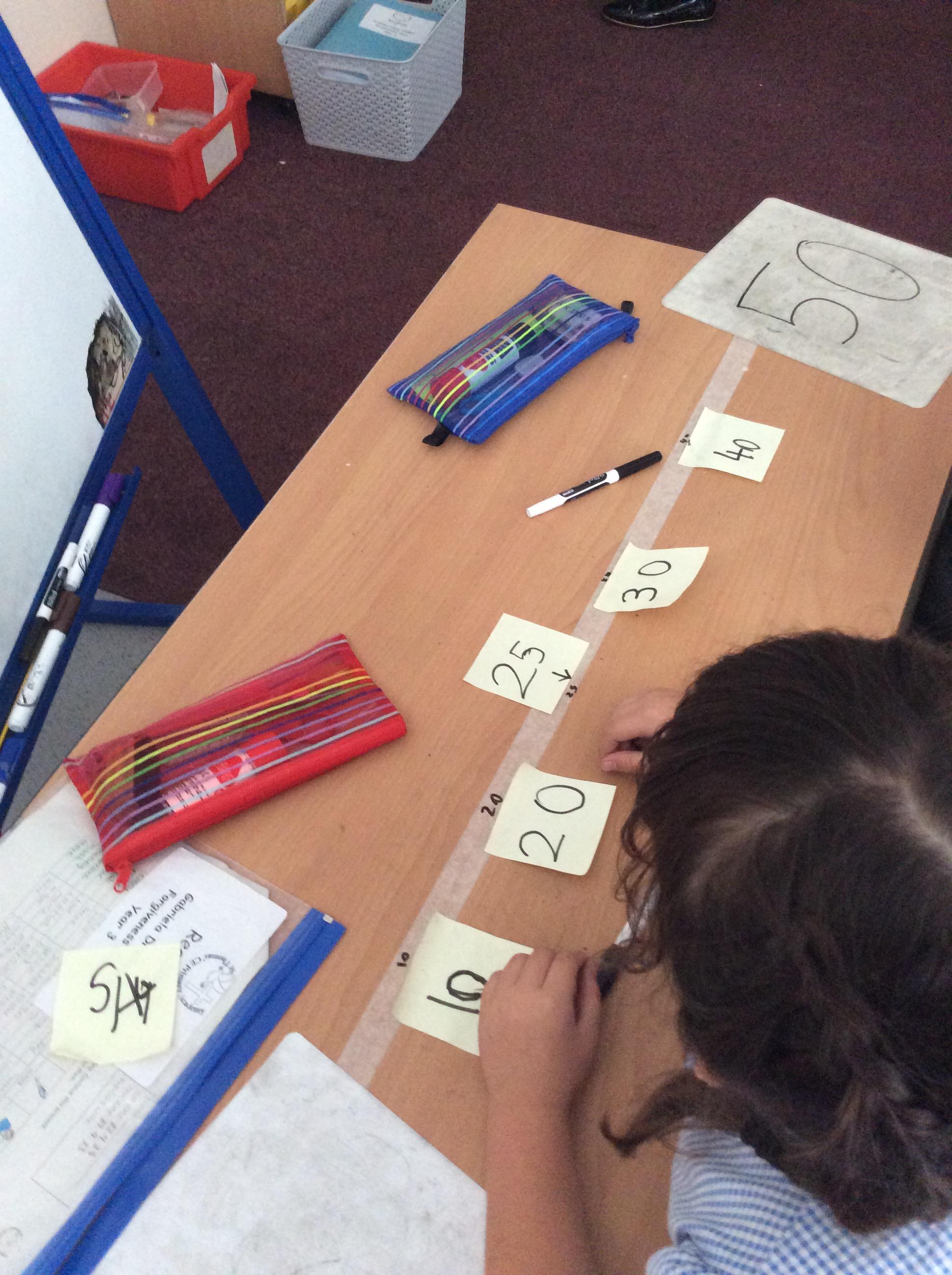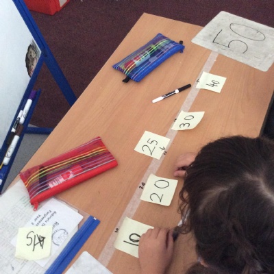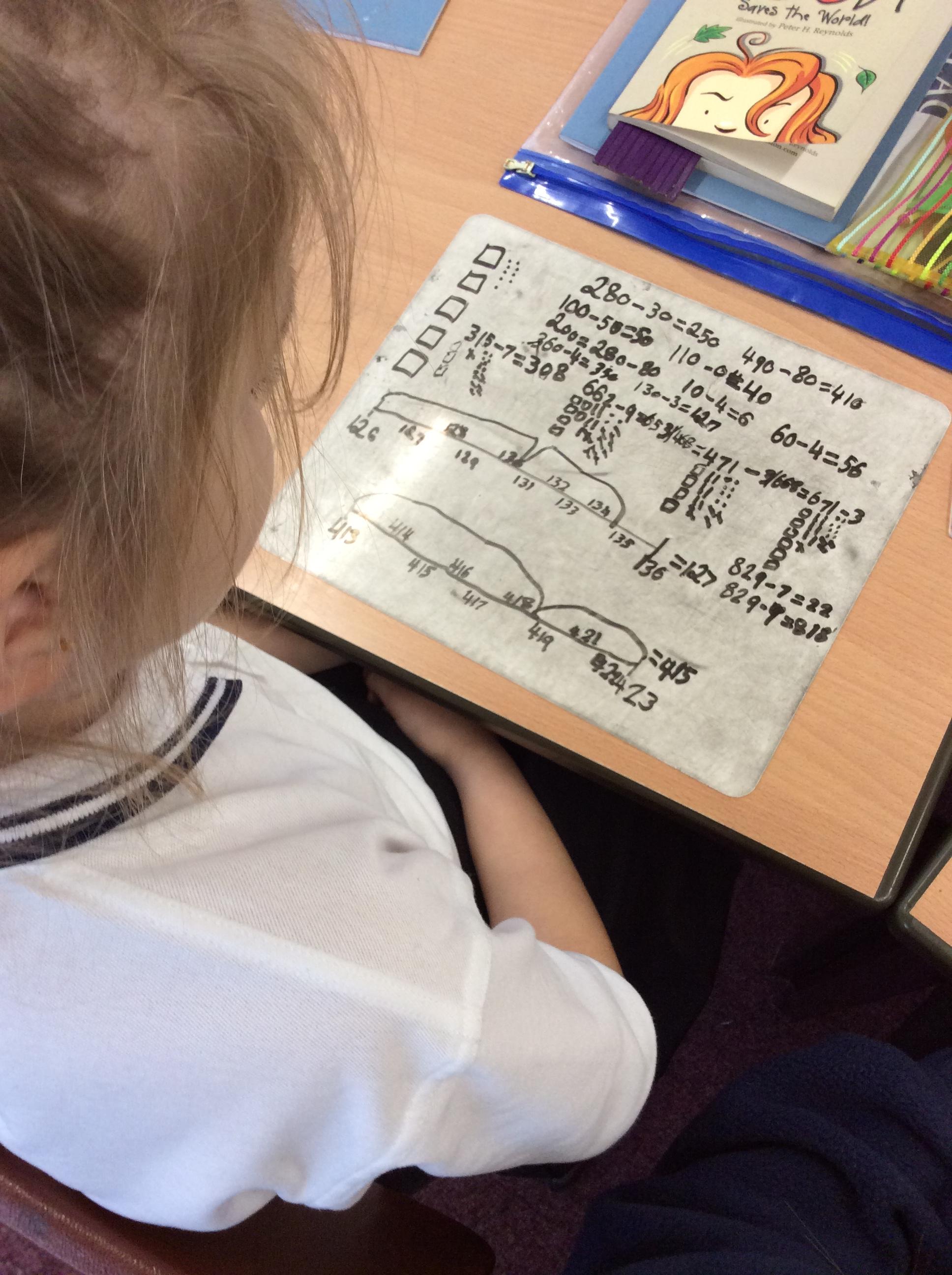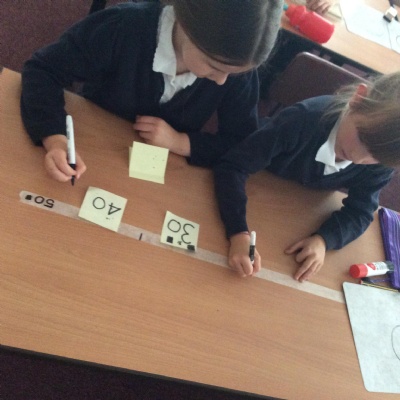 Using different methods, we explored addition and subtraction. Making notes of our working, we looked at using number lines, counting on to the nearest ten and using our knowledge of number bonds for ten to add on parts of numbers.