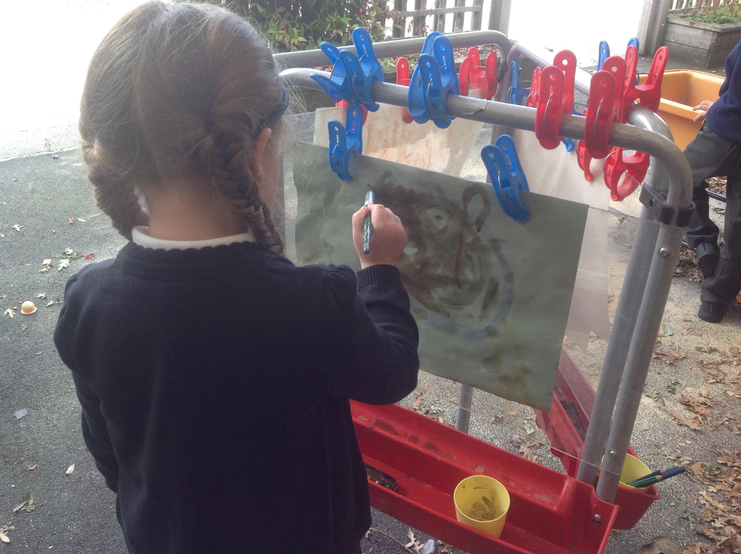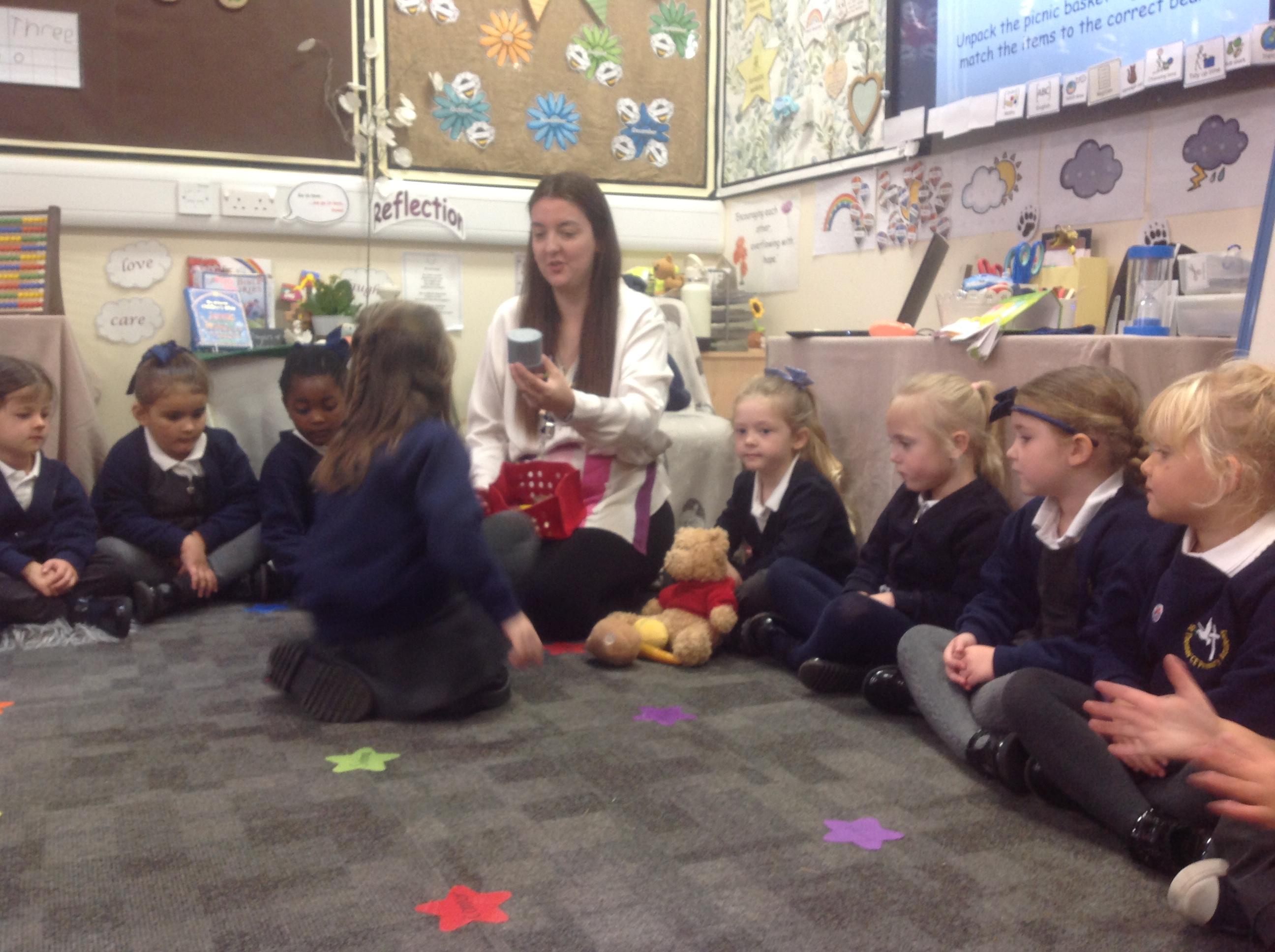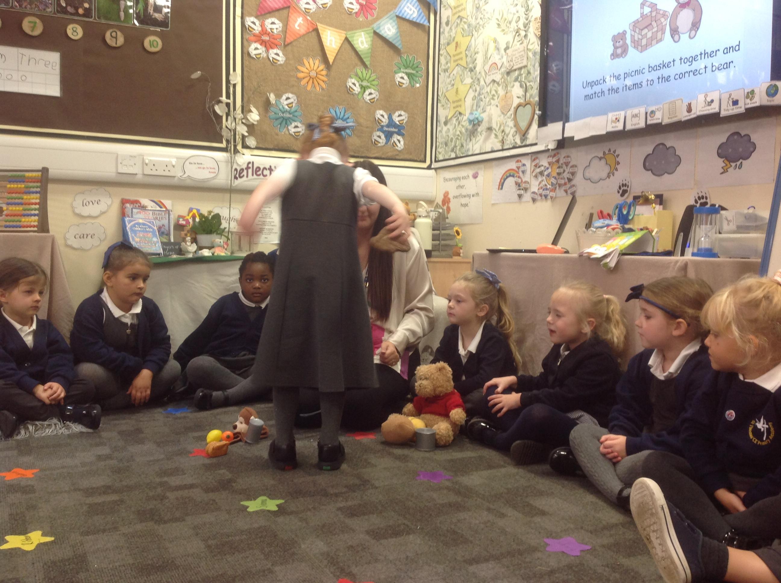 The children have loved joining in with the repeated phrases in the story and re-telling the story using different actions. The children have been able to continue to explore the story throughout the school day within the provision. Some children enjoyed creating pictures of the bear in our outdoor creative area and making bear collages inside.