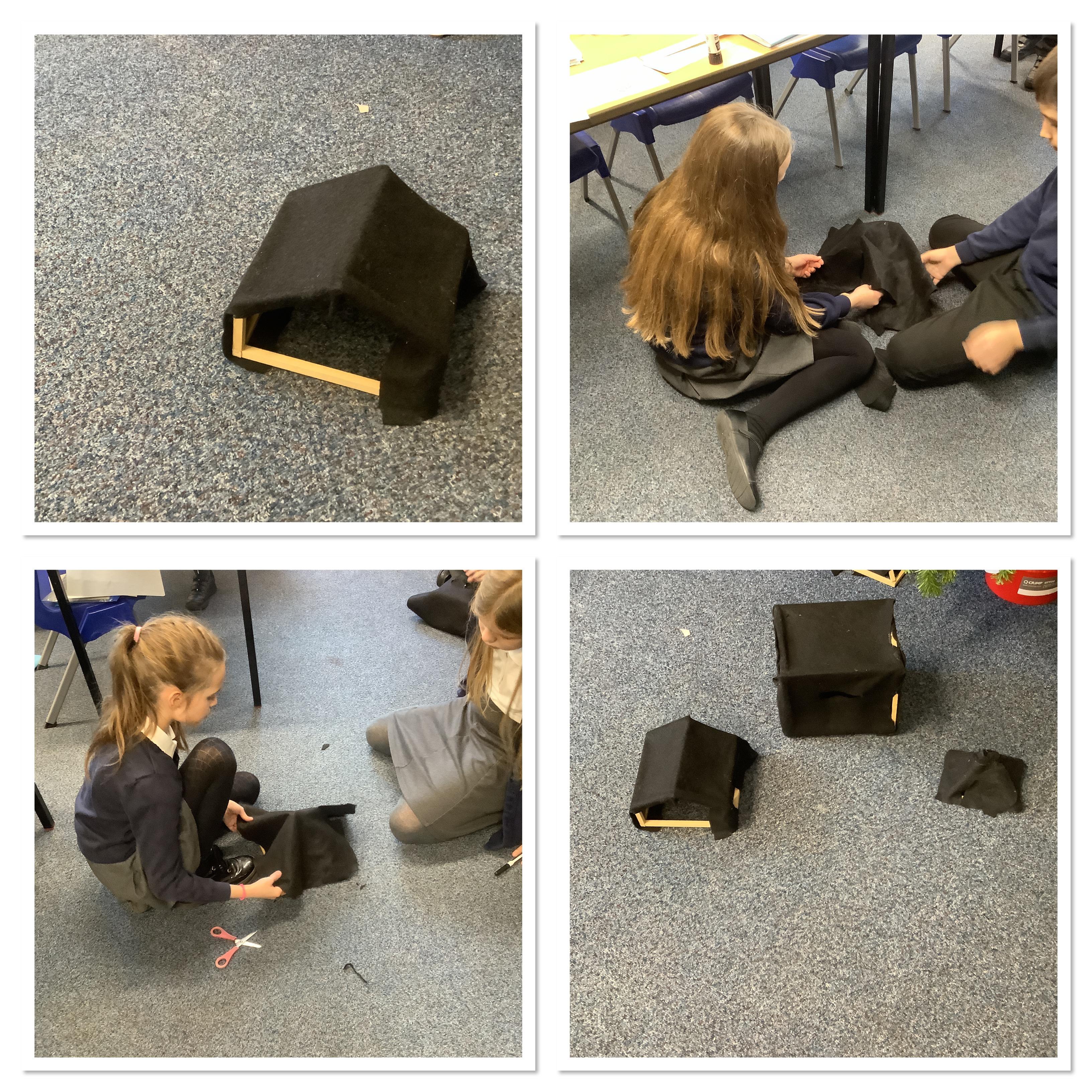 We were able to hot glue the wood pieces we sawed last lesson to form frames for our bird hides. Following this, we added fabric and added finishing touches such as cutting doors and viewing windows. We were very proud of the results!