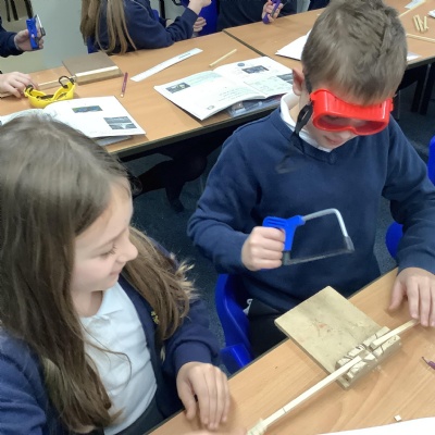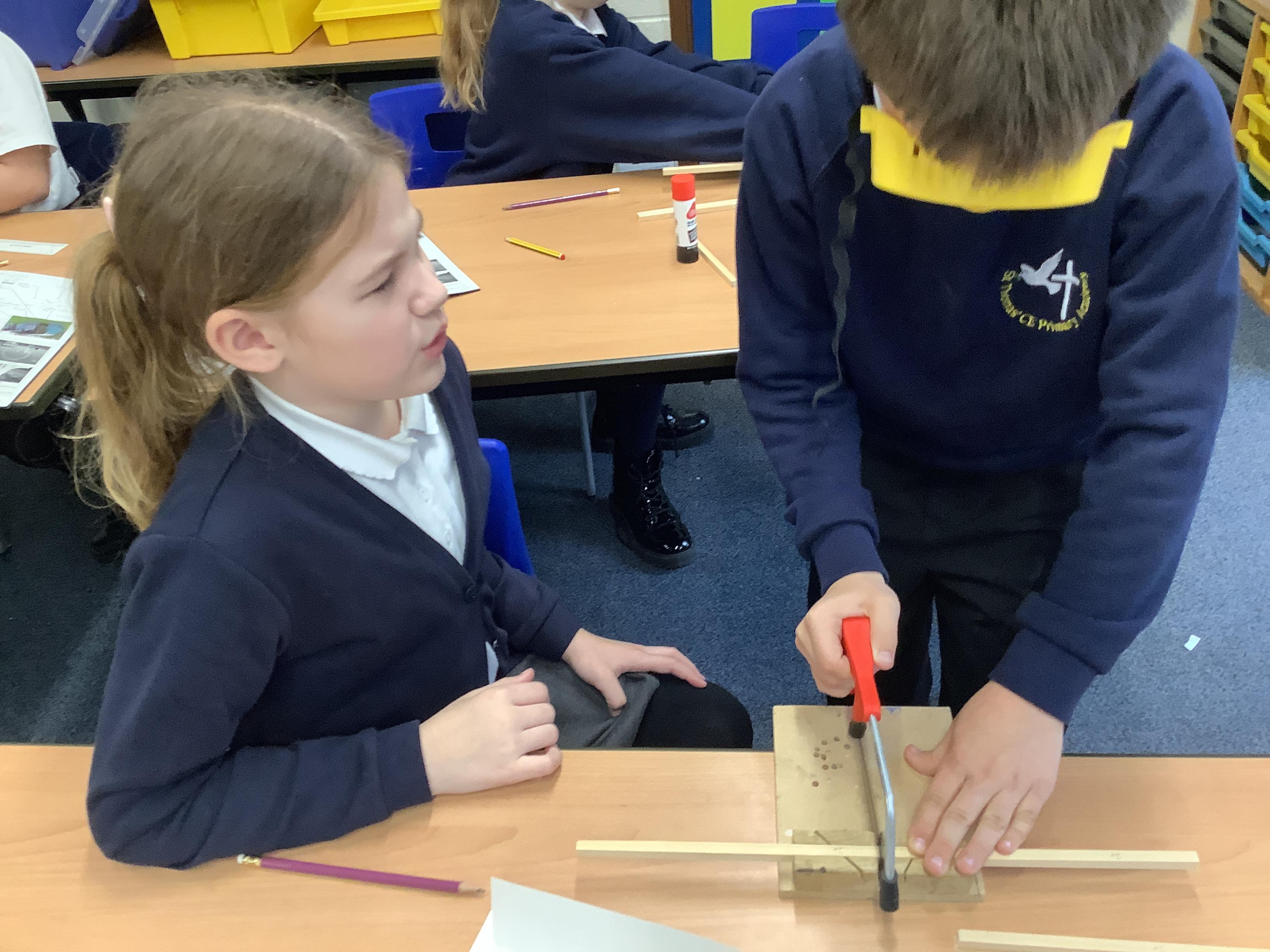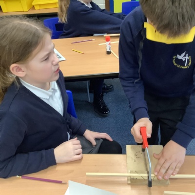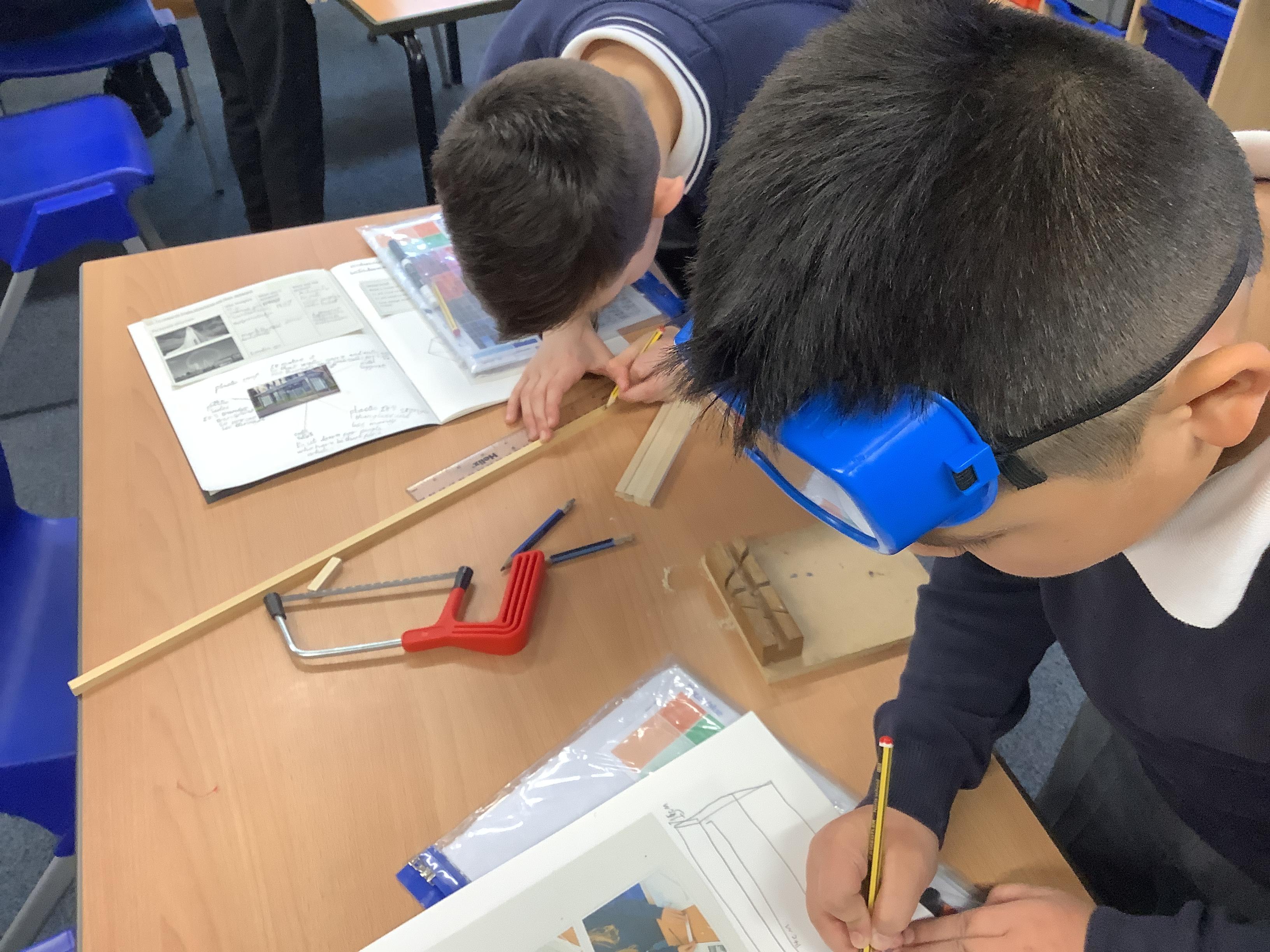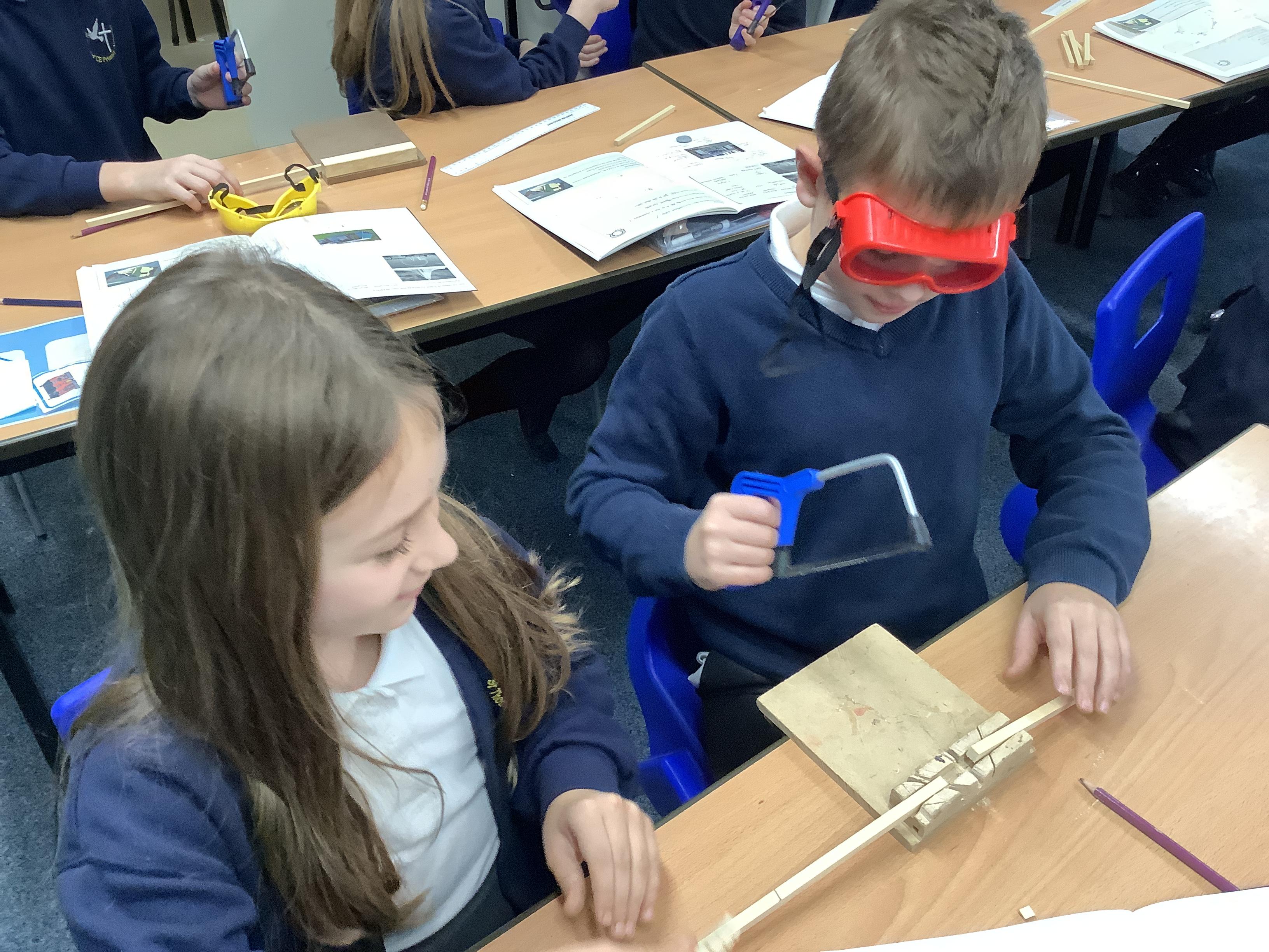 Today we began to build our miniature bird hides. We learned how to use the tools safely - junior hacksaws, wooden blocks and goggles - then measured according to our designs and cut pieces of square wood to length.
