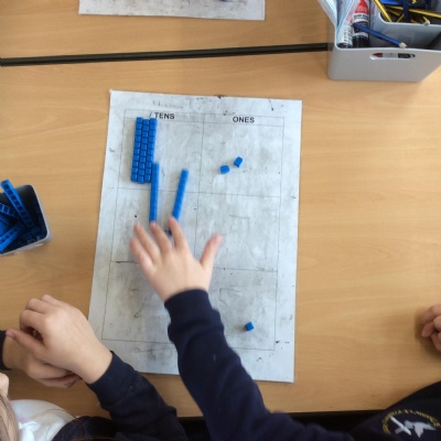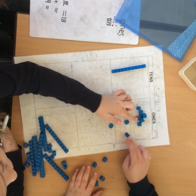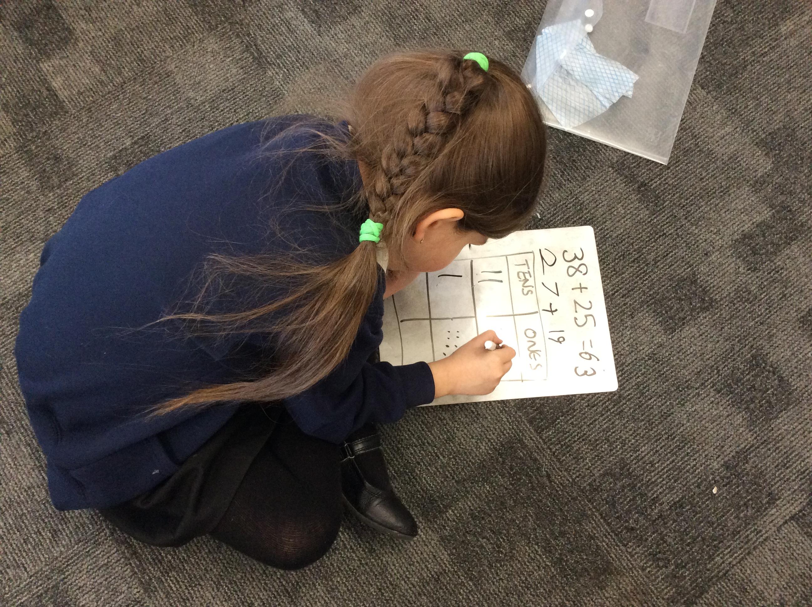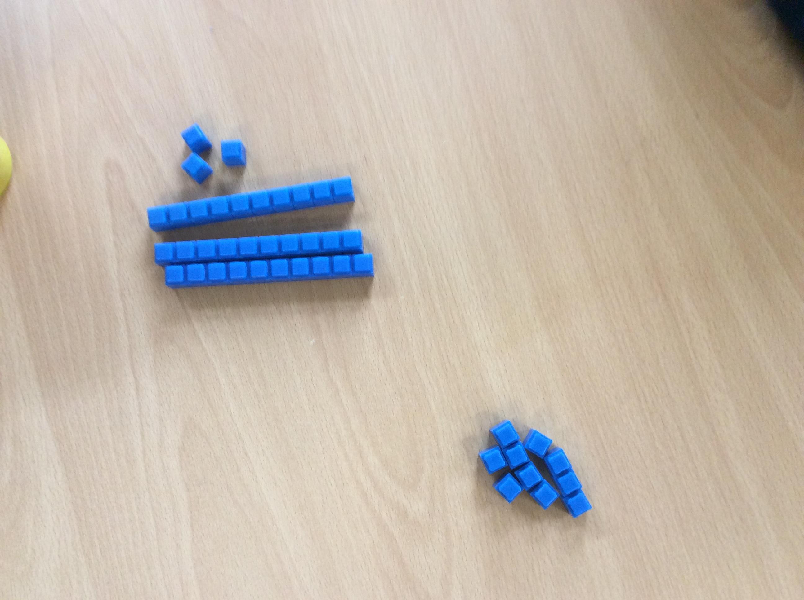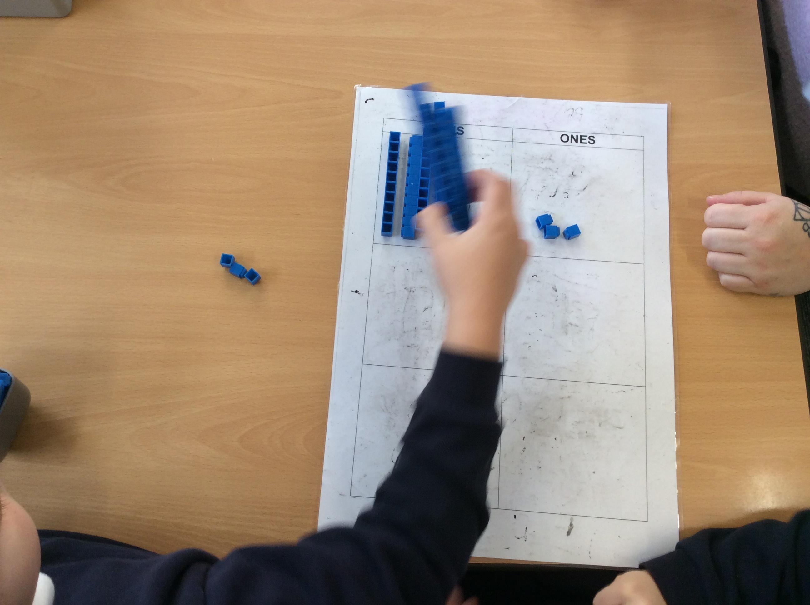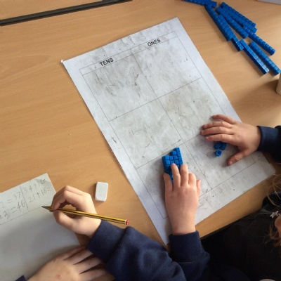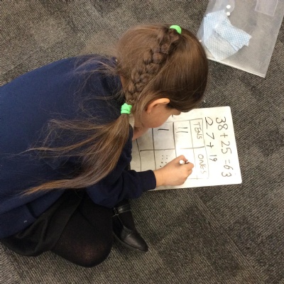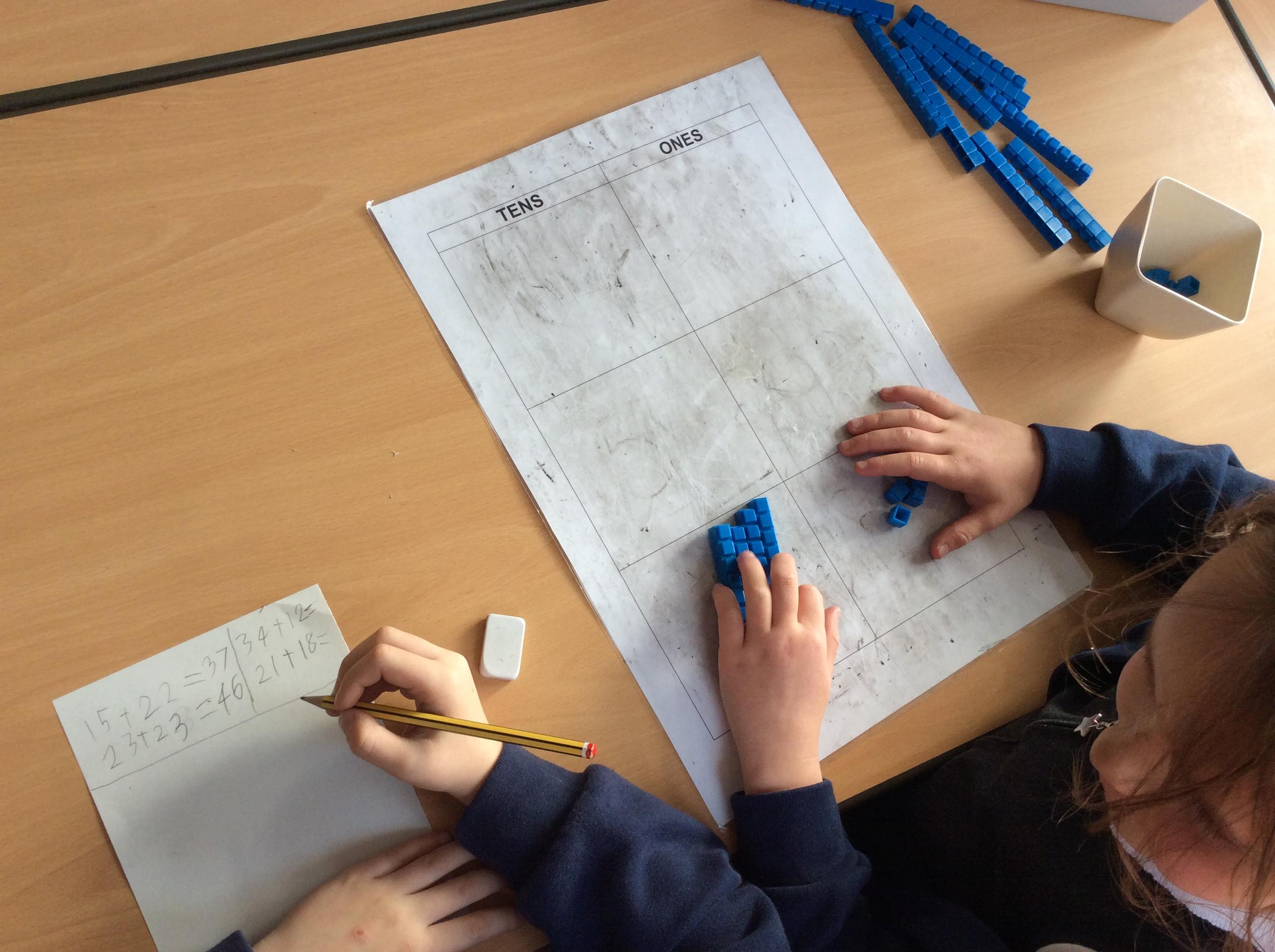 The children were using dienes to begin adding a 1-digit number to 2-digit number crossing over 10, 38+7=45. They used their knowledge of number bonds to 10 to help them.