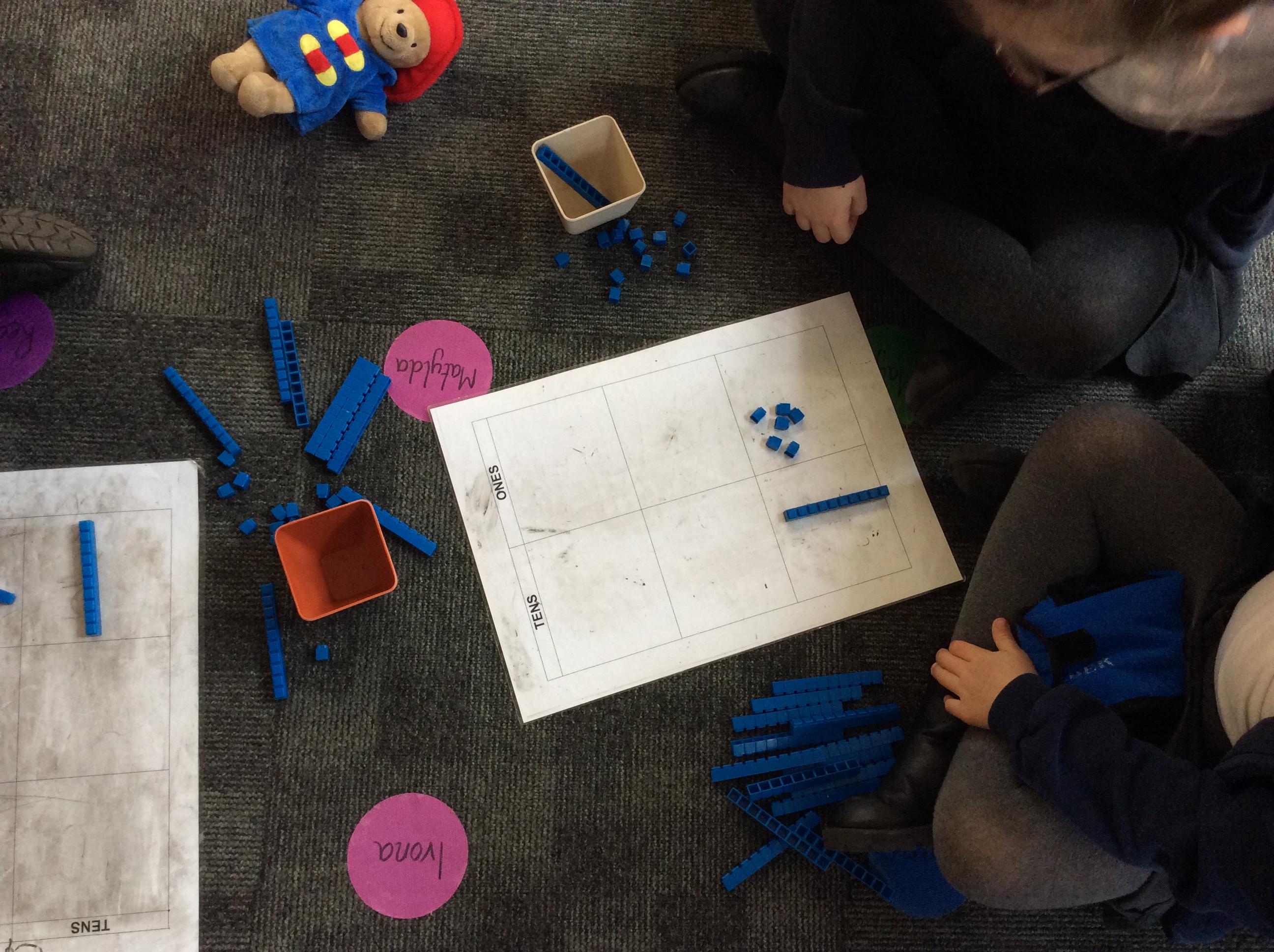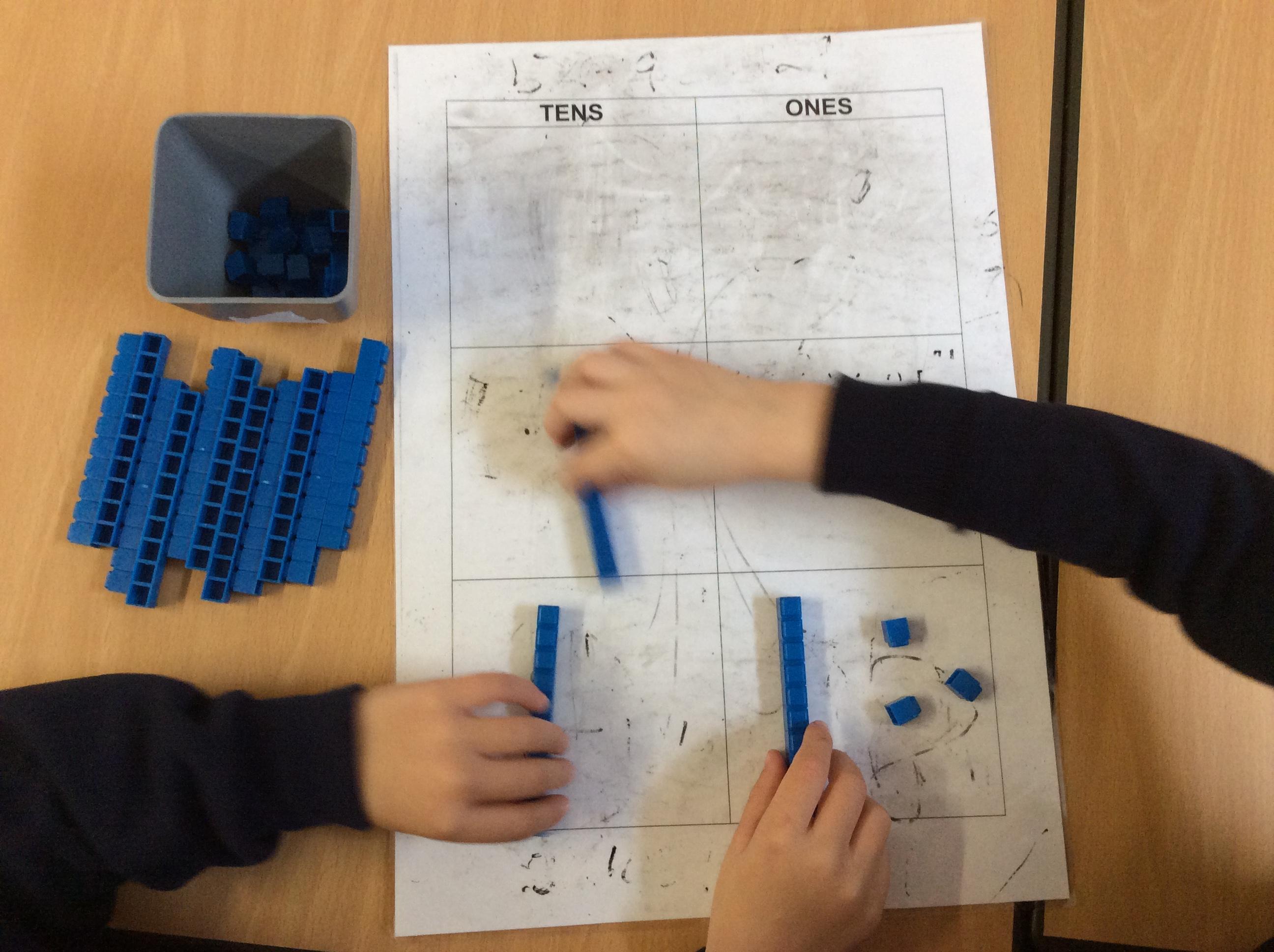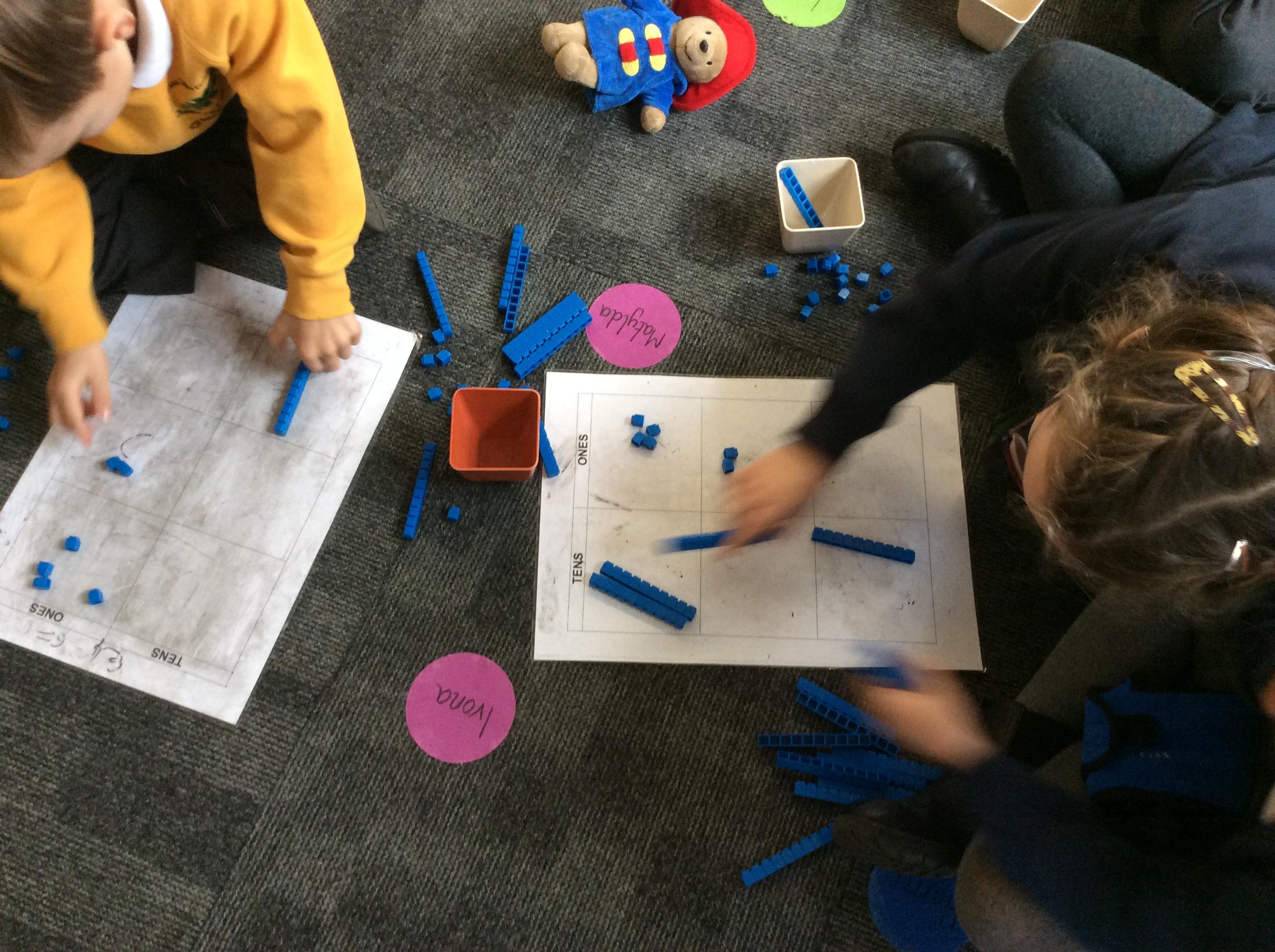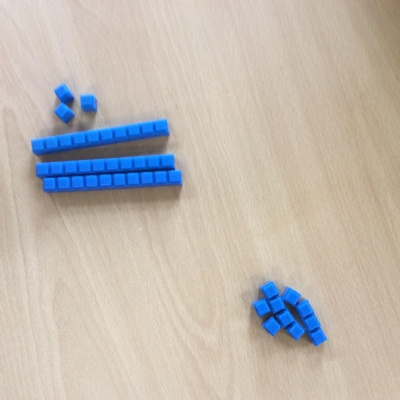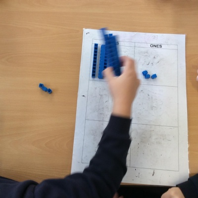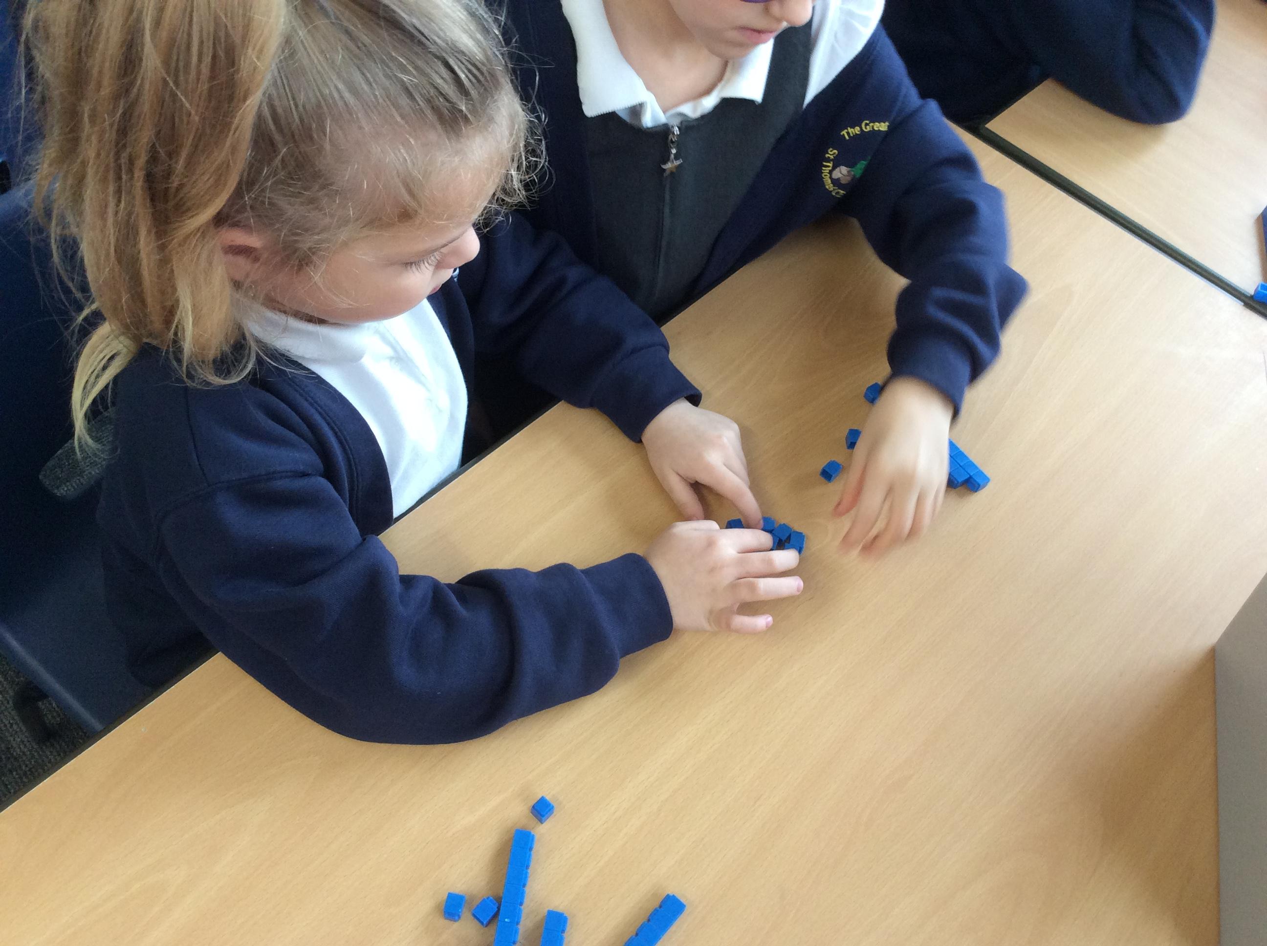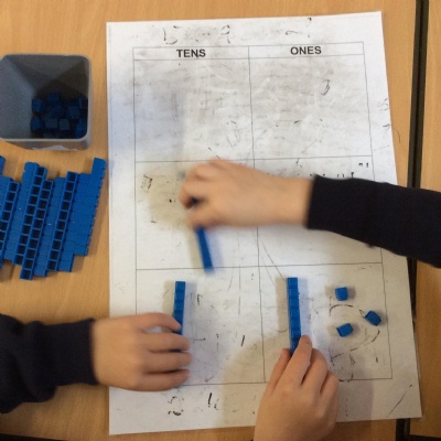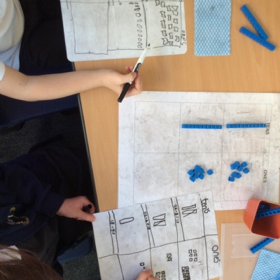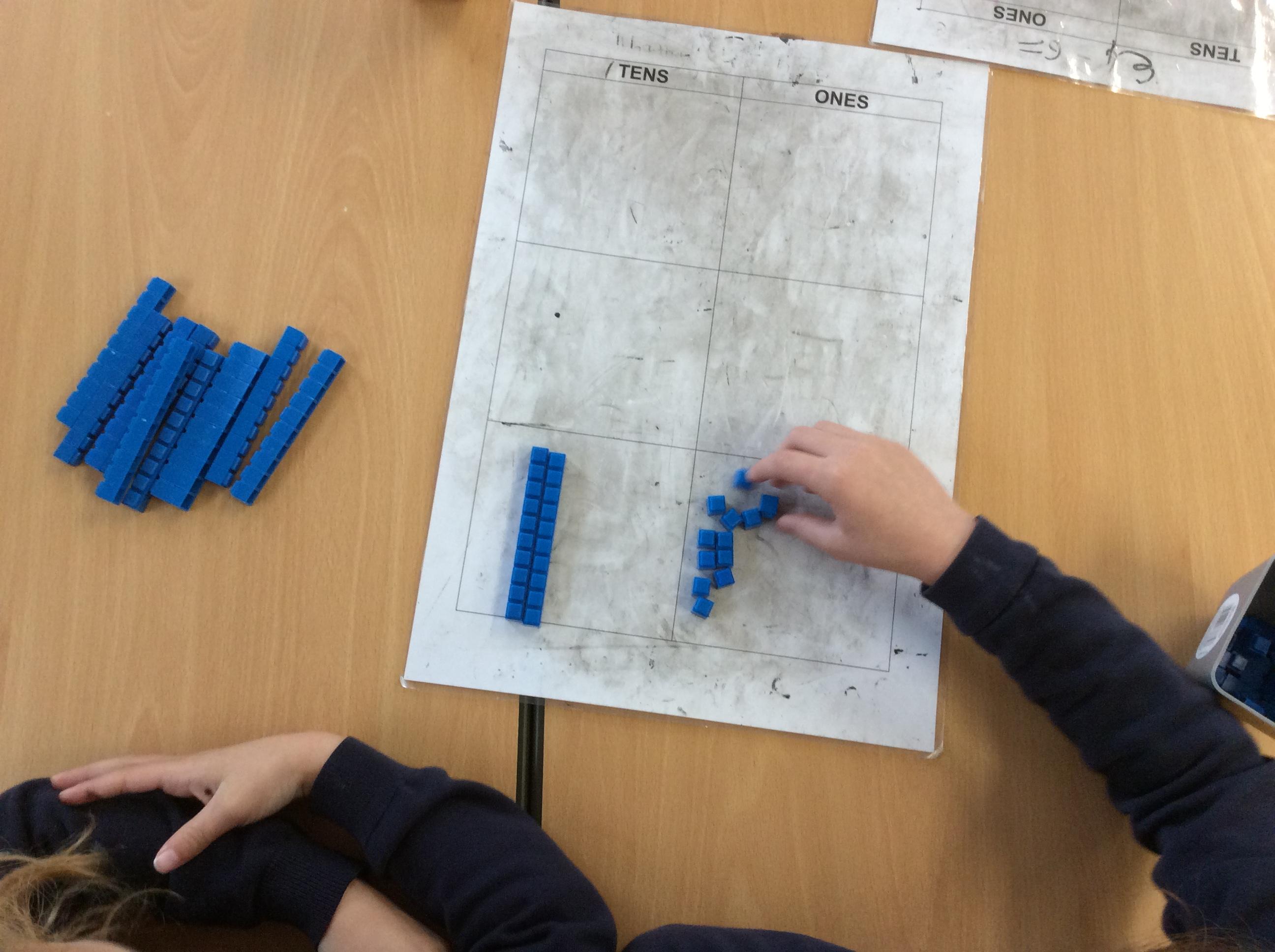 The children were using dienes to begin adding a 1-digit number to 2-digit number crossing over 10, 38+7=45. They used their knowledge of number bonds to 10 to help them.