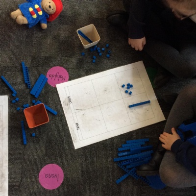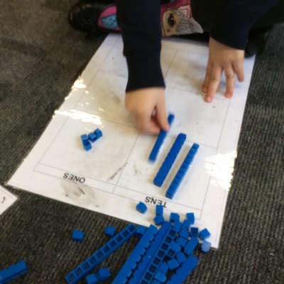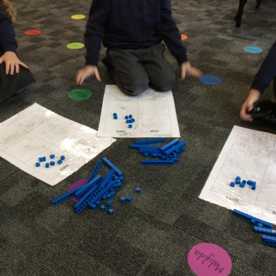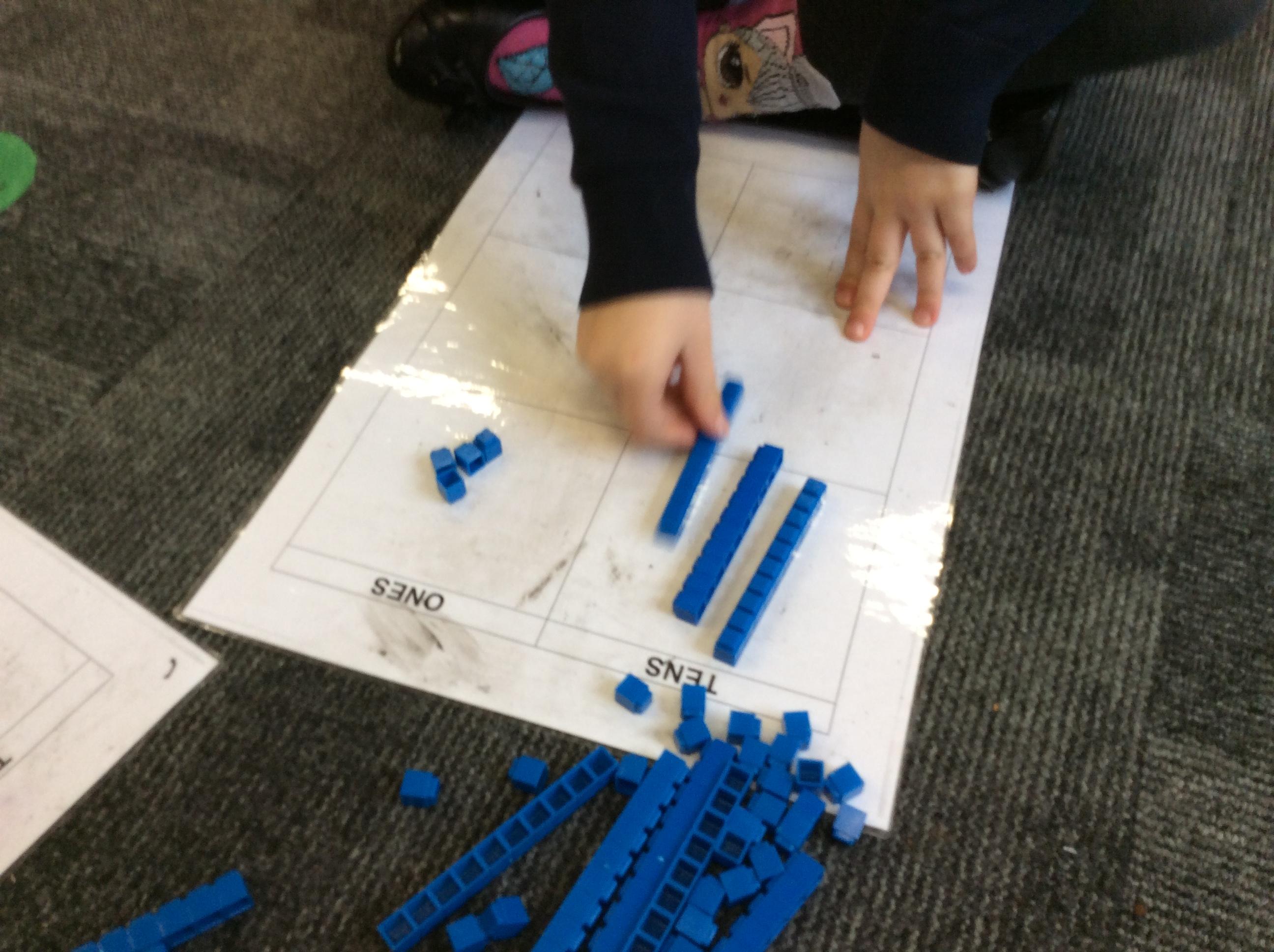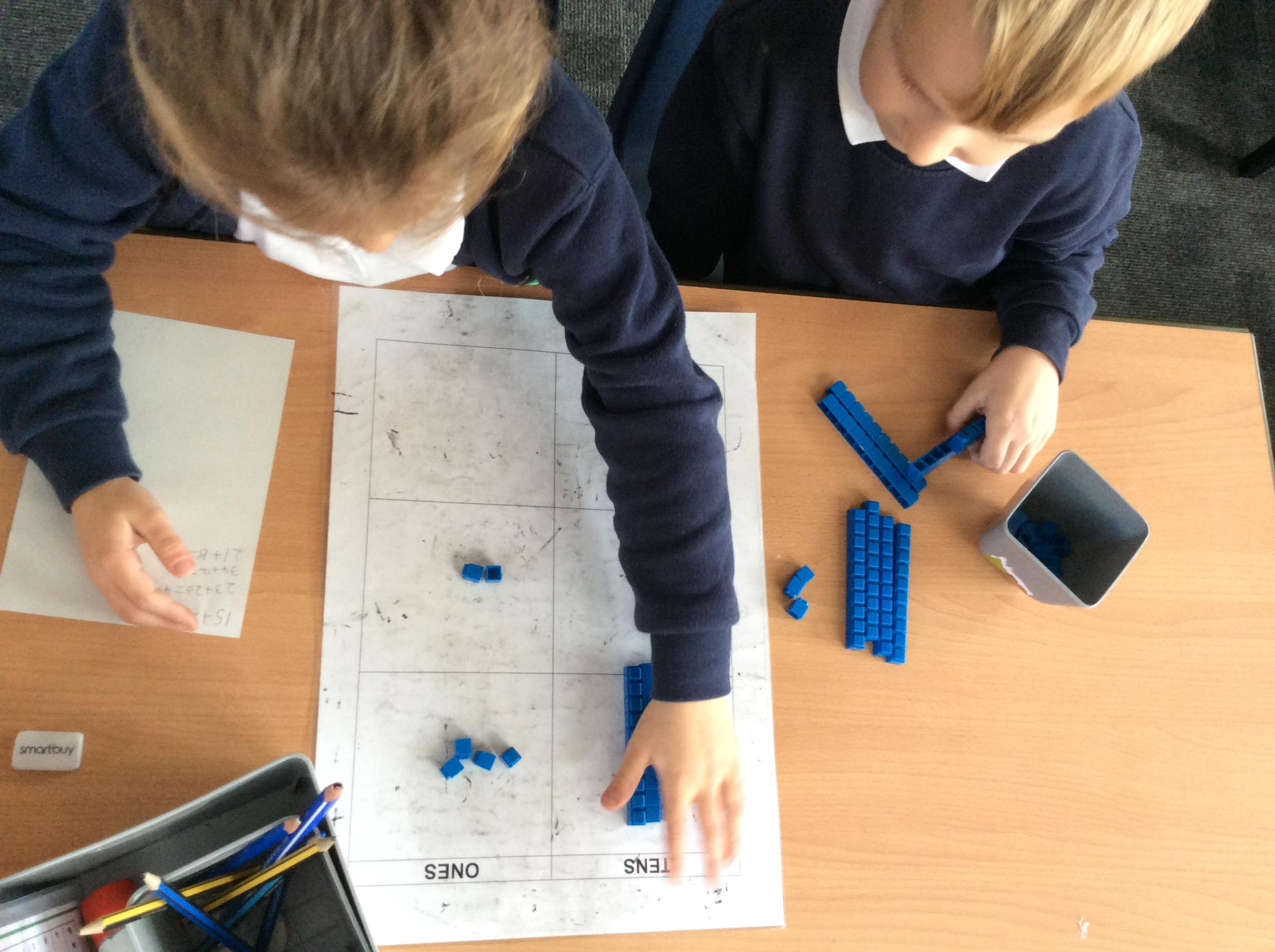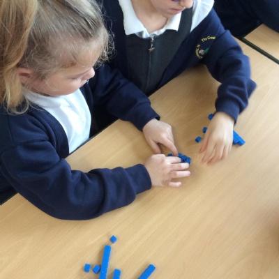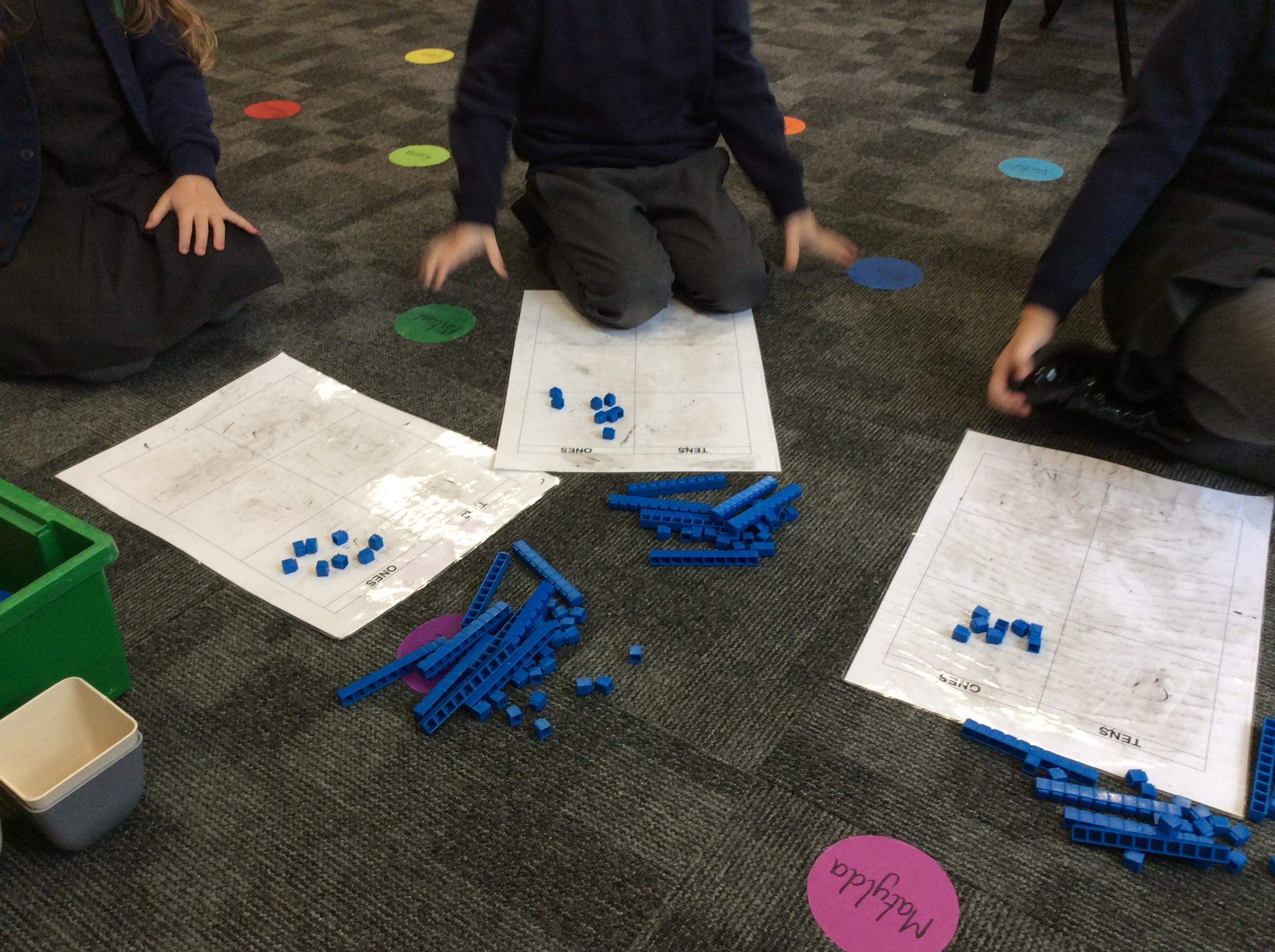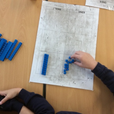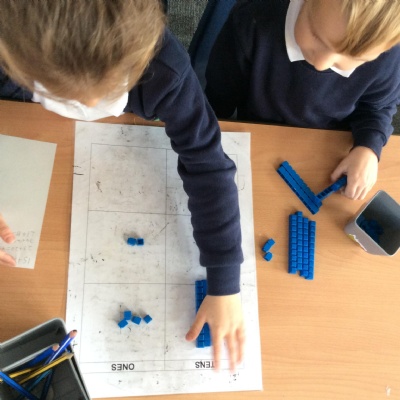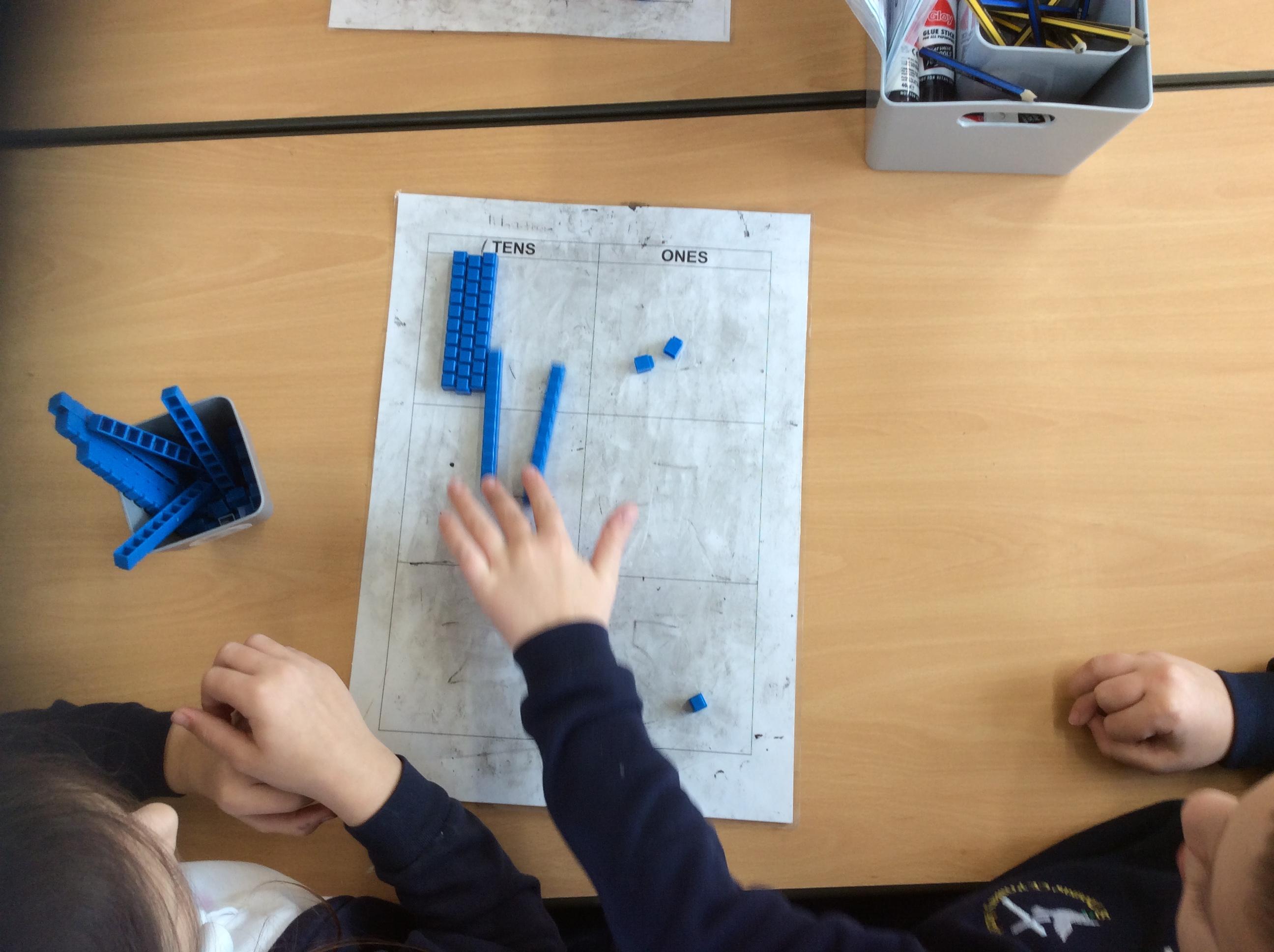 The children were using dienes to begin adding a 1-digit number to 2-digit number crossing over 10, 38+7=45. They used their knowledge of number bonds to 10 to help them.
