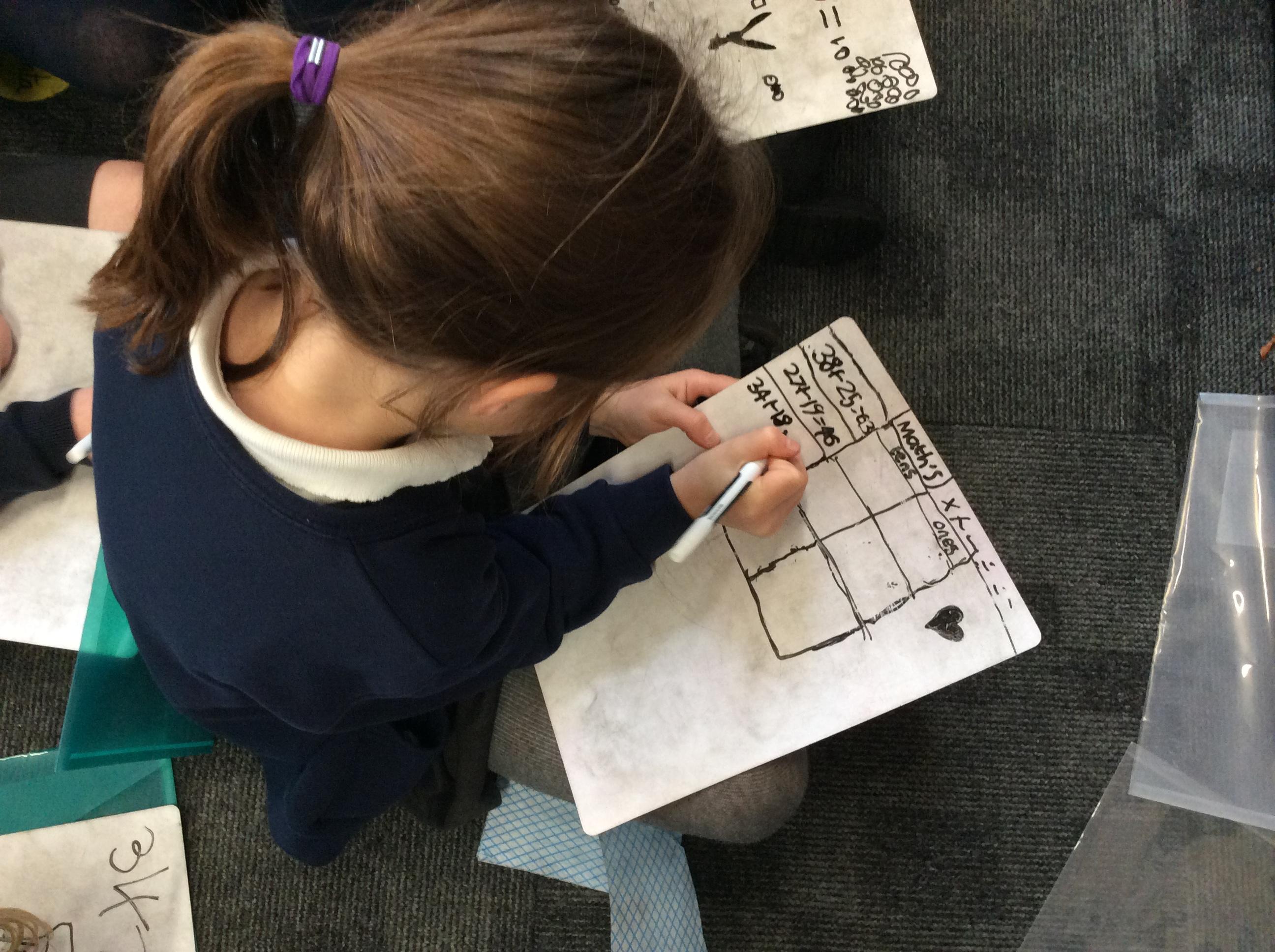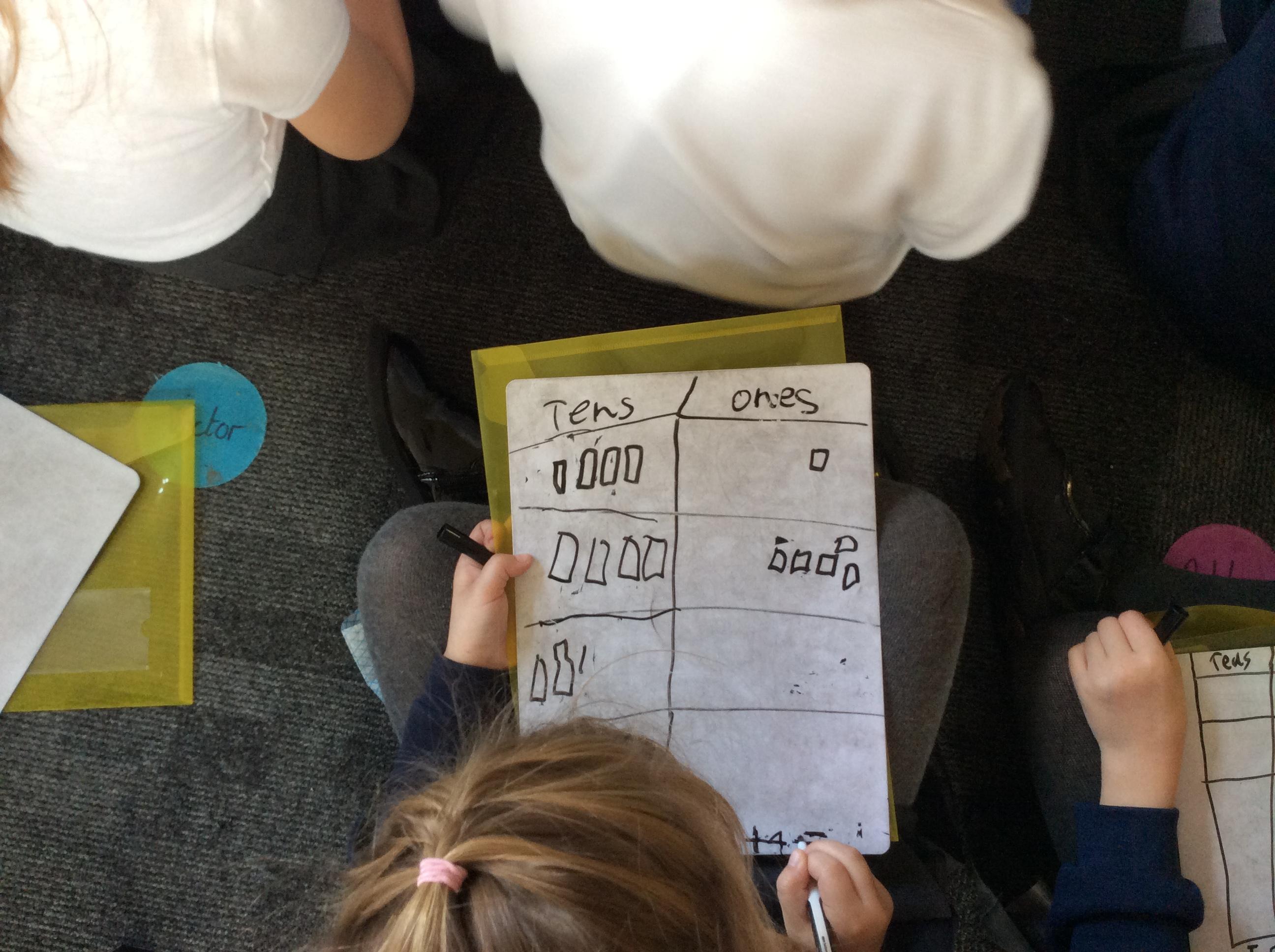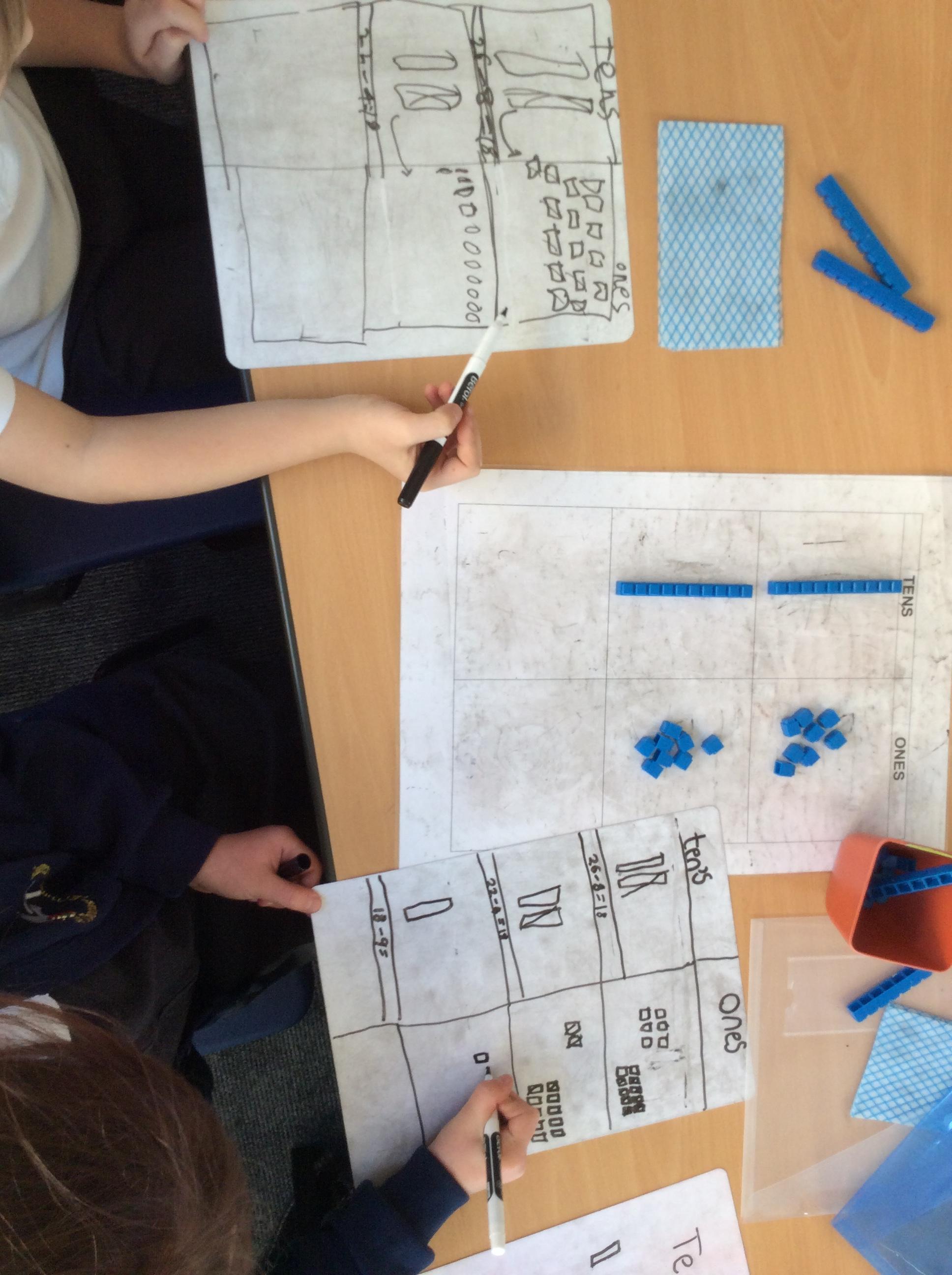 In Maths this week the children have been working on adding two 2-digit numbers crossing ten (for example 26 + 17 =). The children have practiced using dienes to help them visually see that they needed to exchange 10 ones for 1 ten and then moved on to drawing dienes.