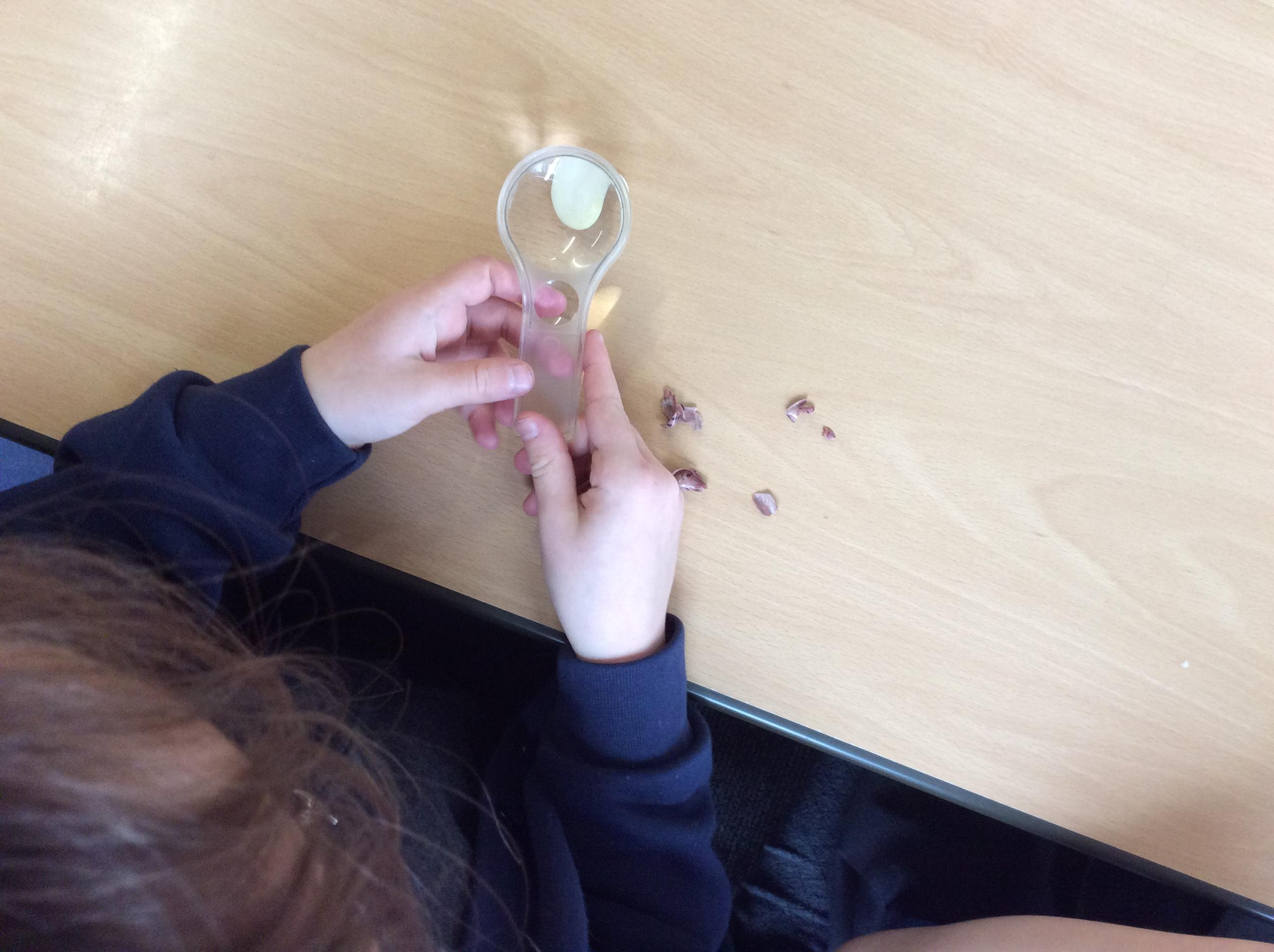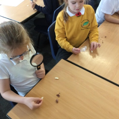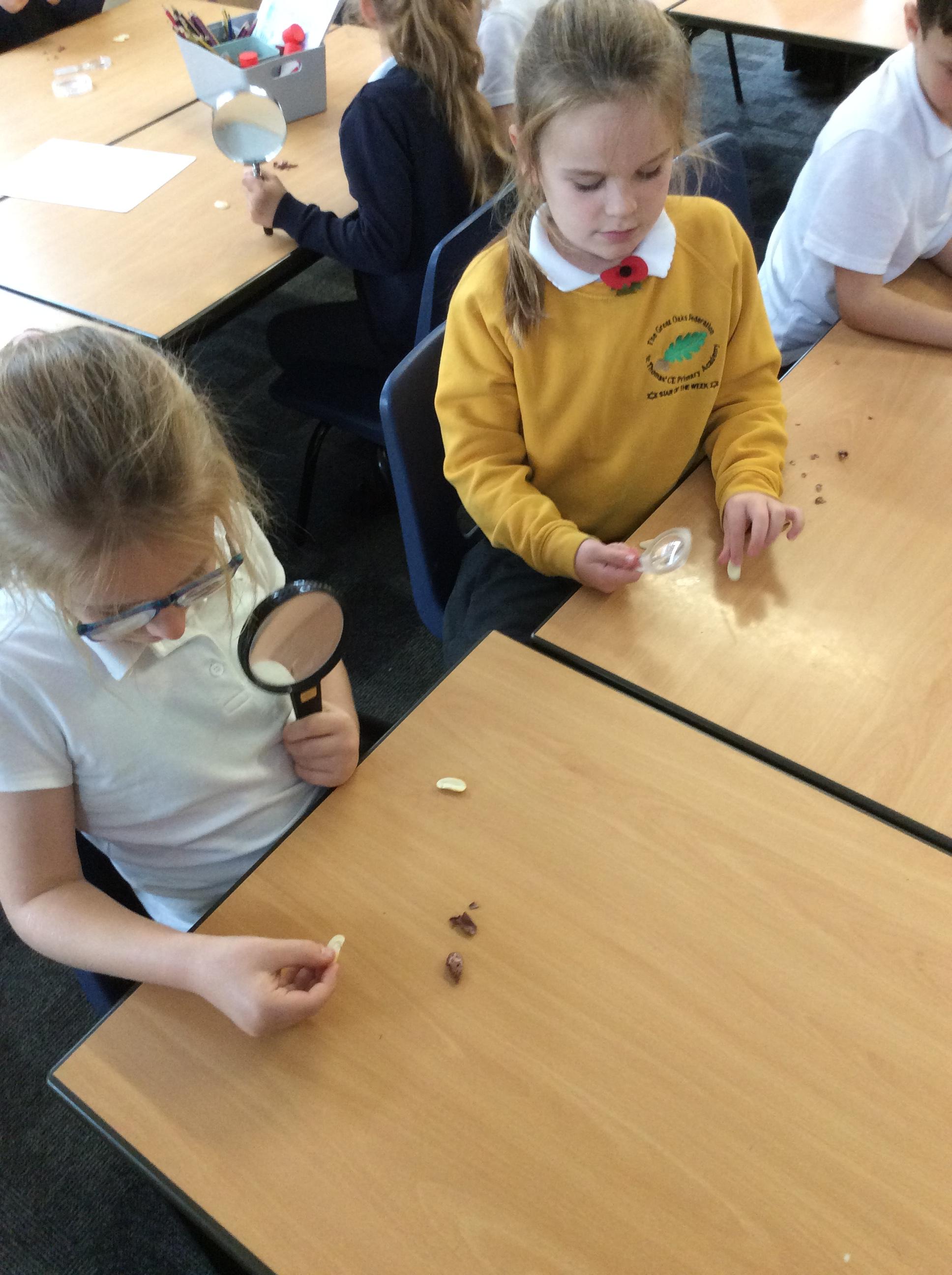 In Science this week we explored seeds and what is inside of them. After allowing some seeds to soak in water, we were able to pick off the seed coat (that helps to protect the seed), split the seed into two and look carefully at the baby plant and food store within using a magnifying glasses.