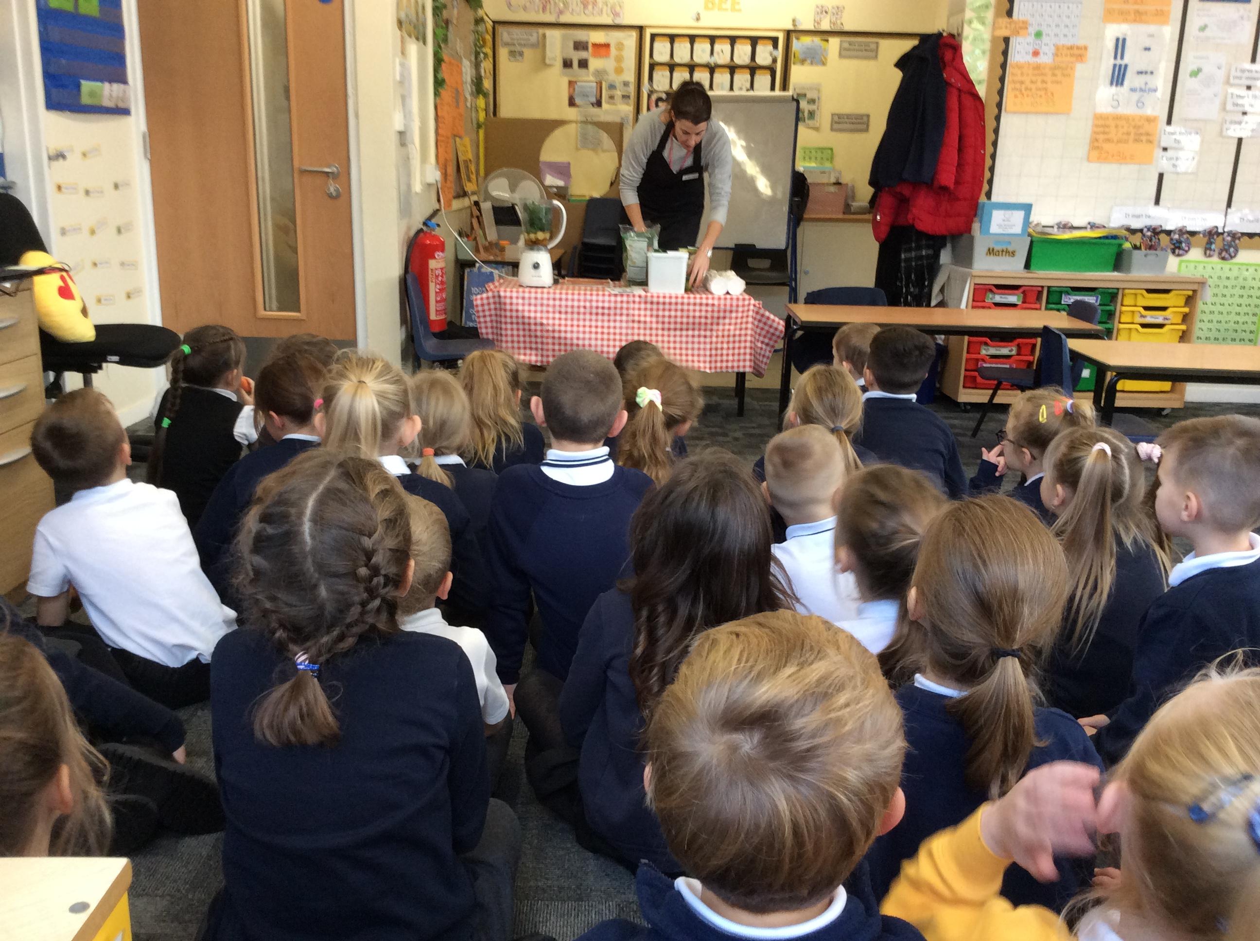Tuesday morning the children were lucky to be visited by Helen from Willoughby Foods, to talk to them about healthy eating and make them a smoothie to try. With the support of Helen, the children created five healthy lunches, being careful to ensure that it was well balanced and fruit and vegetables were included in every meal.