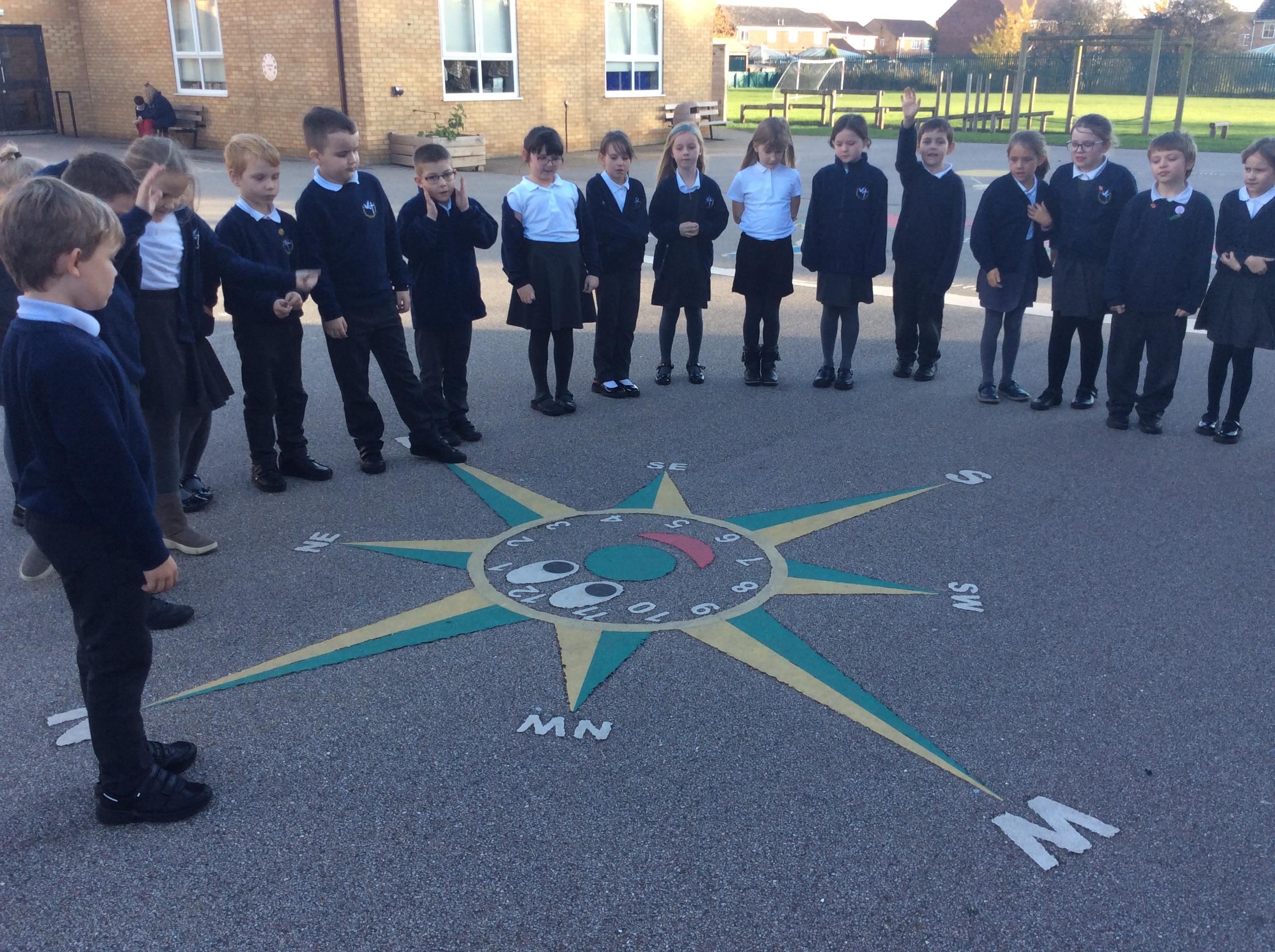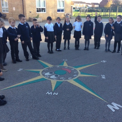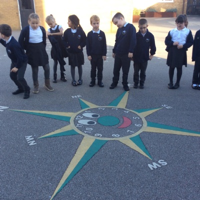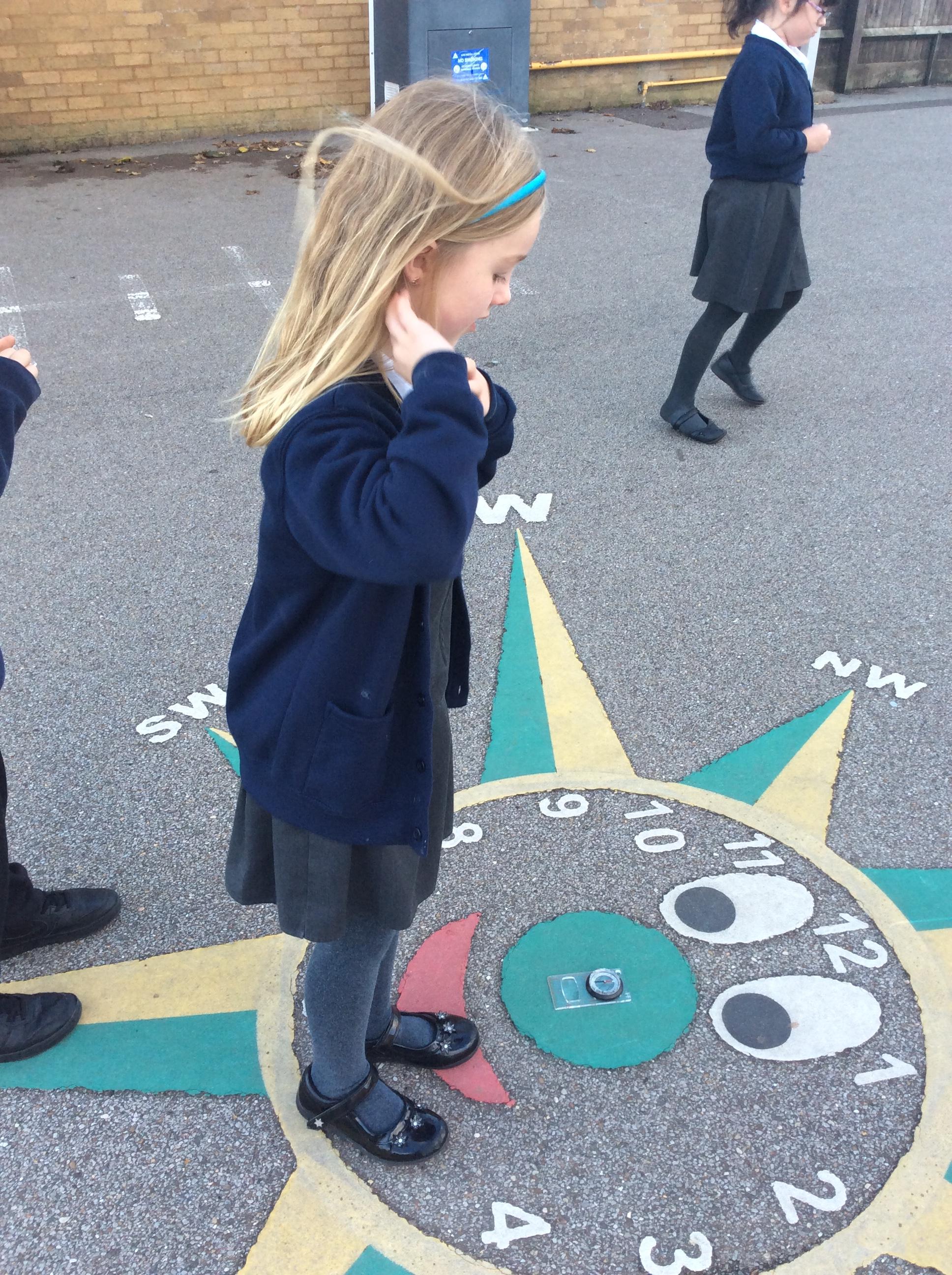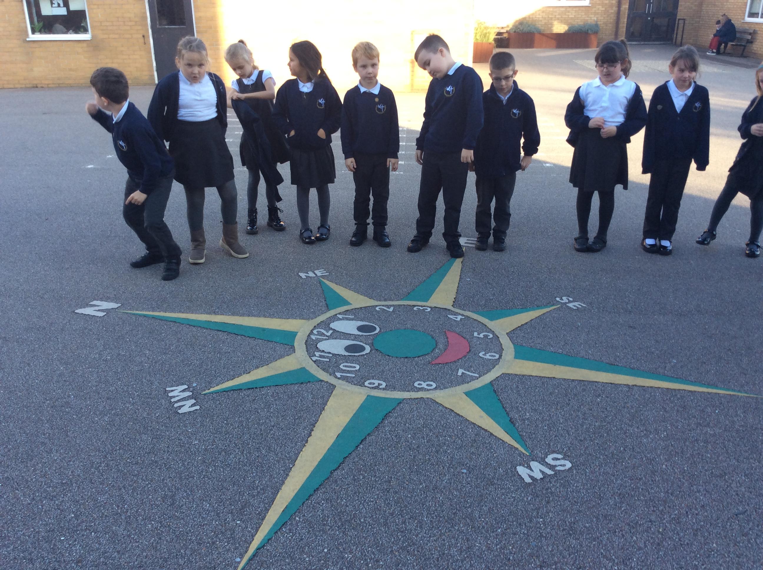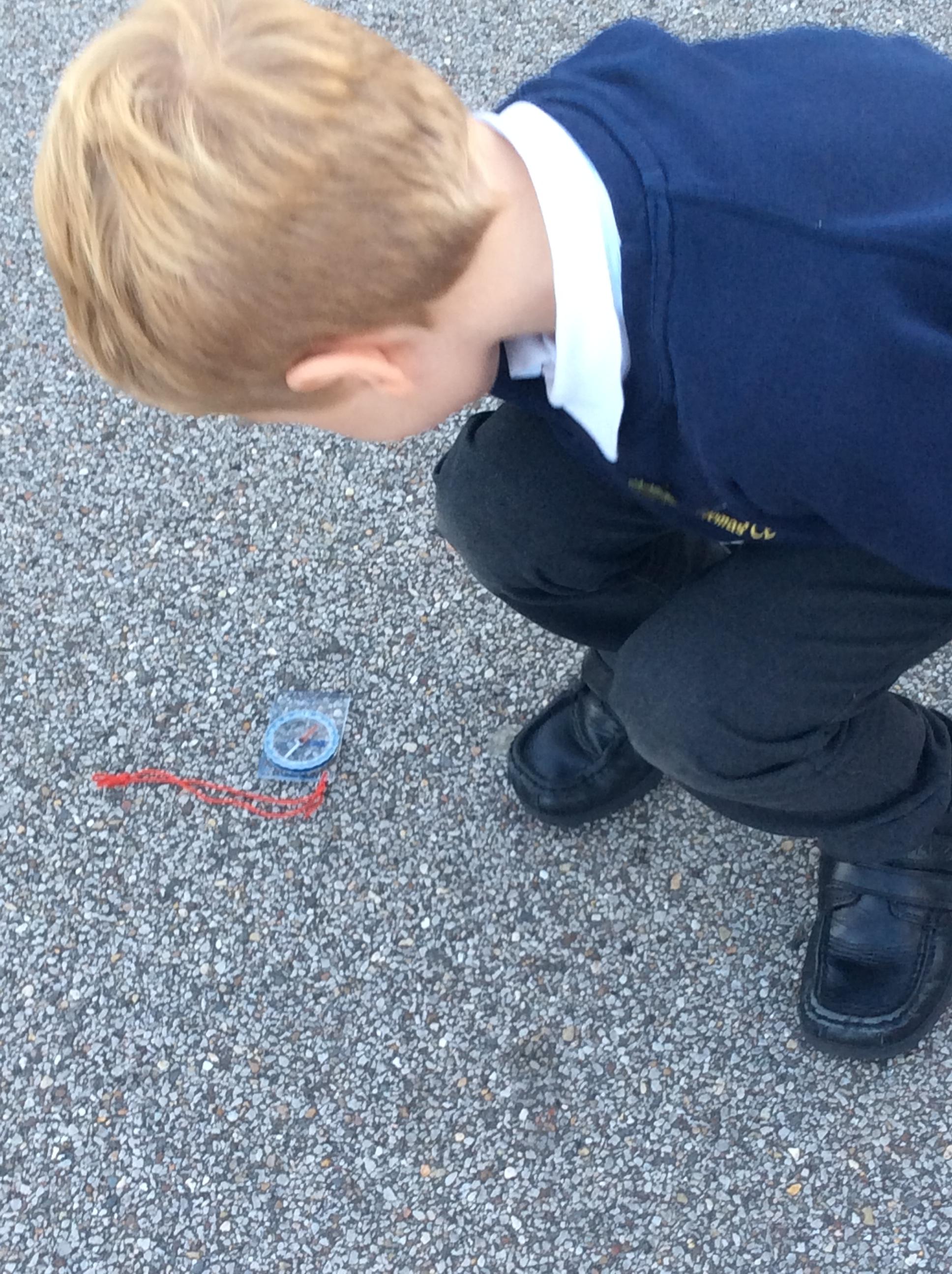 Retrieval of the four points of the compass was then built up on by learning the points in between. We now know the eight points of the compass. Outside, we were able to use the compass on the playground to consolidate the knowledge and use real compass to see if we could move in different directions.