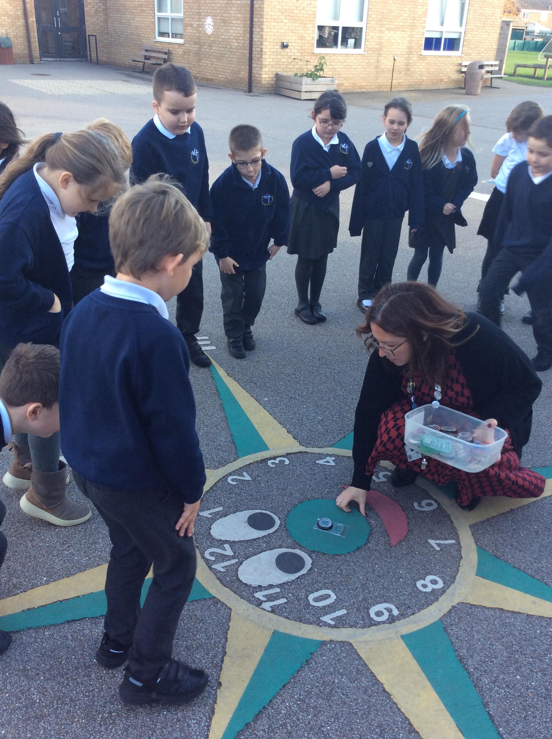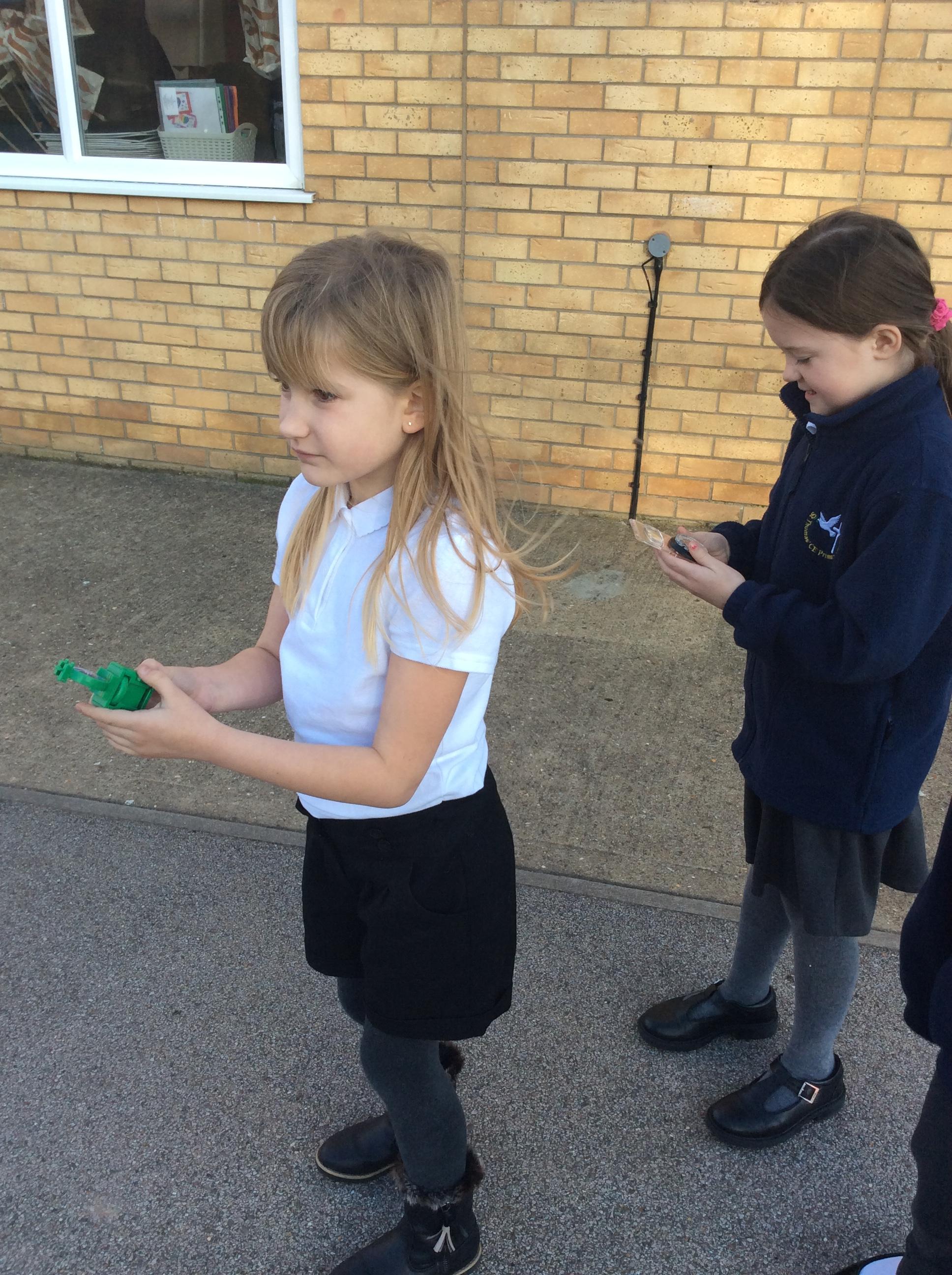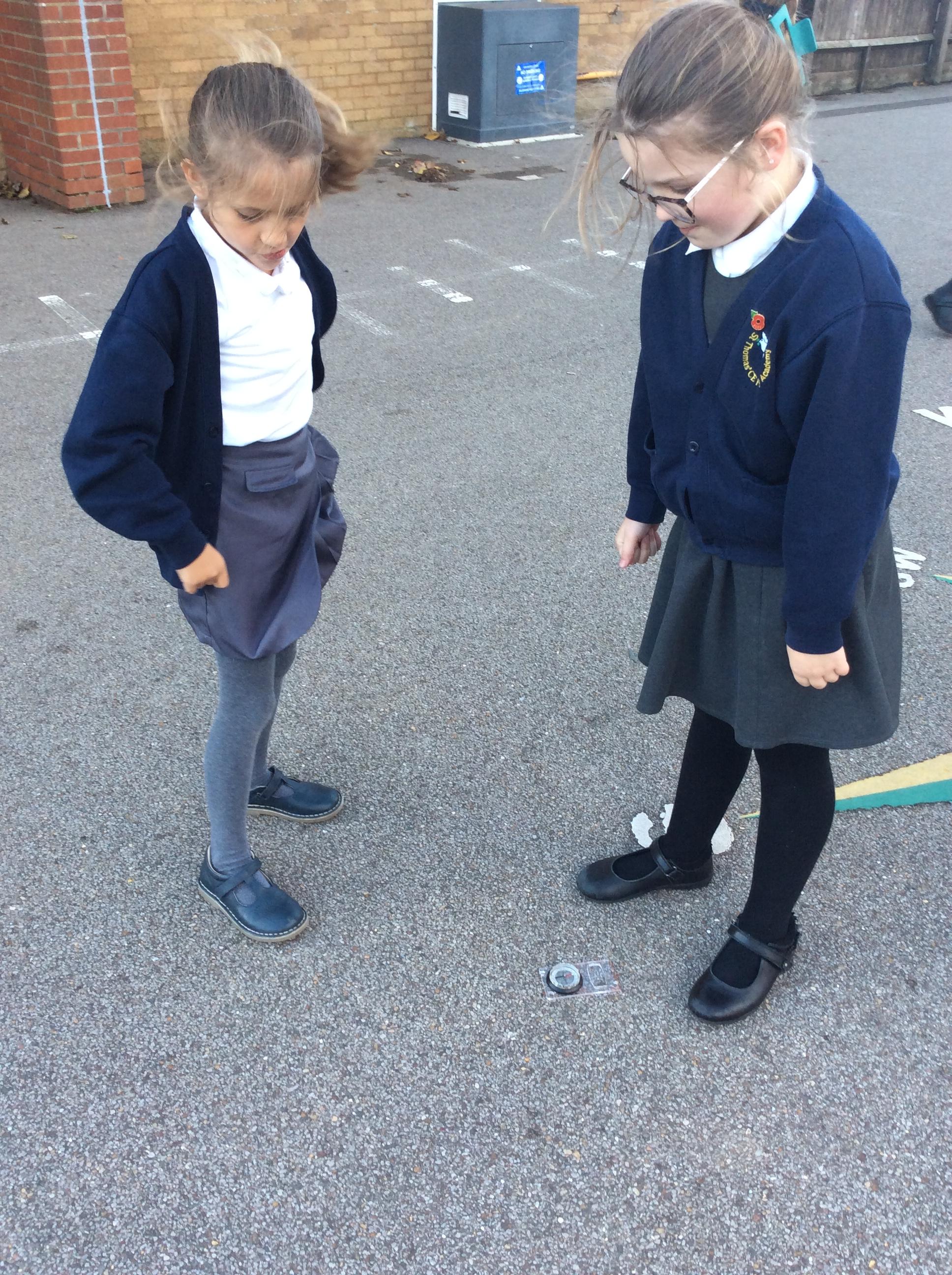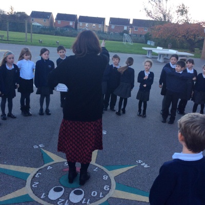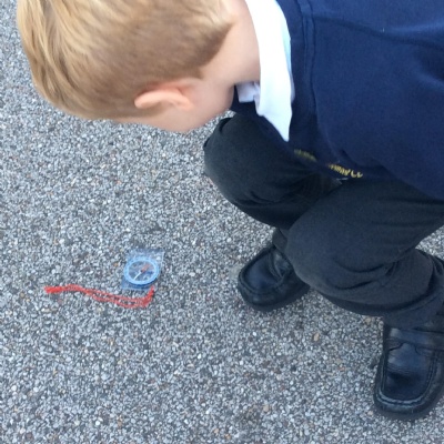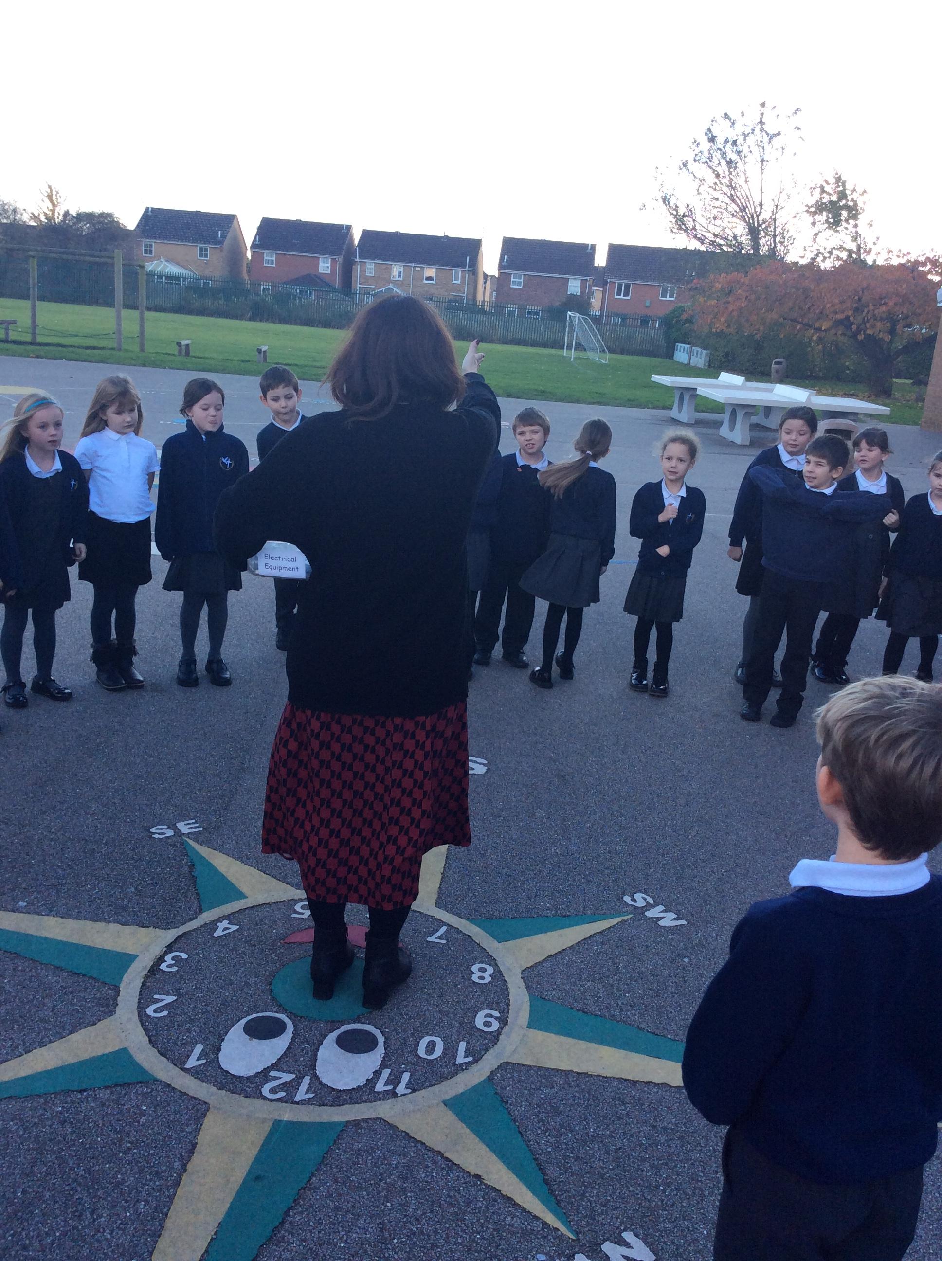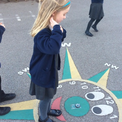 Retrieval of the four points of the compass was then built up on by learning the points in between. We now know the eight points of the compass. Outside, we were able to use the compass on the playground to consolidate the knowledge and use real compass to see if we could move in different directions.