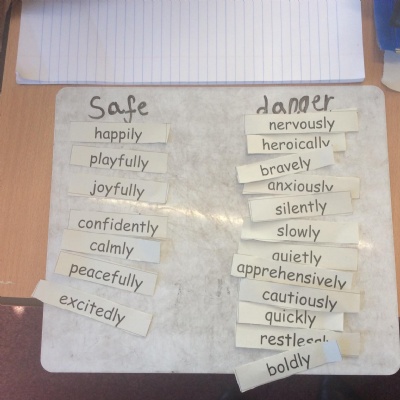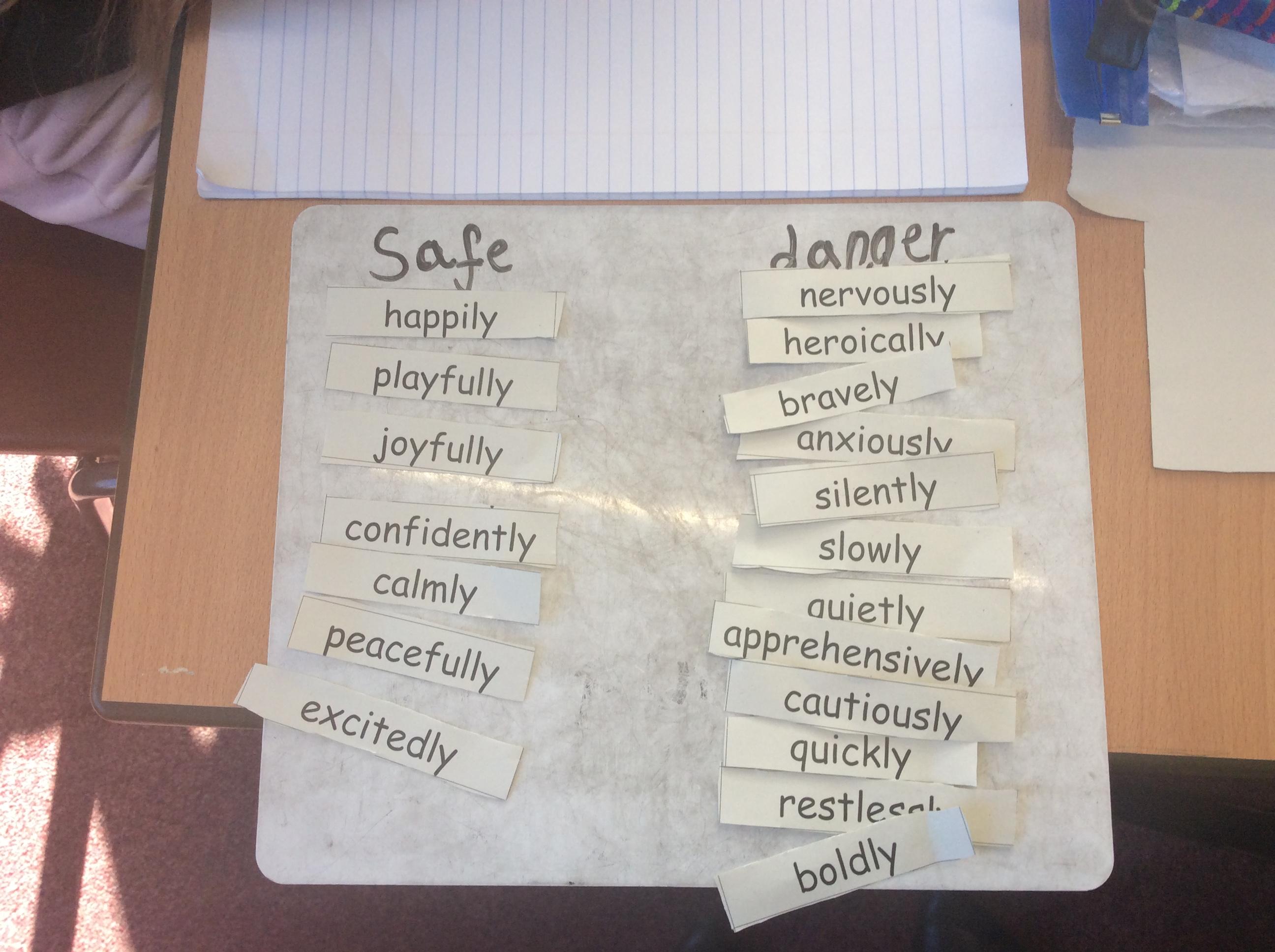 Reading adverbs we discussed which would be suitable to use in a safe situation and which when we were in danger.
