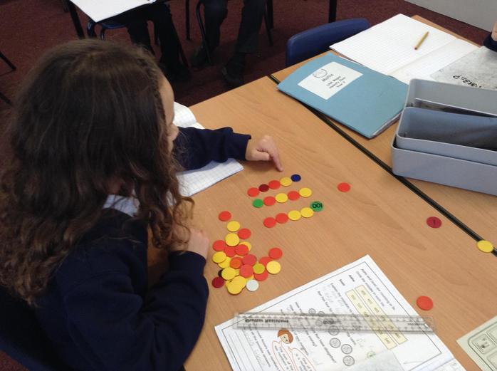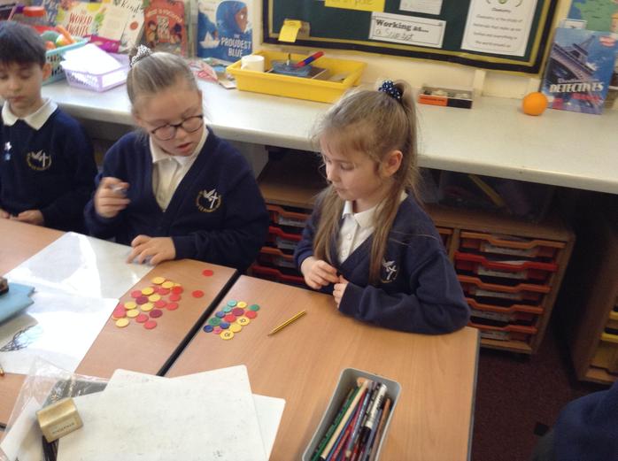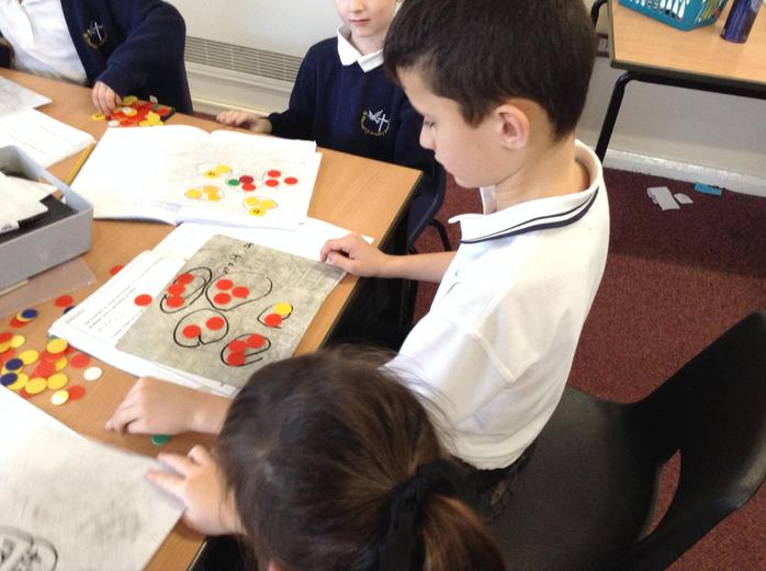 To support the children with counting in 3s and understanding repeating addition, arrays and multiplication, the children used the counters to show the calculation.