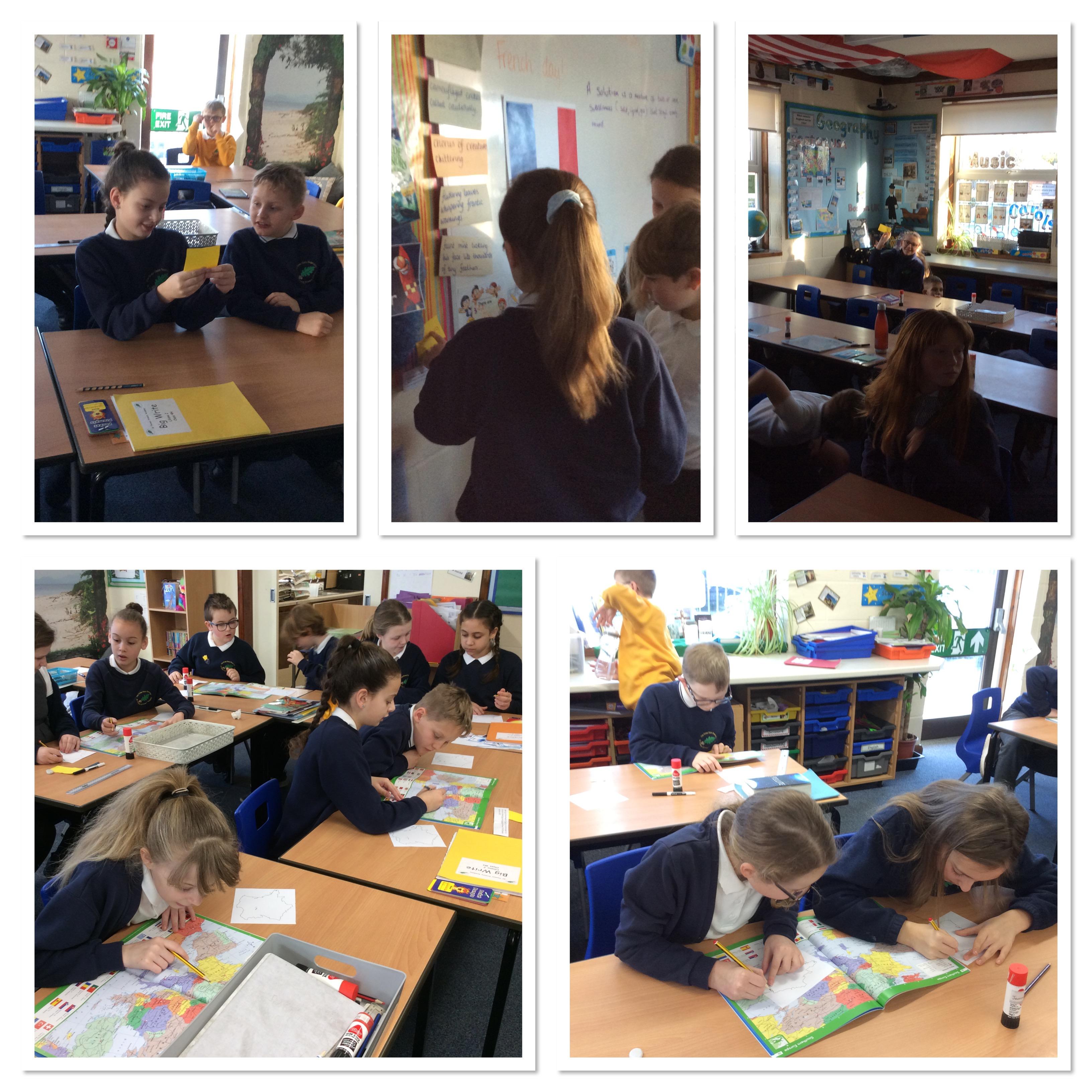 There was an excited response when French Day was announced. First we compared English to French towns, then watched a video clip about of a child talking about their life in Marseilles. We compared her way of life to ours. After this, we were excited to look under the desks to find names of towns in France. We had to match these cards to information about each town that was up on the walls of the classroom and then share the facts with the class. We located each town using atlases.