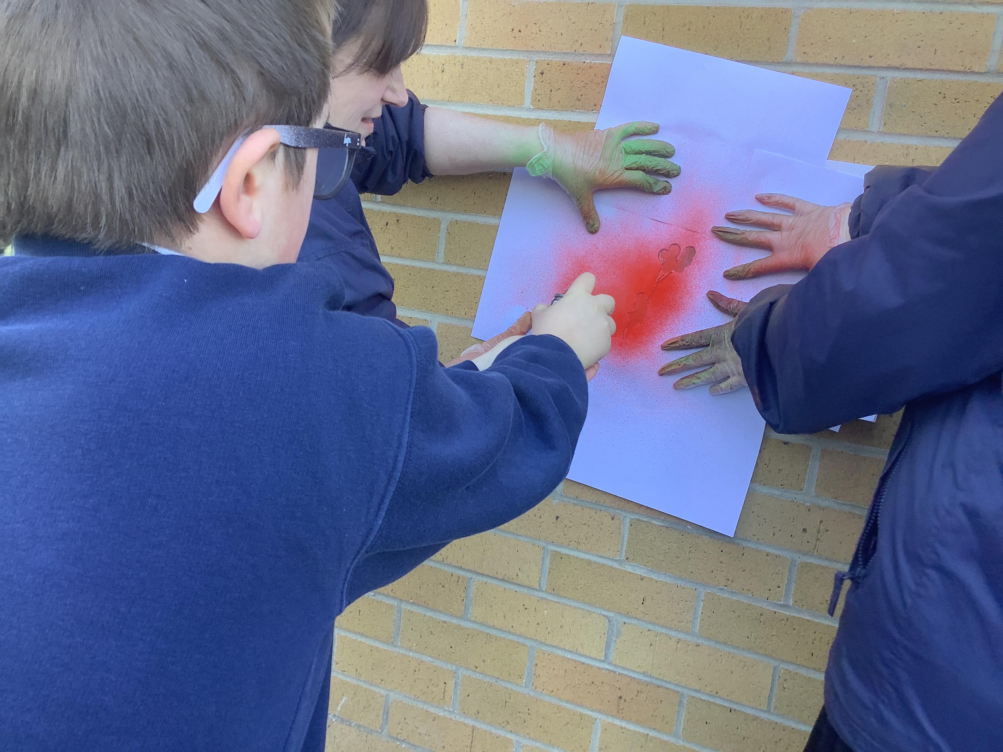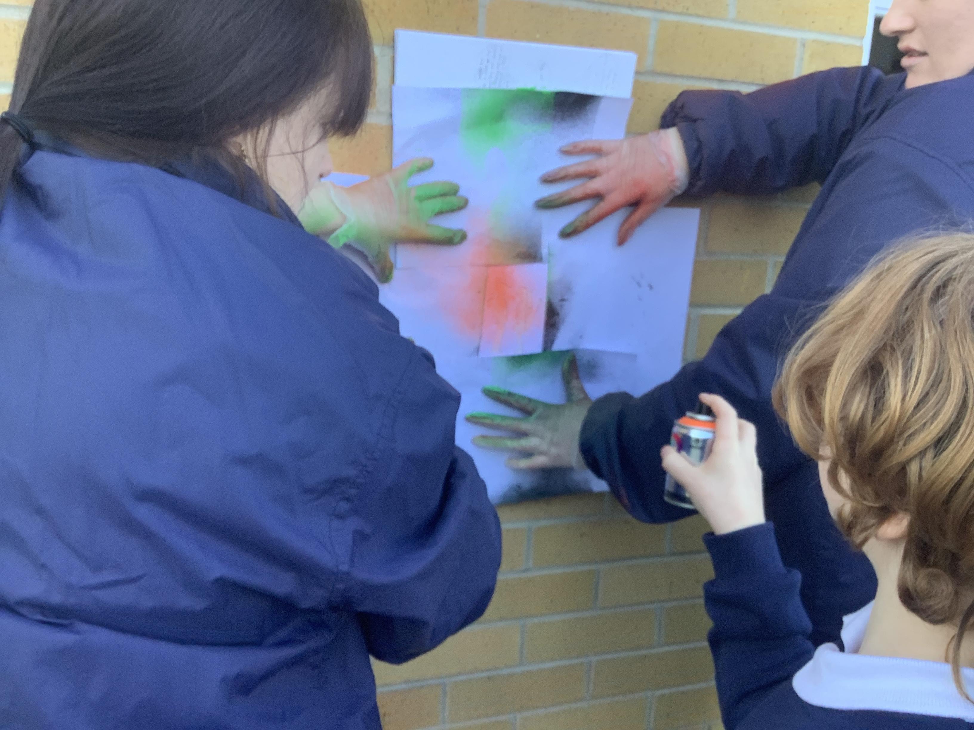 The joy on these faces as they embraced their inner Banksy! After designing a background and a stencil, the last part was to spray paint to create the final piece.
