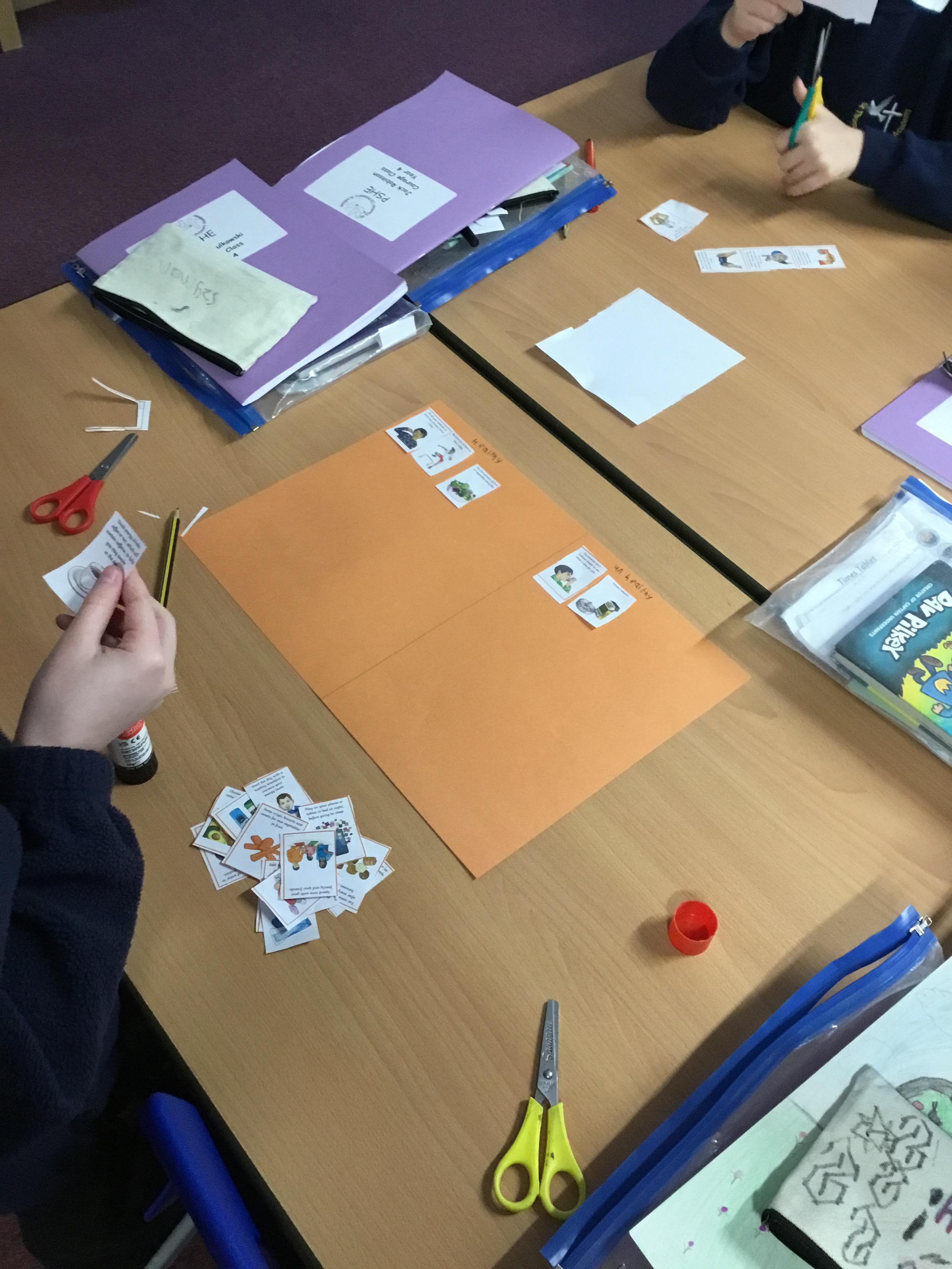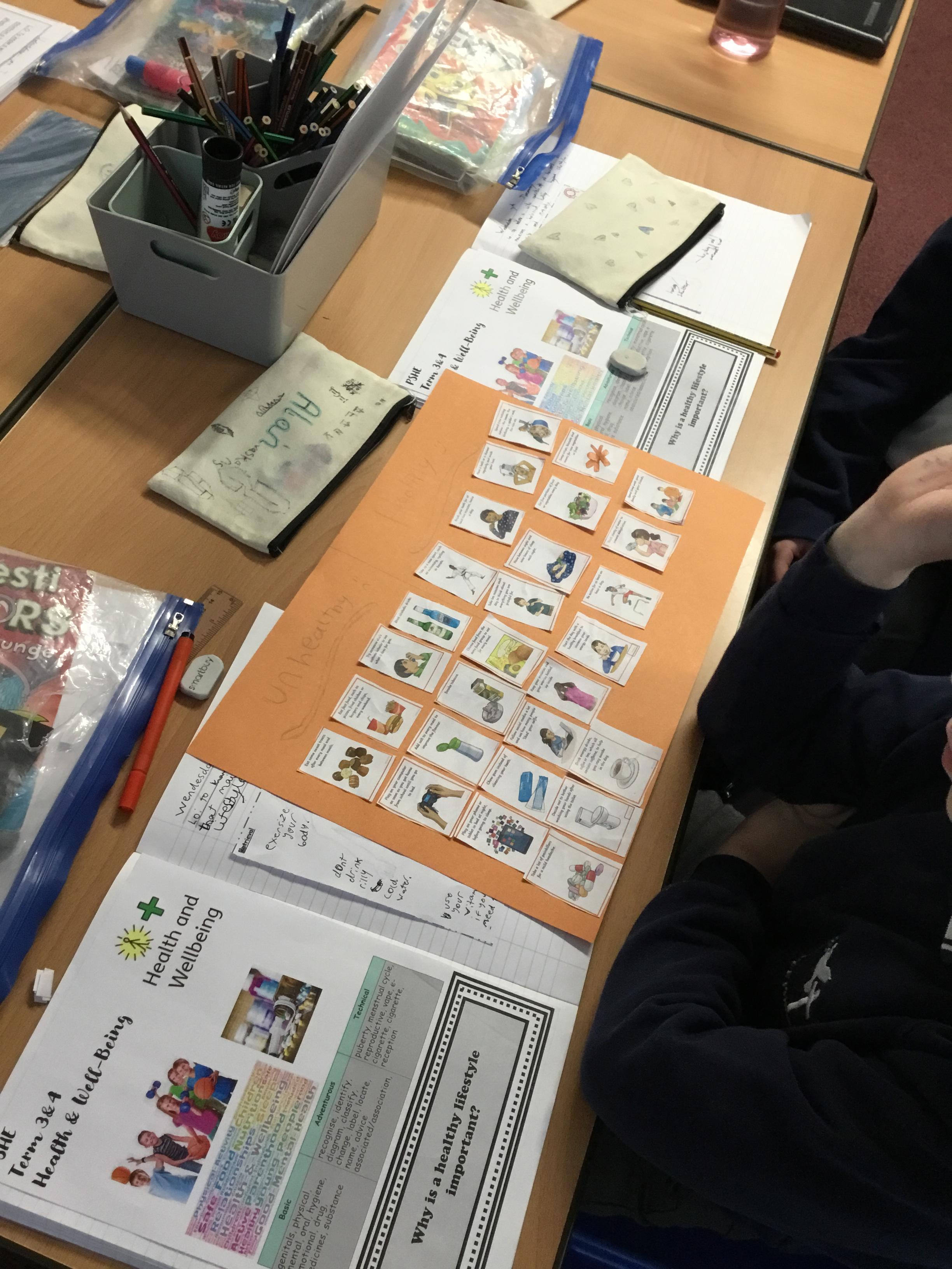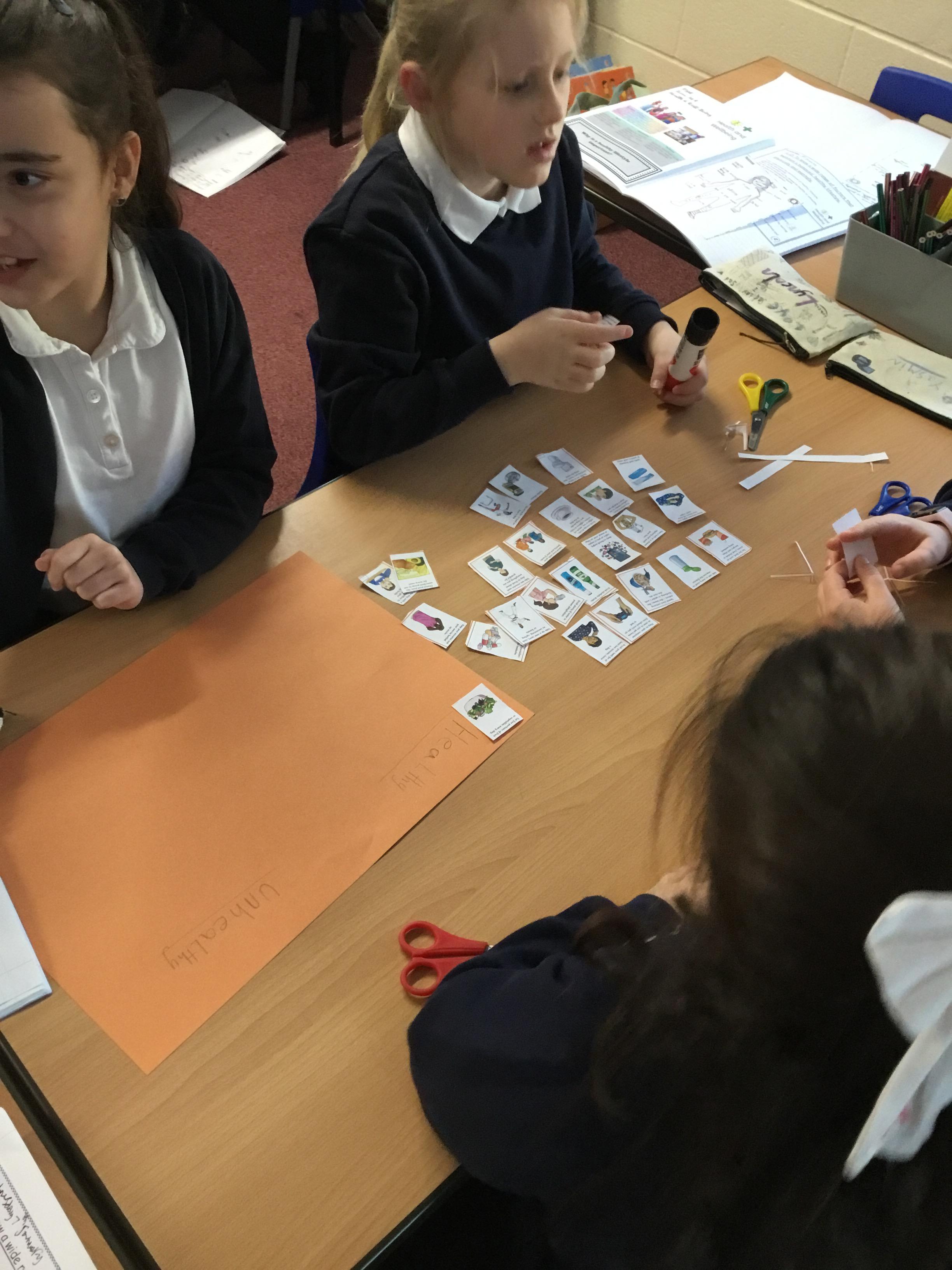 in small groups, we sorted through different images and cue cards deciding if these were healthy or unhealthy for us.