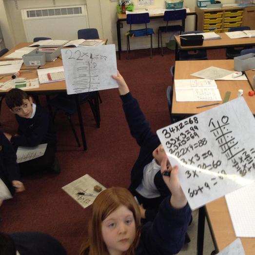 The children have used base ten and pictorial representations to show how to multiply. They have had to practise and rehearse to secure their understanding. Great resilience shown.