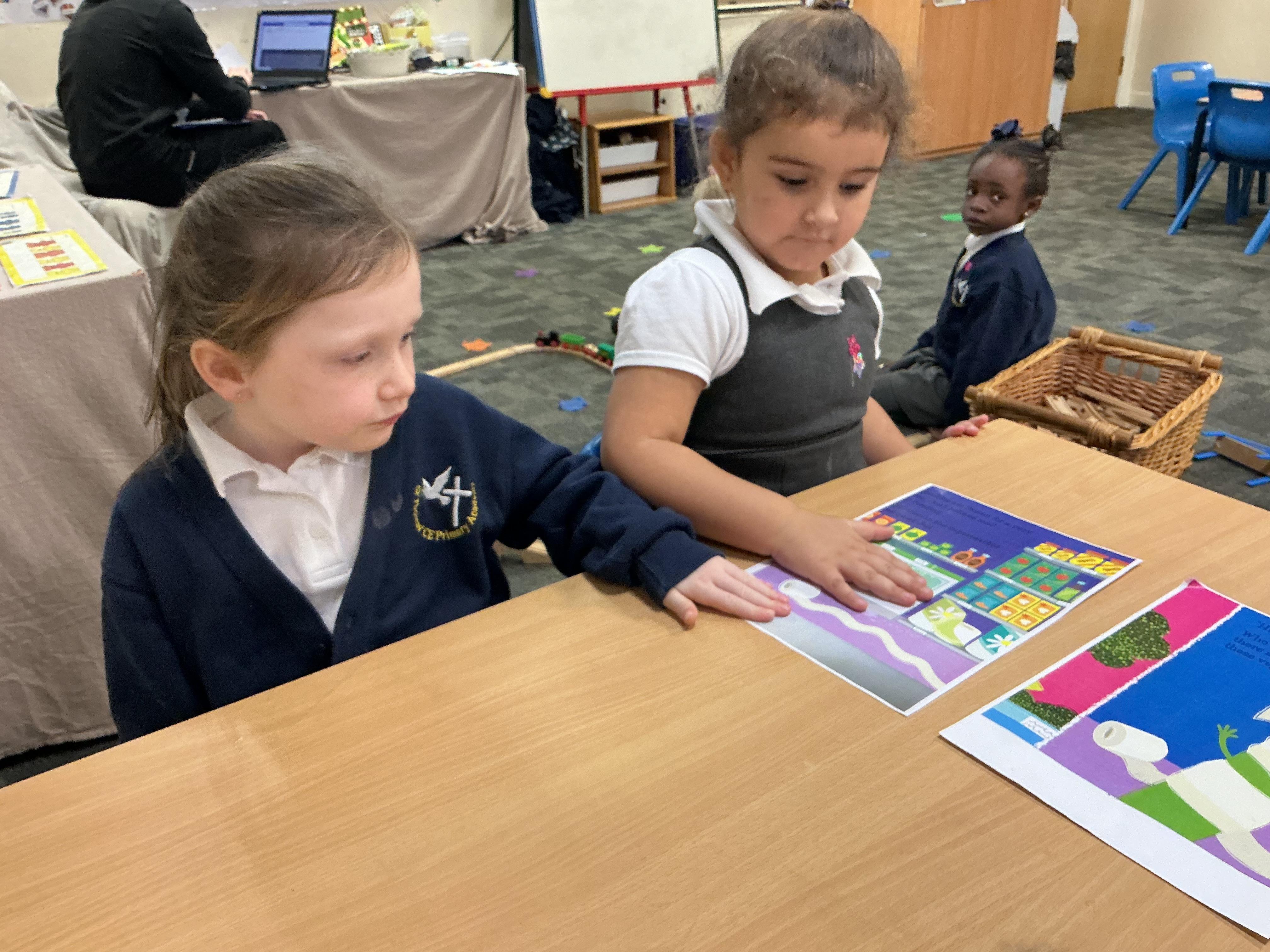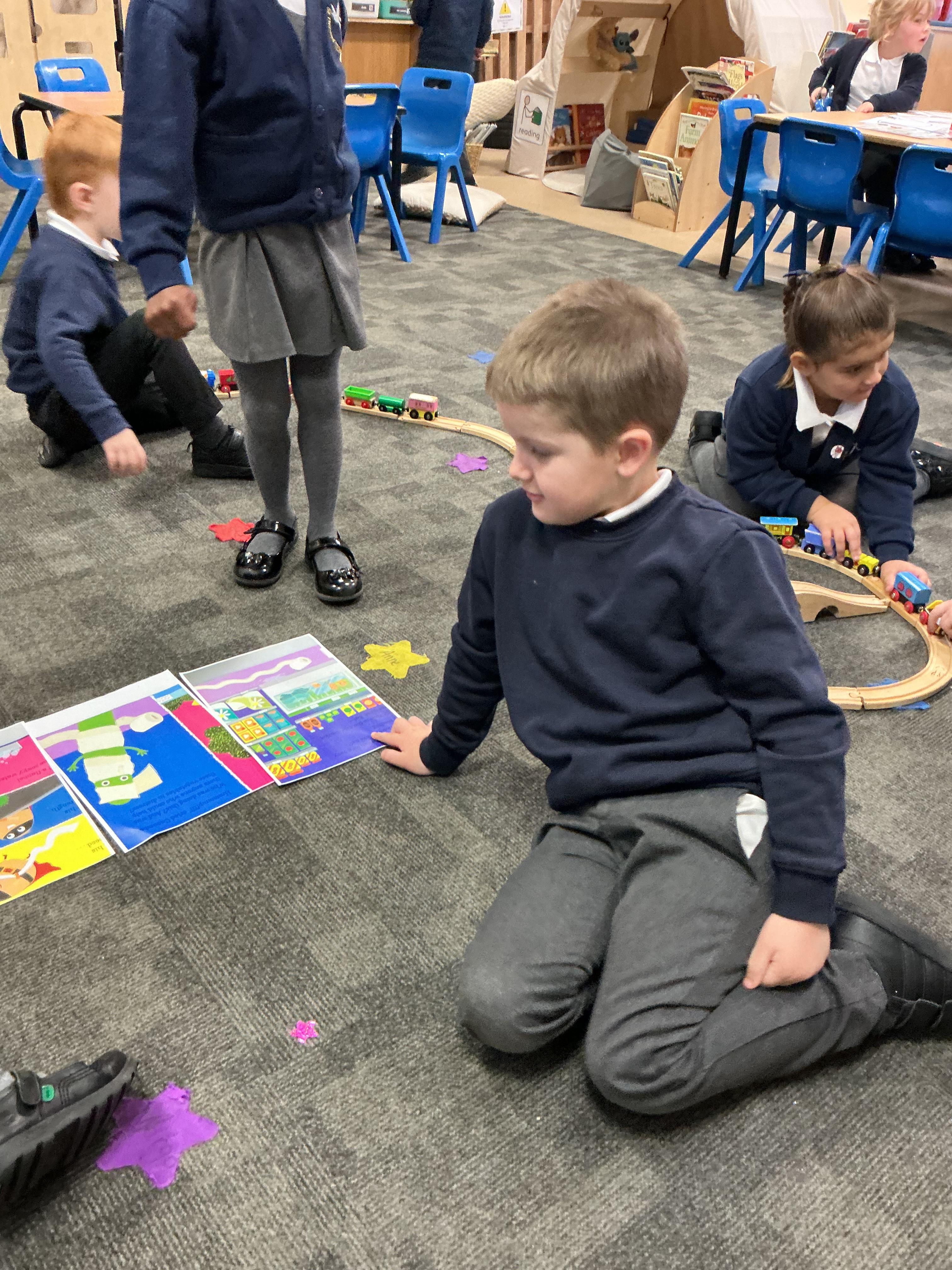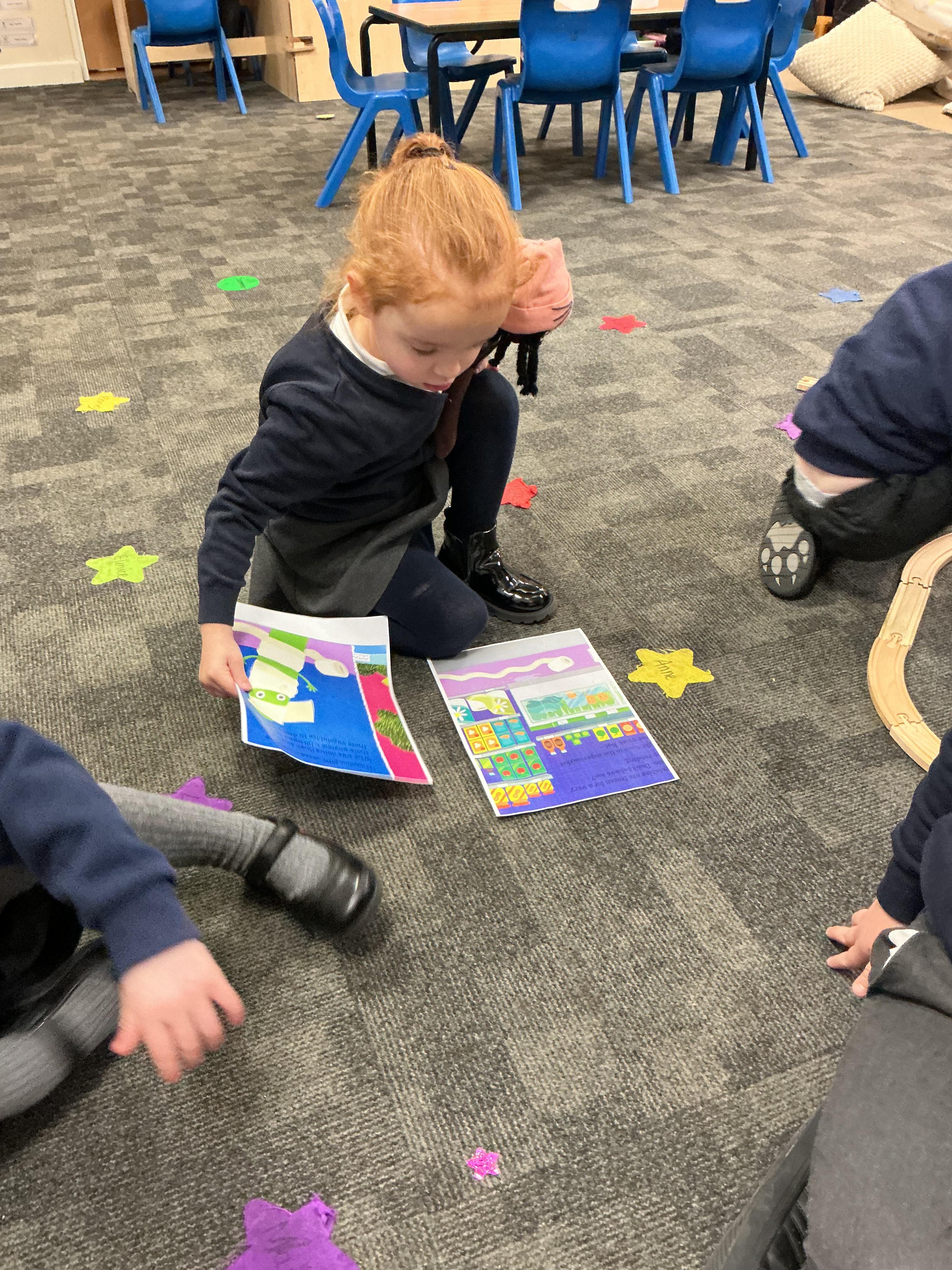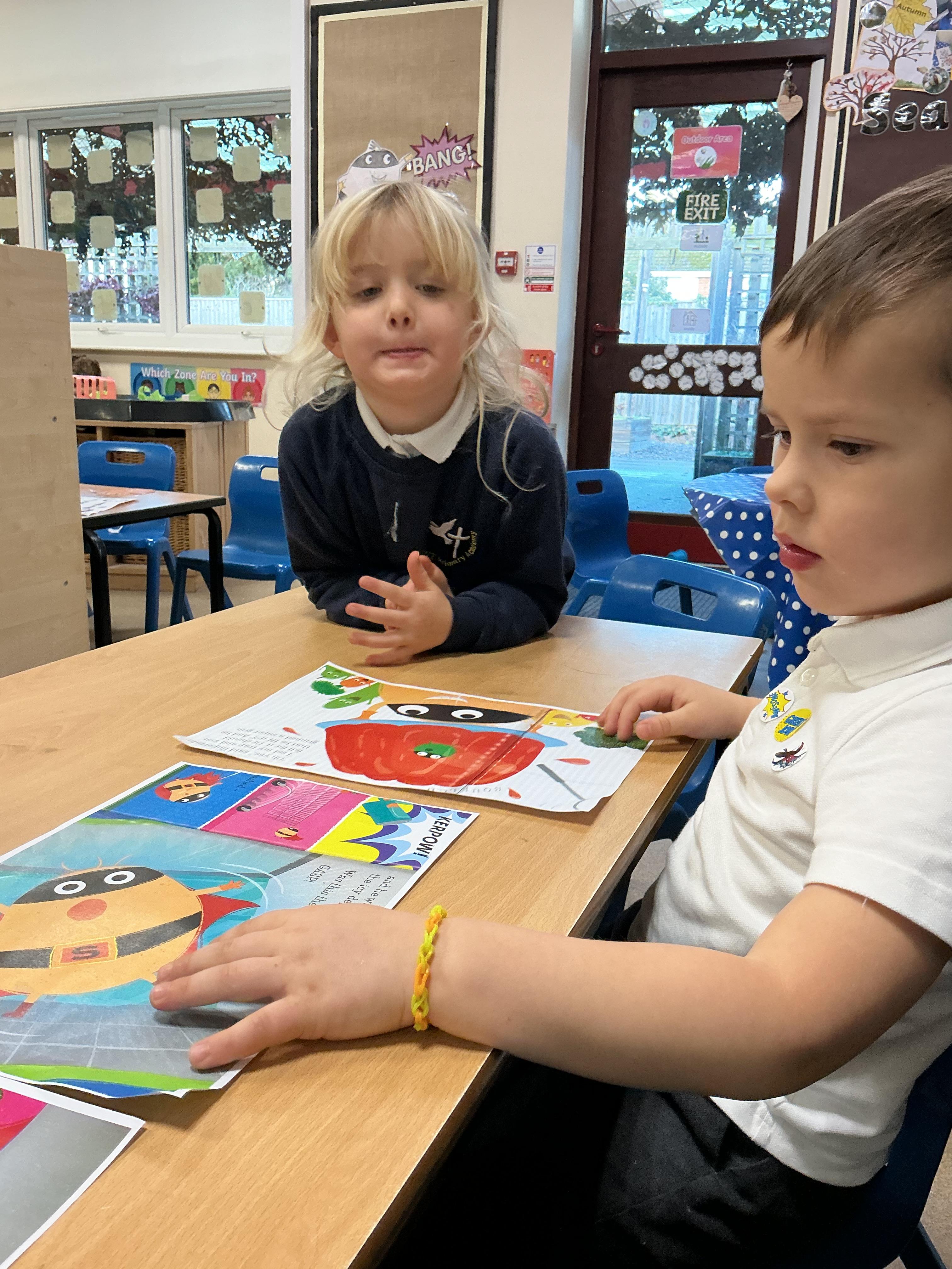 The children have loved listening to the story, describing the characters, talking about how evil the pea is and from this have been able to order pictures from the story in order. We have been using my turn, your turn to repeat the phrases from the story.