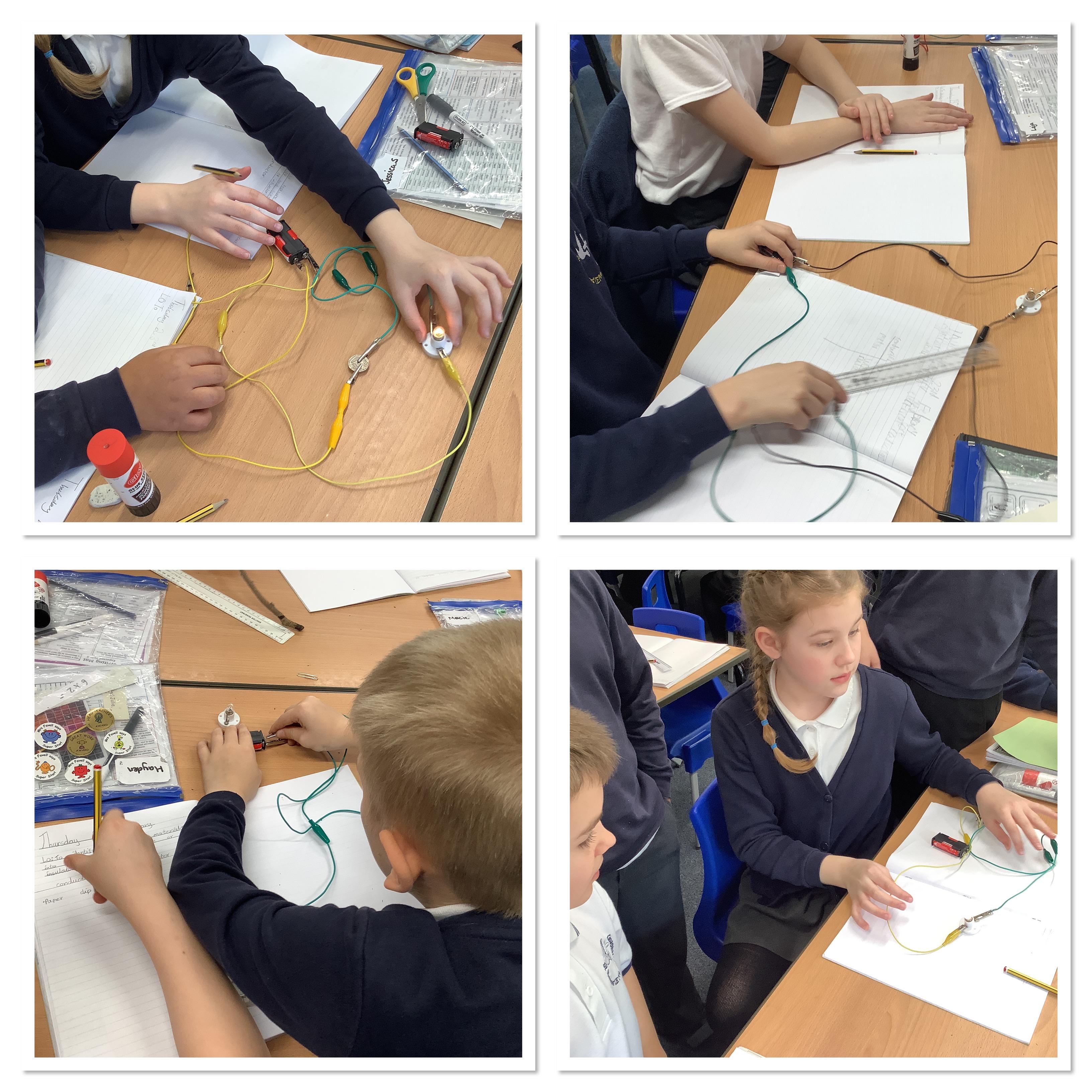 First we put together electrical circuits, then in groups worked out how to use them to test materials to determine which were conductors and which were insulators. We discussed the safety implications regarding everyday items such as wires and plugs - there is metal running through wires, which conducts the electricity, but they are encased in plastic to insulate (block) the electricity so people are not electrocuted when touching them.