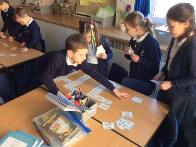 During our SPaG lesson in English this week learnt about how contractions are made from two words being put together and missing letters replaced with an apostrophe. To help with their learning they worked in groups to match up the full words to the contraction word.