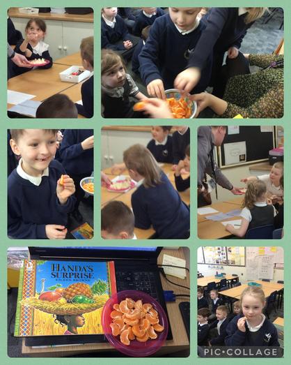 In English we have been reading the book, Handa's Surprise. We tasted some of the fruit from the story and thought of lots of adjectives to describe them. We will then use these adjectives to write our own expanded noun phrases.