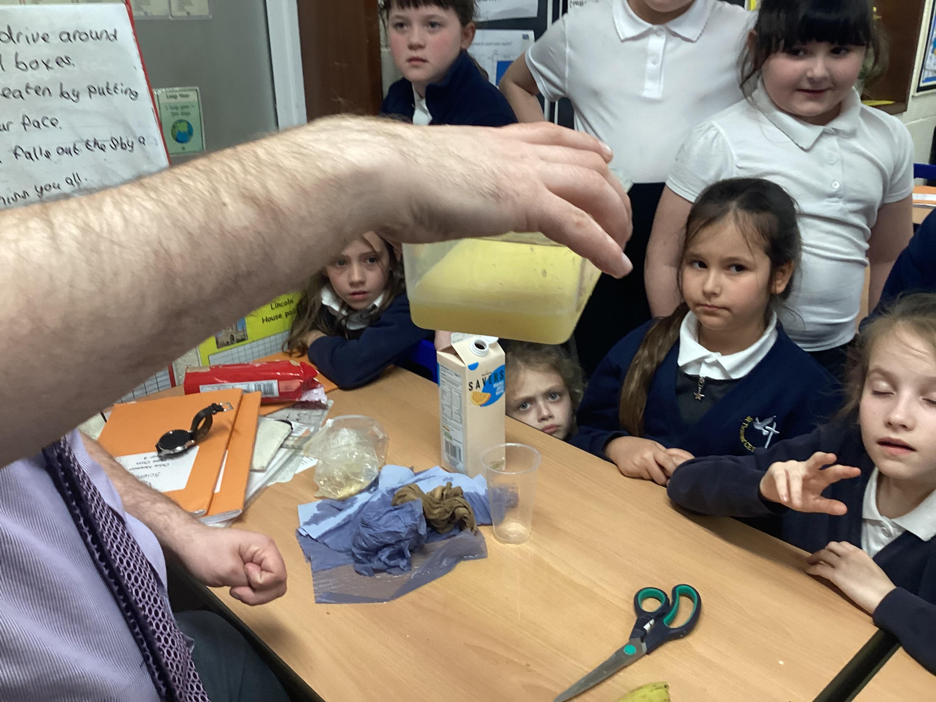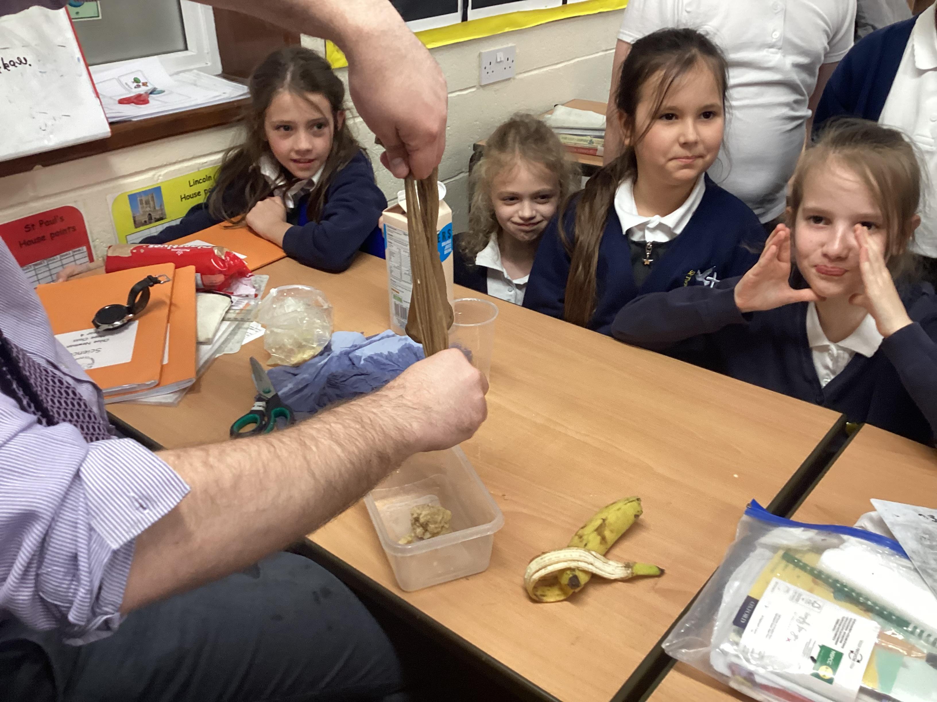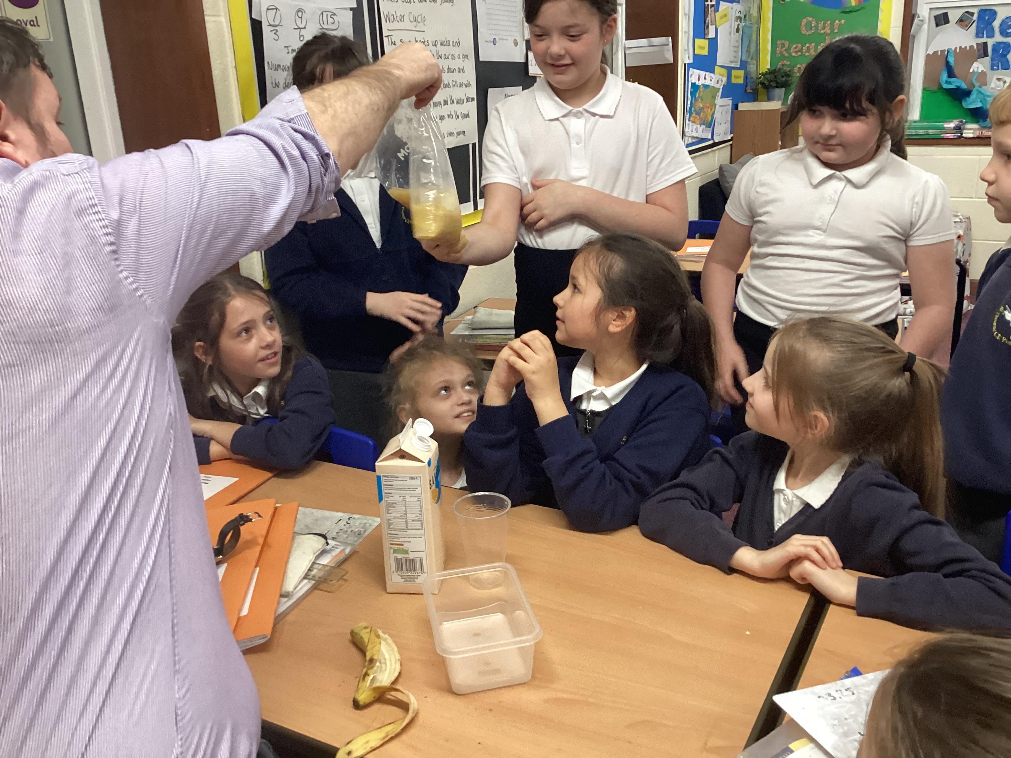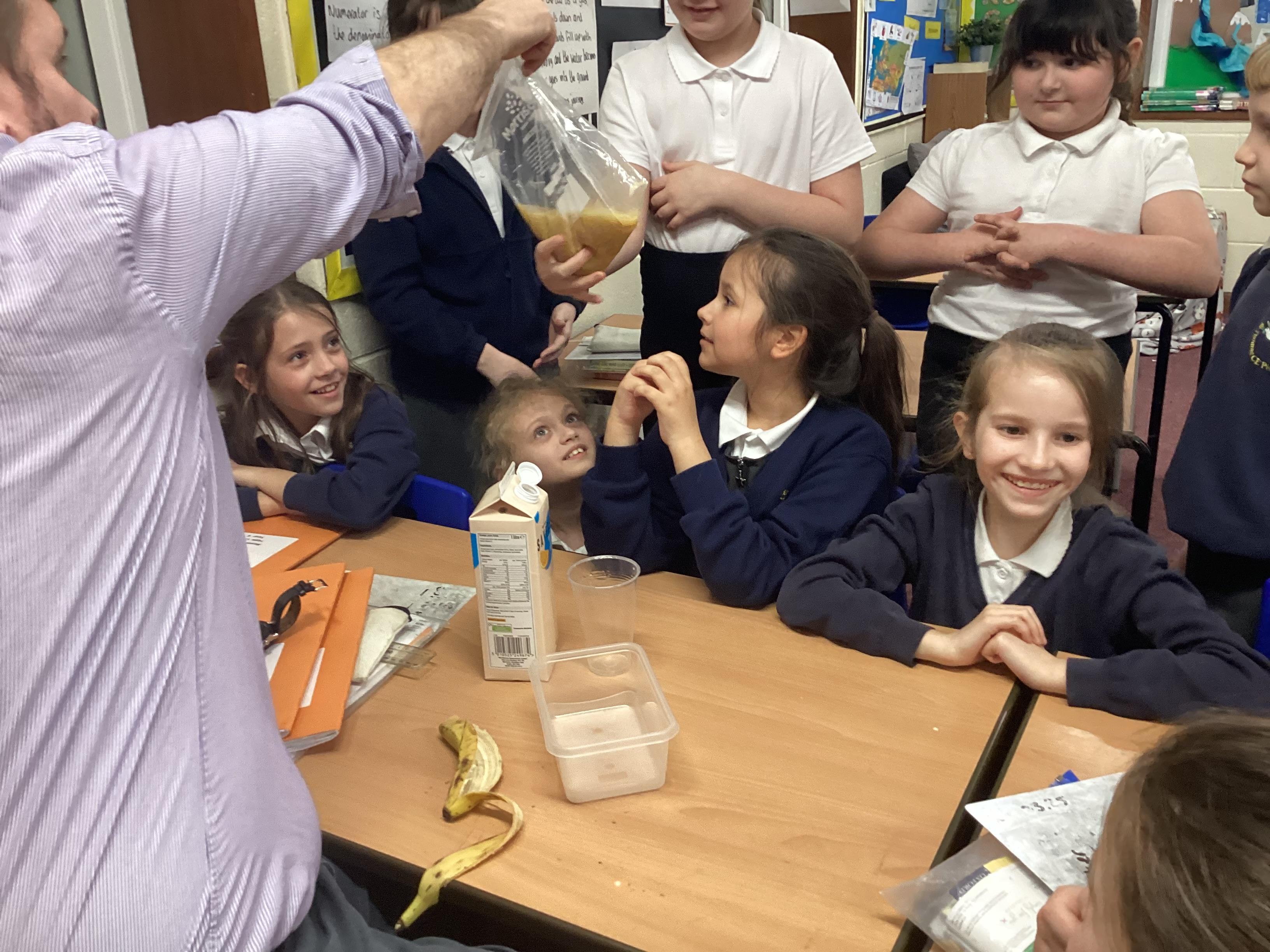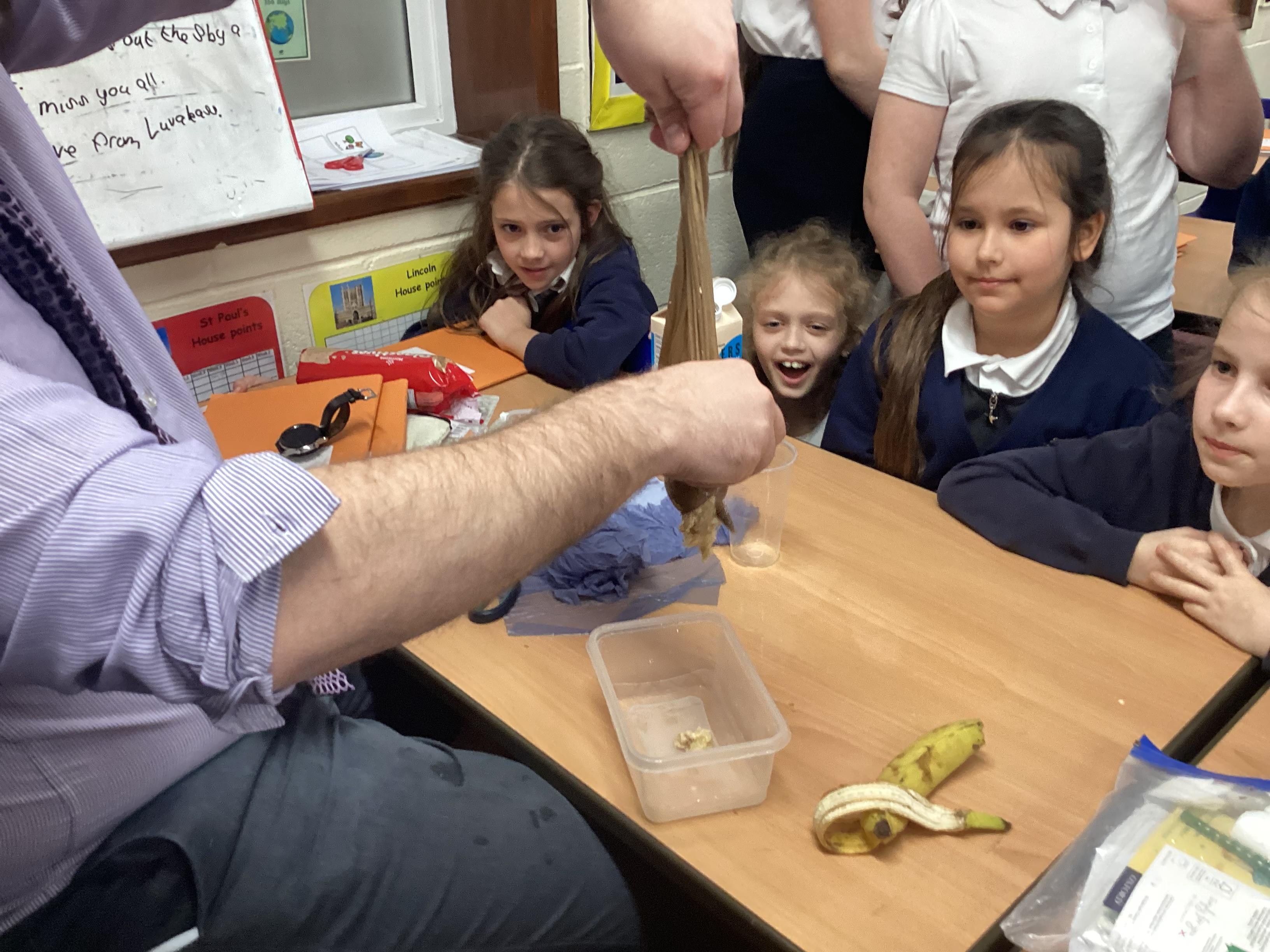 As part of our learning linking to animals, including humans, we have been looking at the digestive system and what actually happens when we eat food. This was a lively experiment with lots of gross sections…..which we loved! Using household items such as tights, bananas, biscuits and orange juice, we recreated the digestive process.