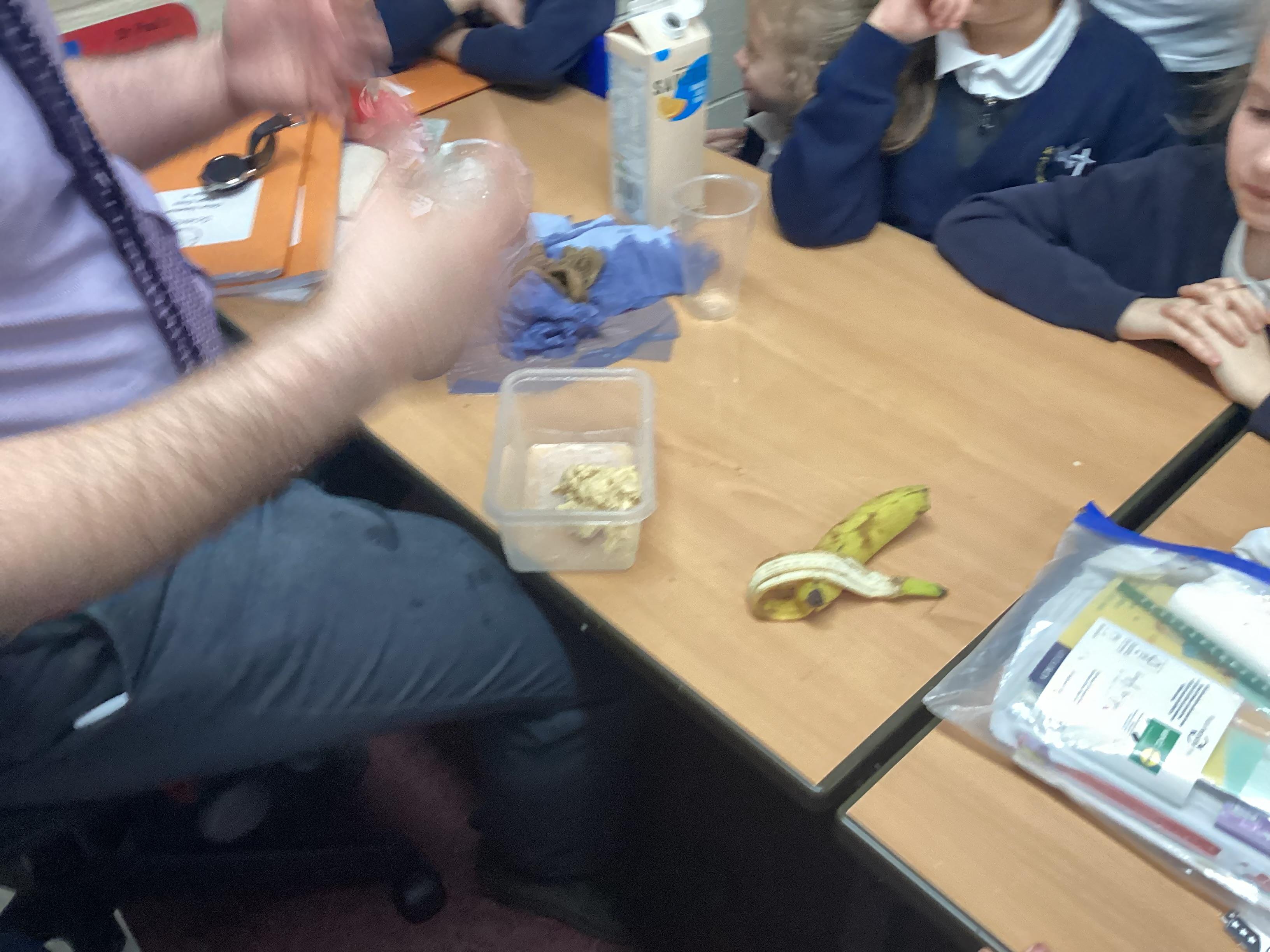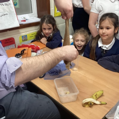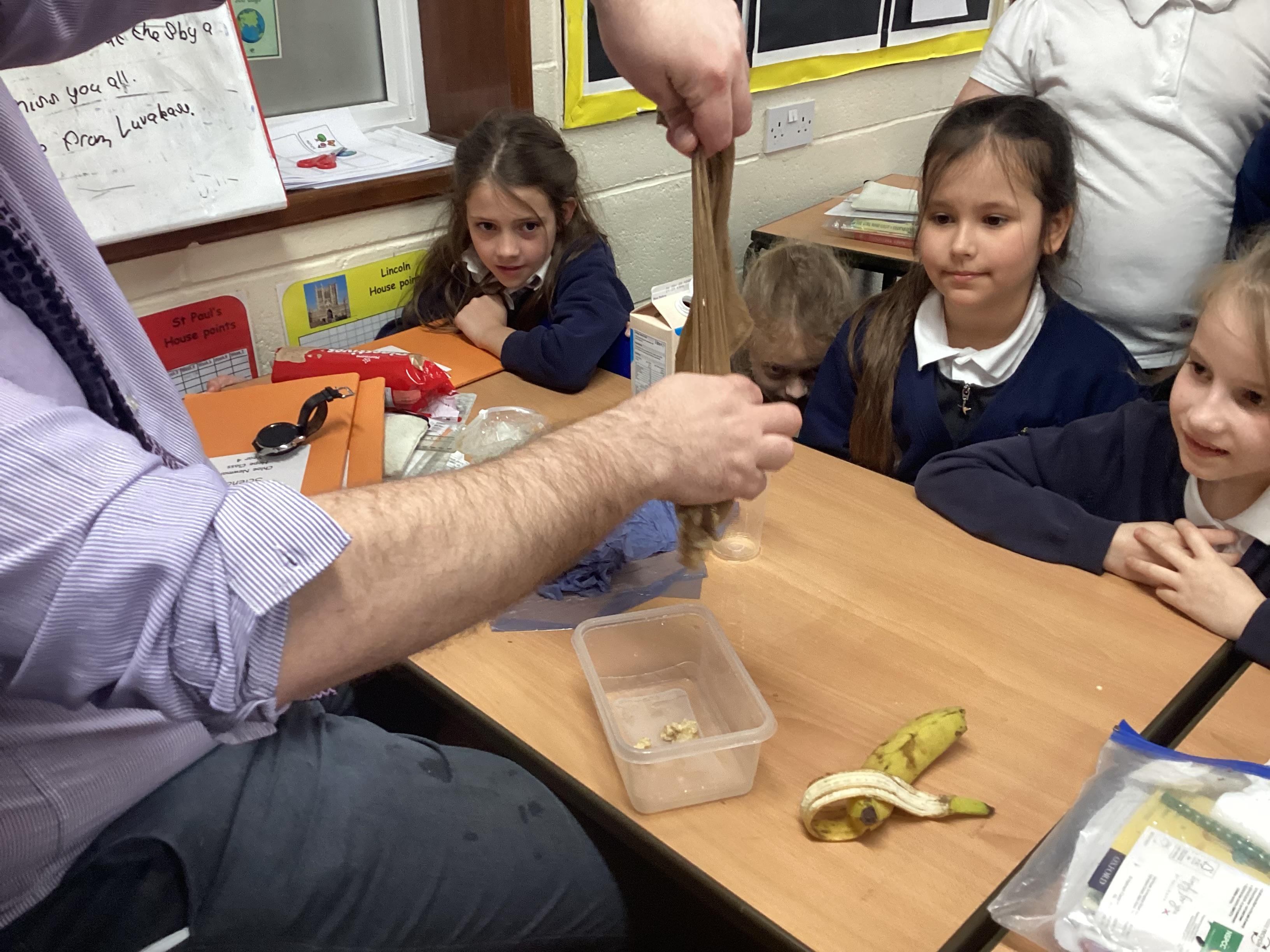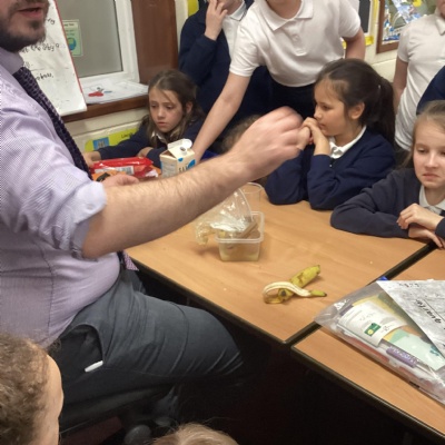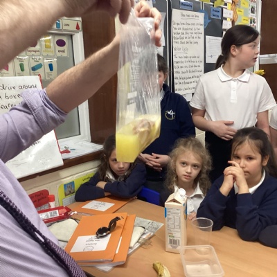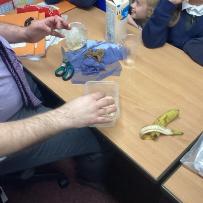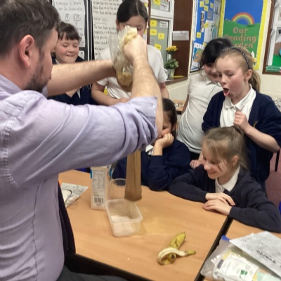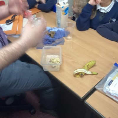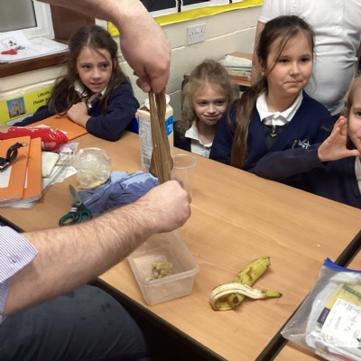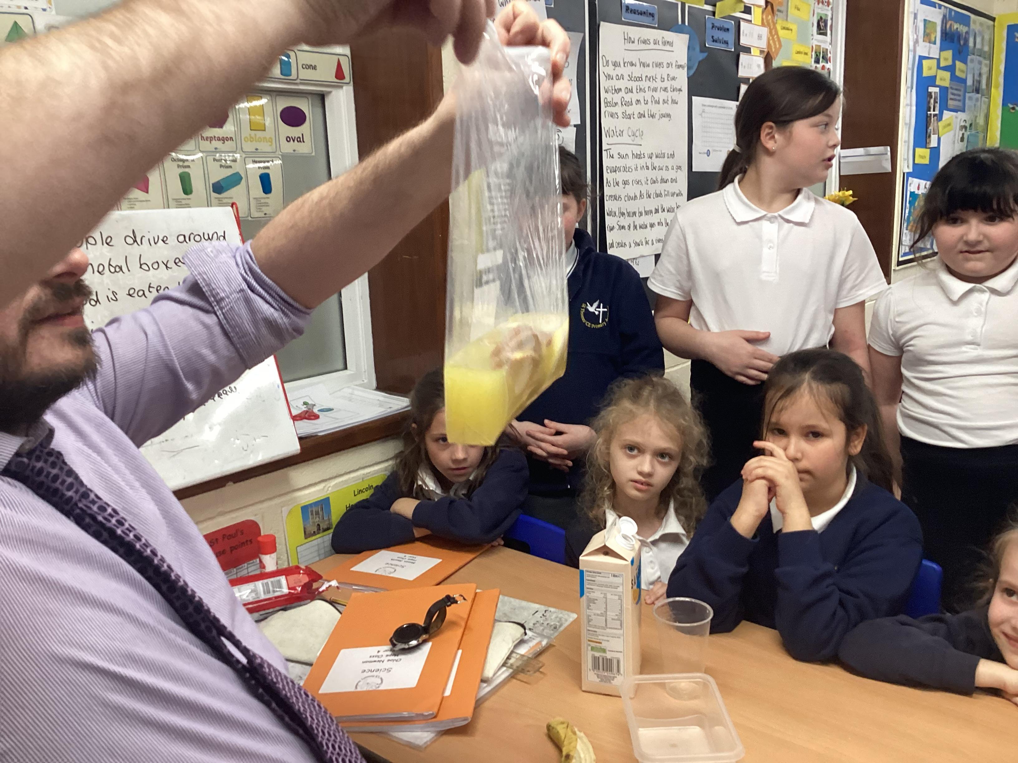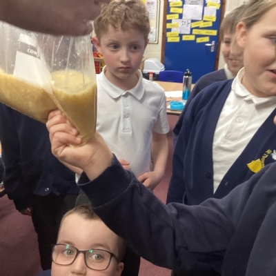 As part of our learning linking to animals, including humans, we have been looking at the digestive system and what actually happens when we eat food. This was a lively experiment with lots of gross sections…..which we loved! Using household items such as tights, bananas, biscuits and orange juice, we recreated the digestive process.
