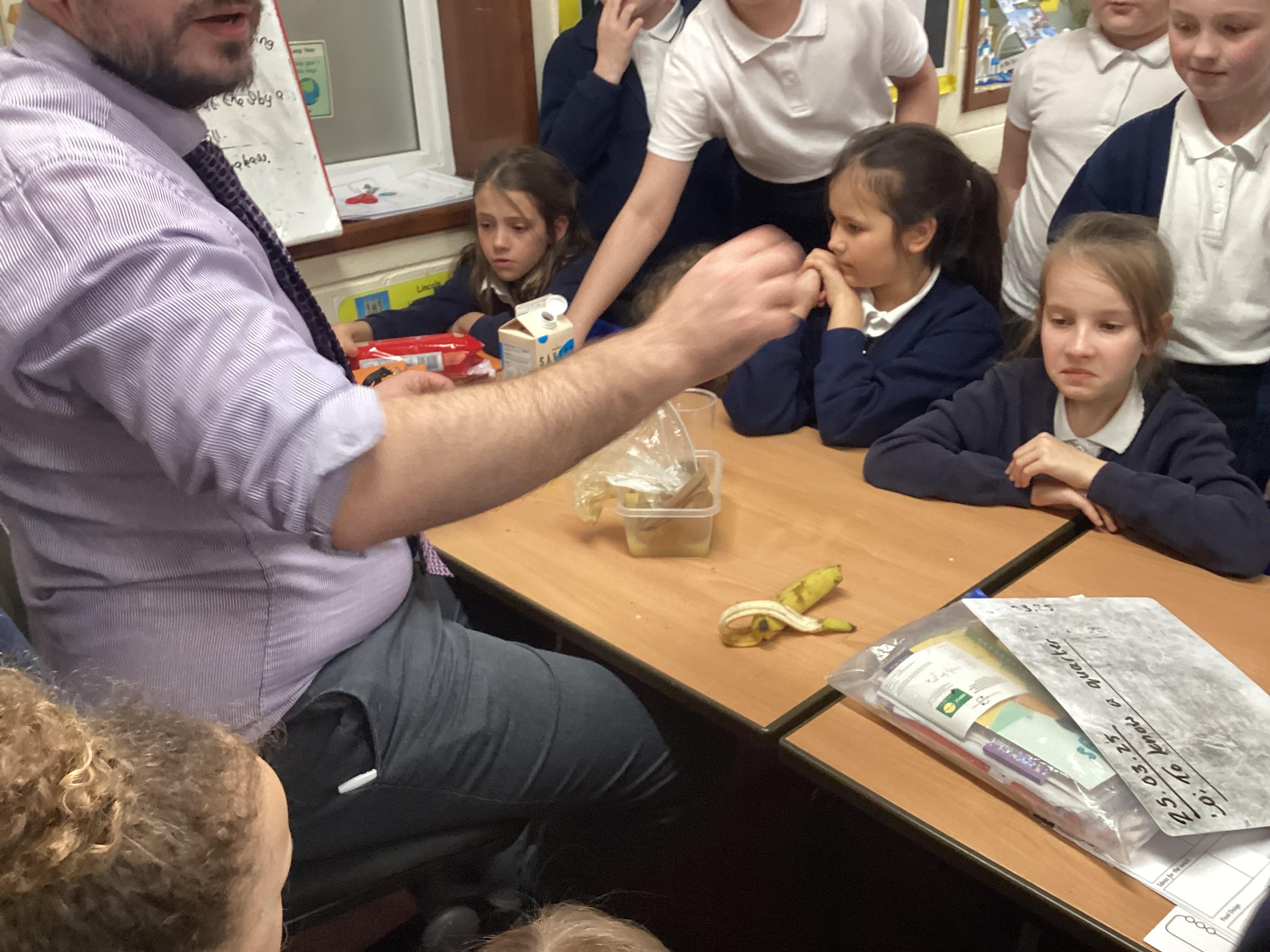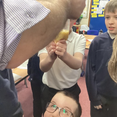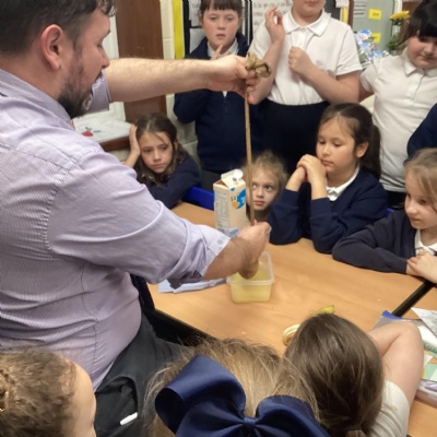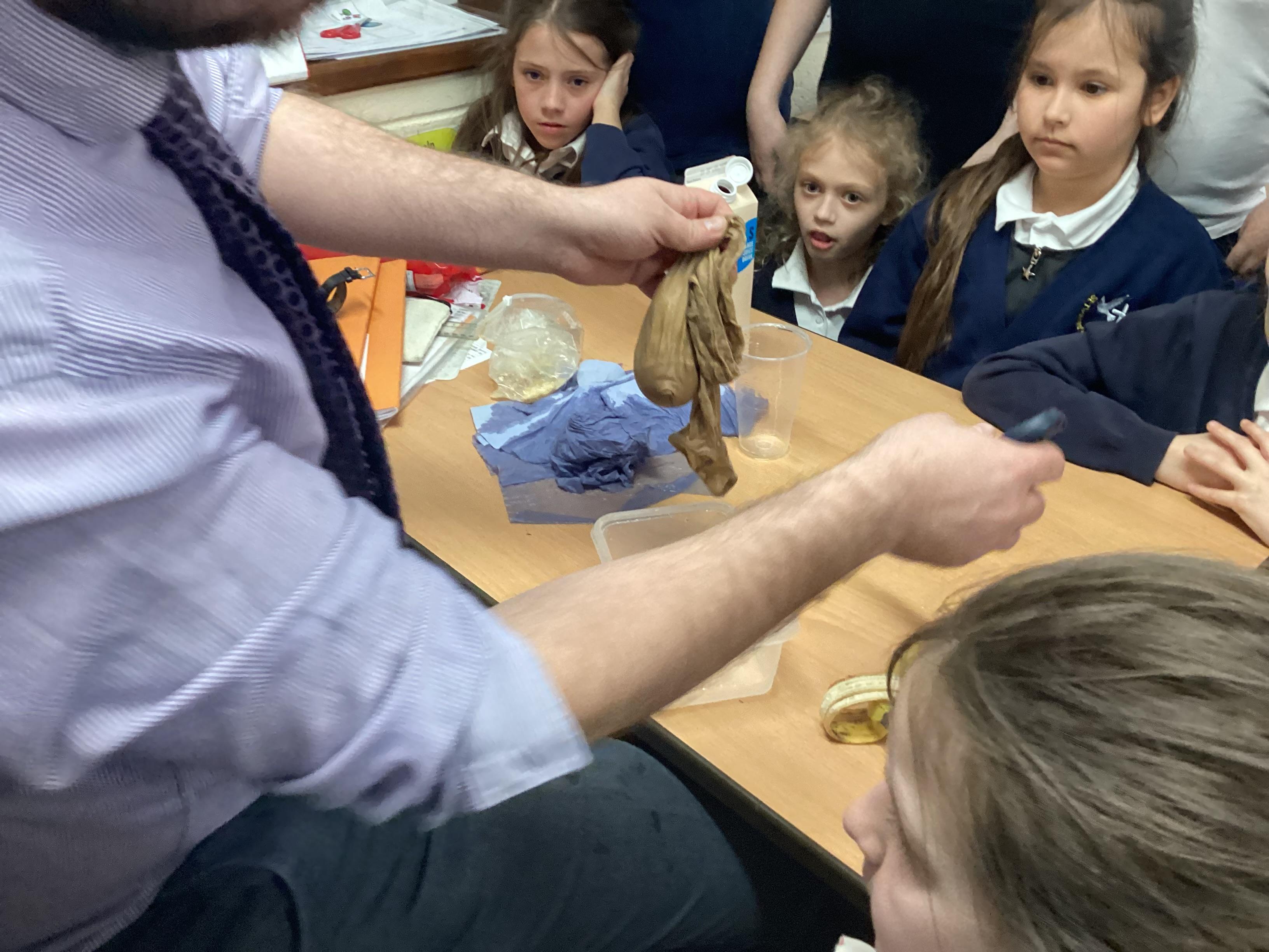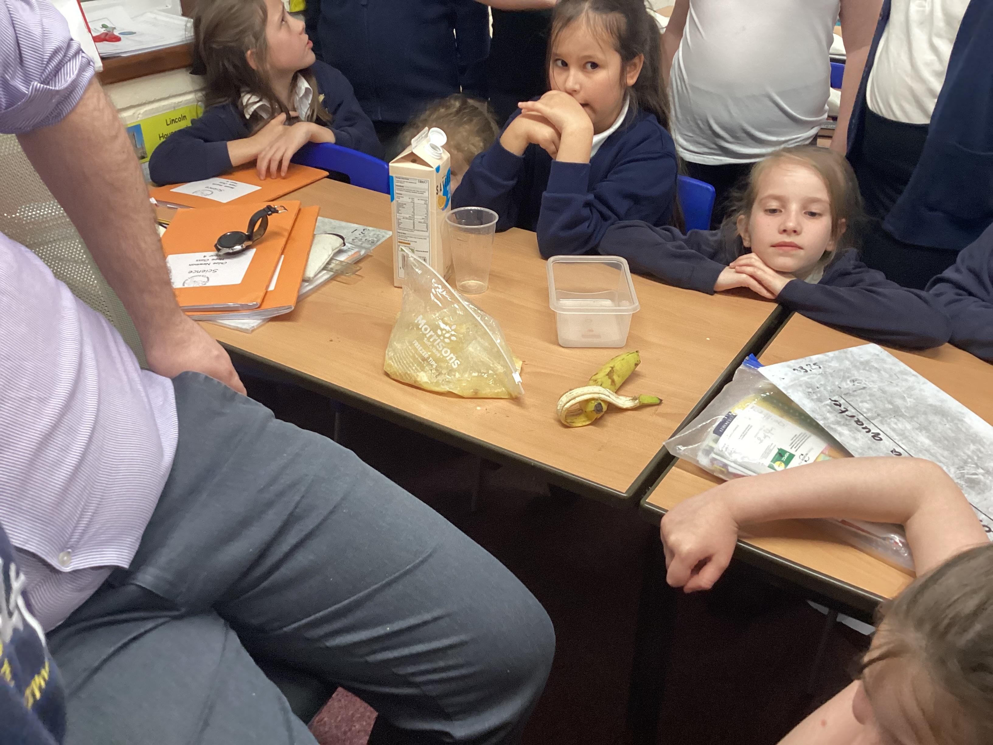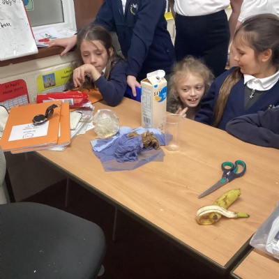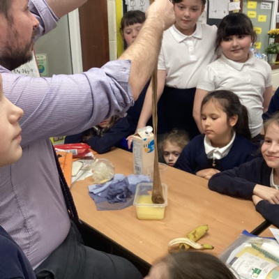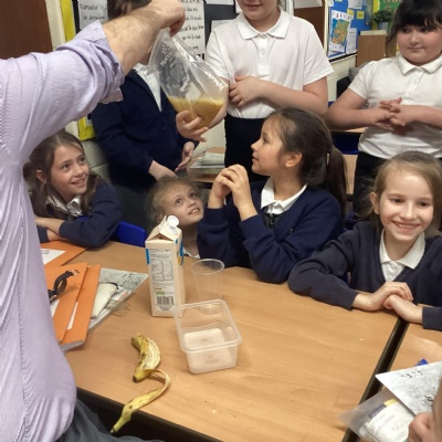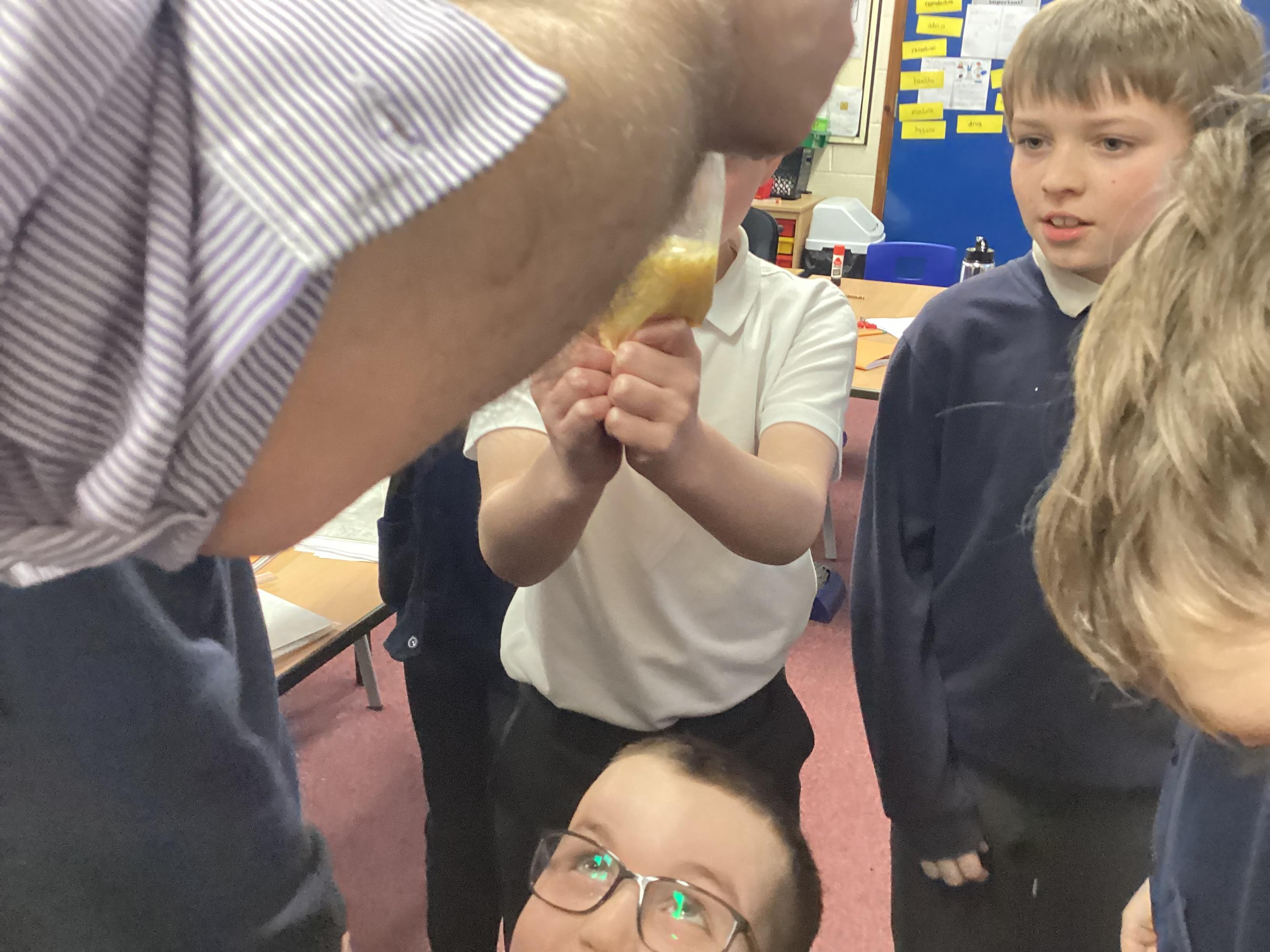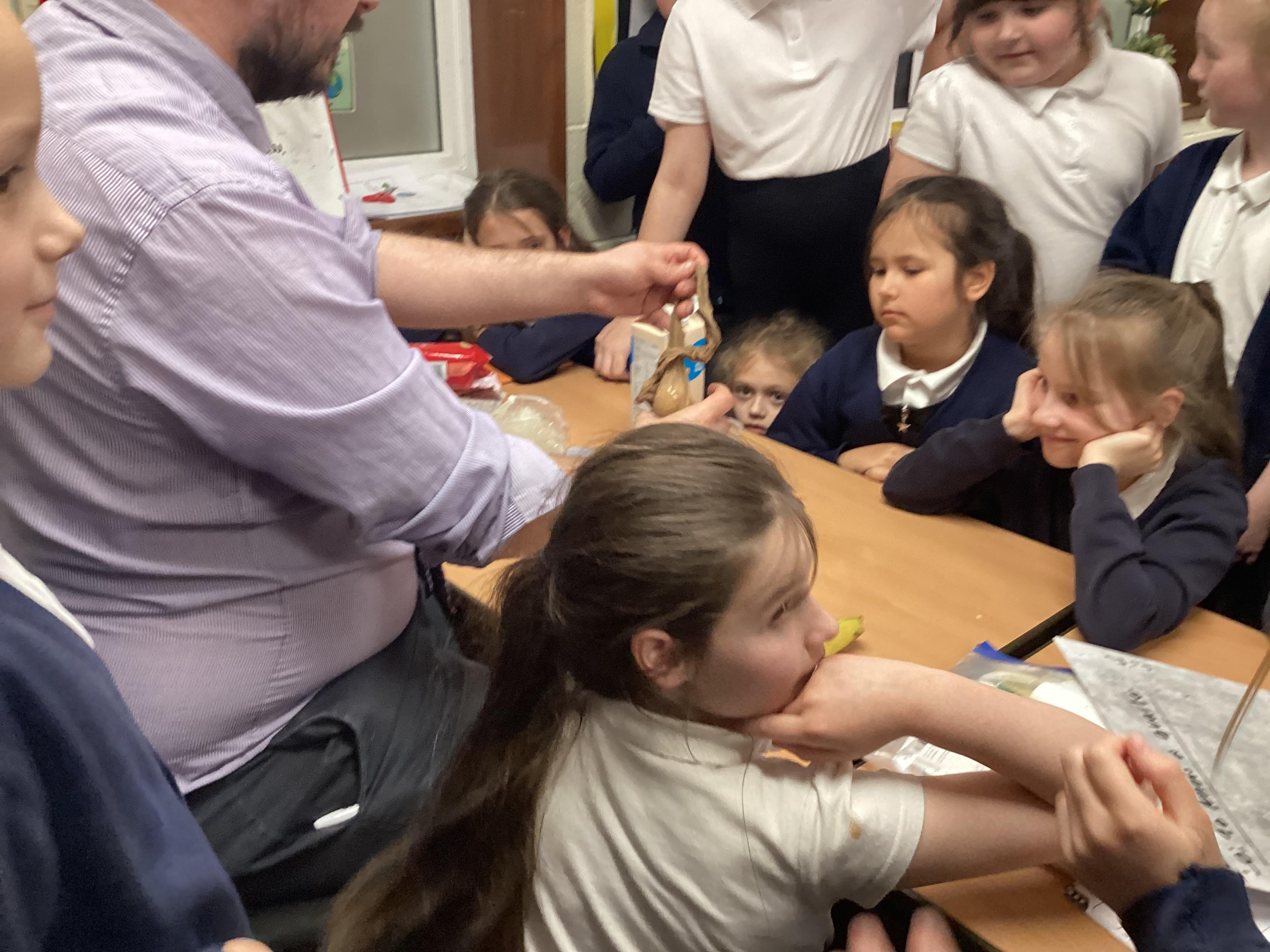 As part of our learning linking to animals, including humans, we have been looking at the digestive system and what actually happens when we eat food. This was a lively experiment with lots of gross sections…..which we loved! Using household items such as tights, bananas, biscuits and orange juice, we recreated the digestive process.
