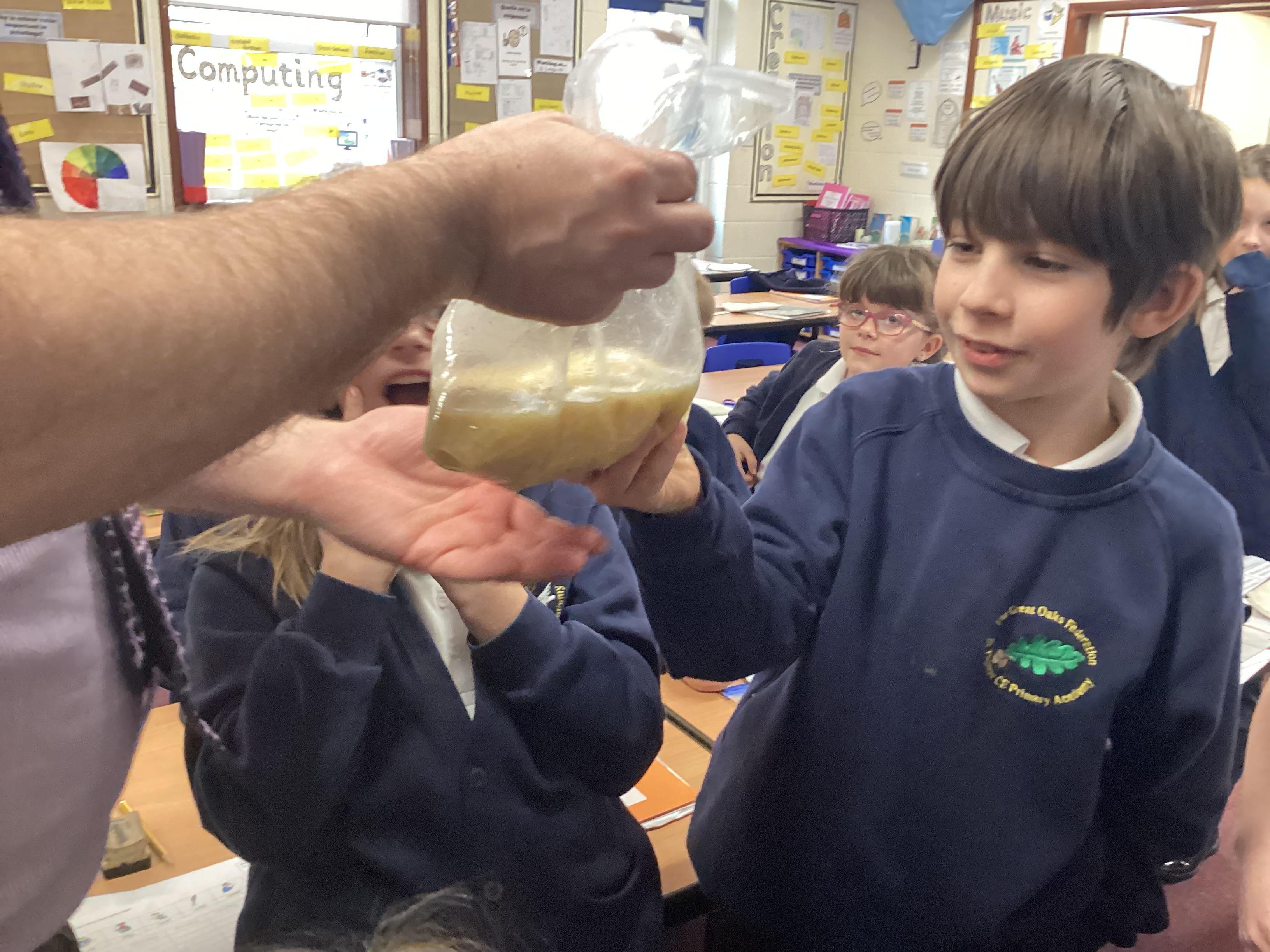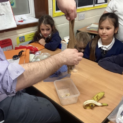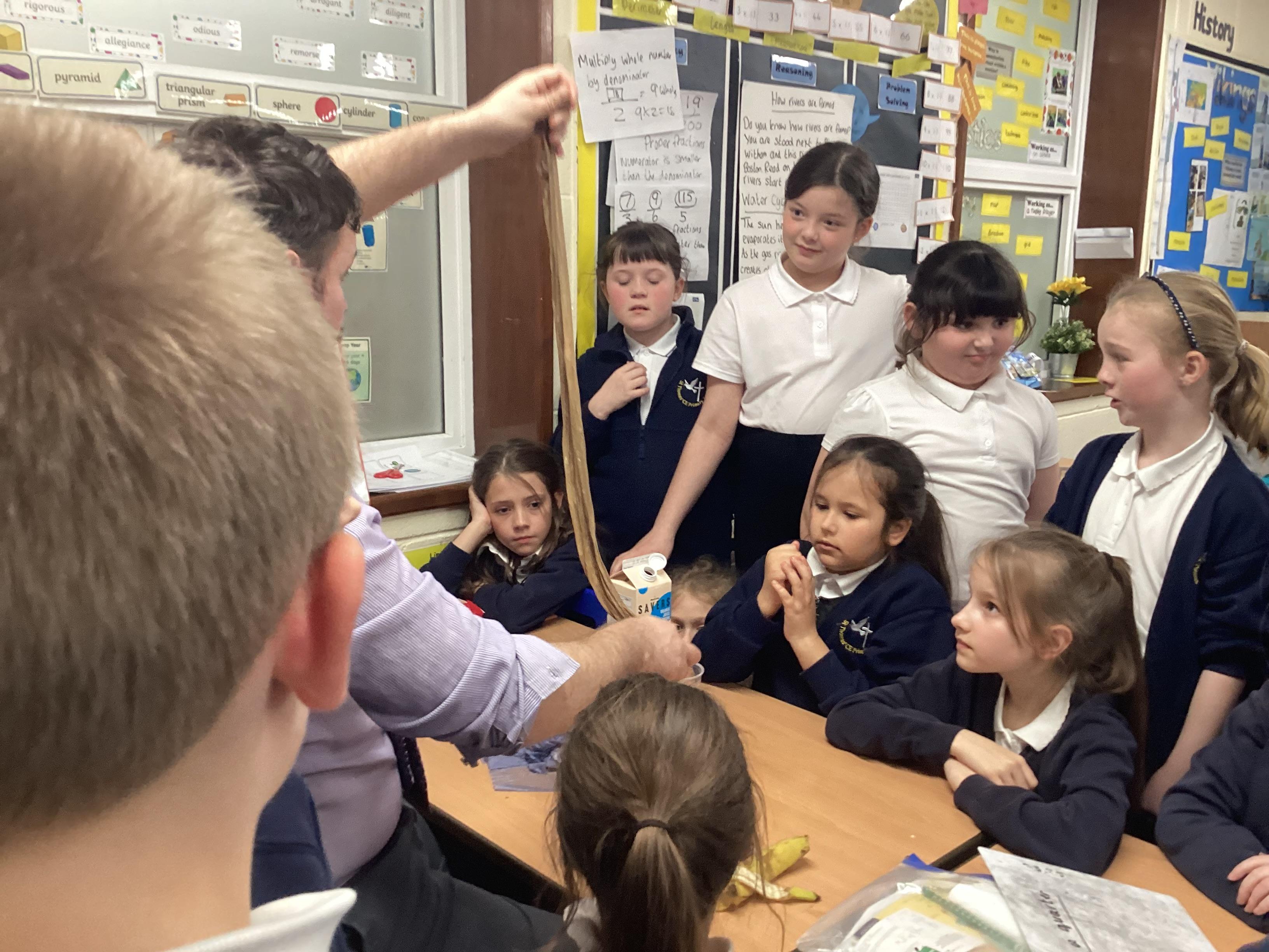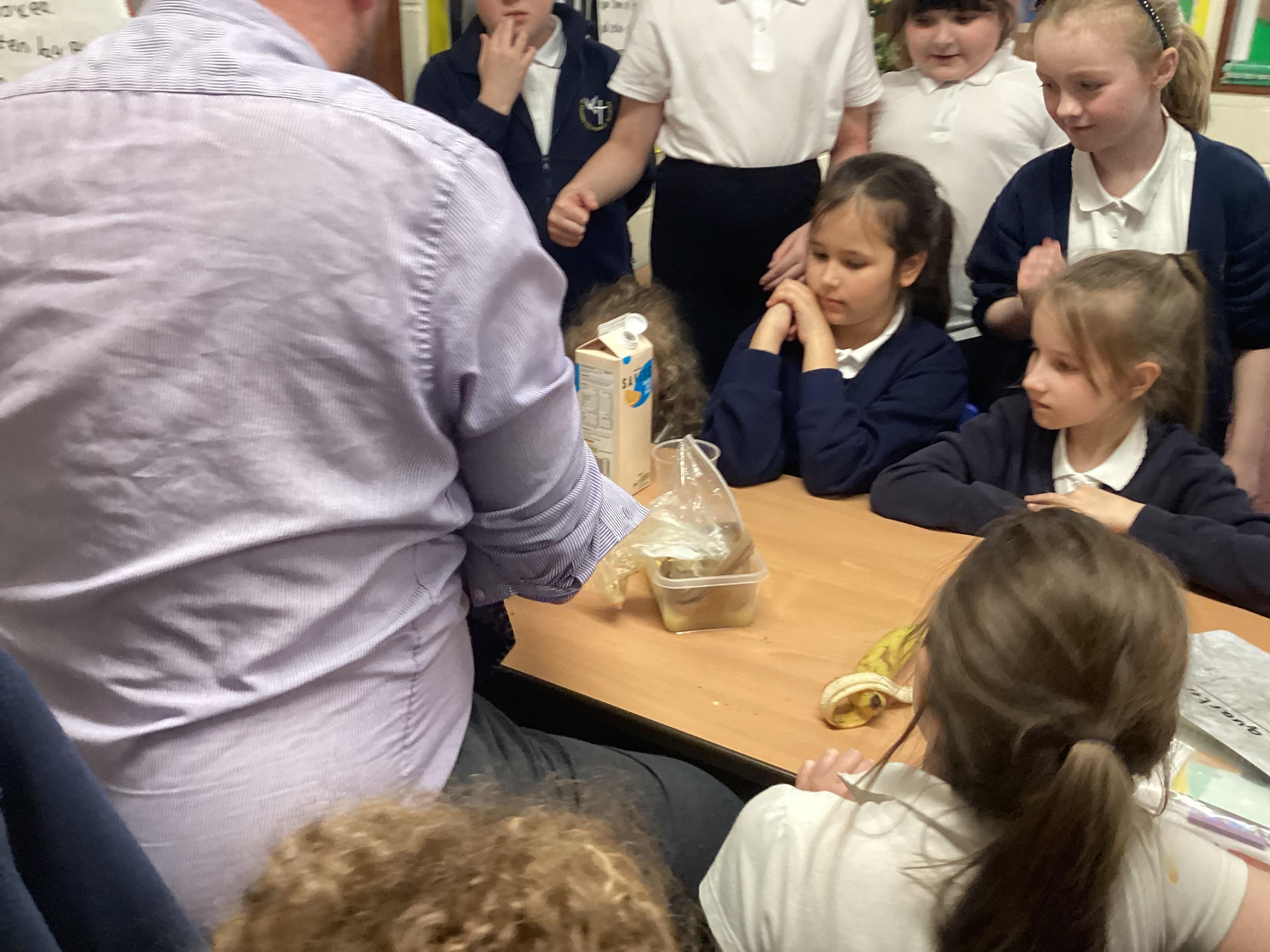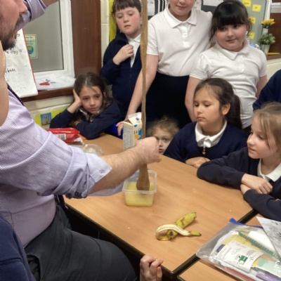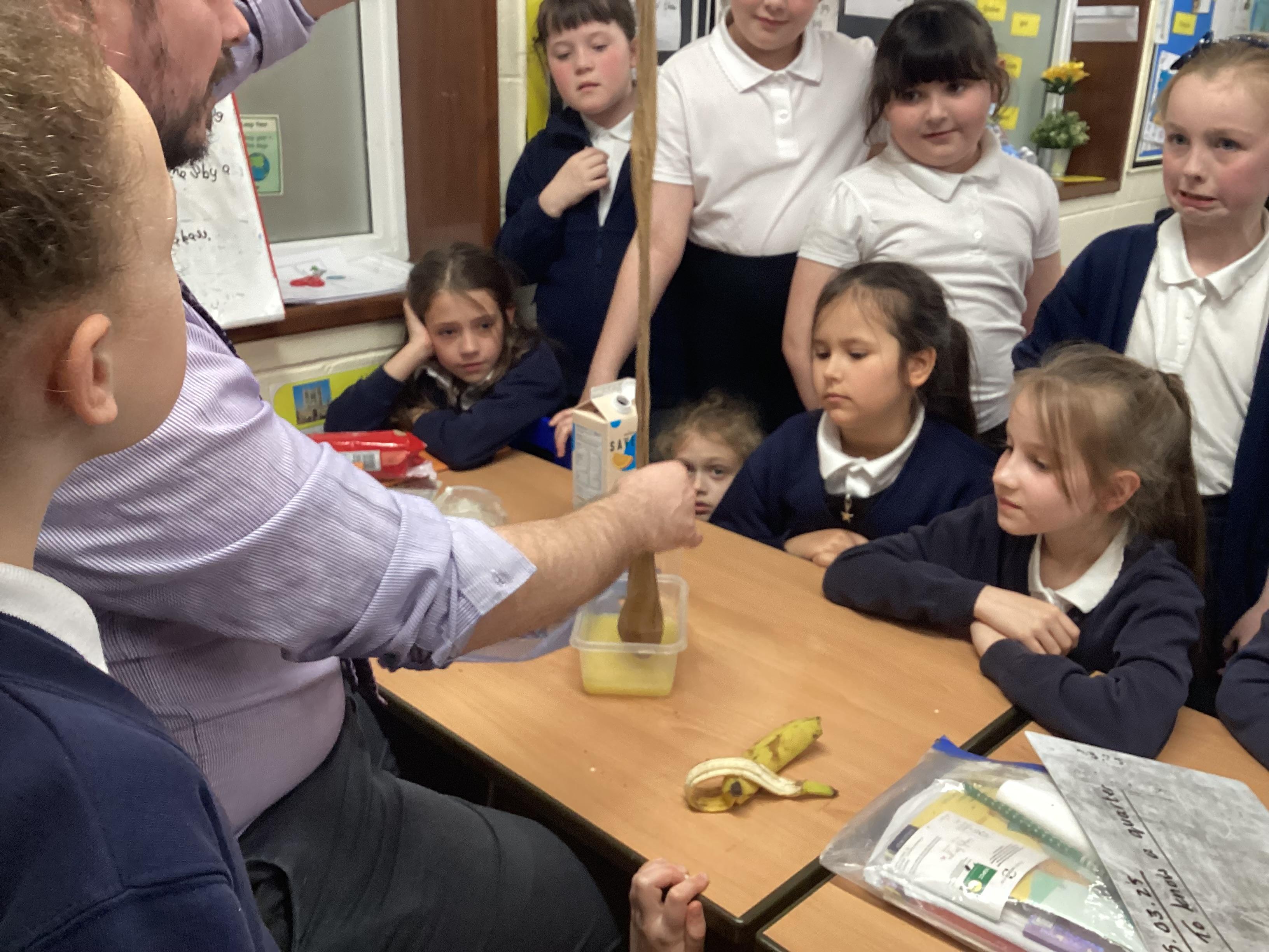 As part of our learning linking to animals, including humans, we have been looking at the digestive system and what actually happens when we eat food. This was a lively experiment with lots of gross sections…..which we loved! Using household items such as tights, bananas, biscuits and orange juice, we recreated the digestive process.