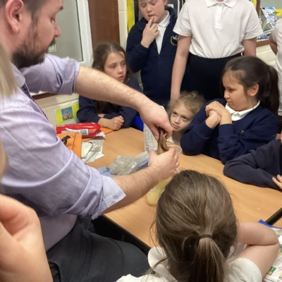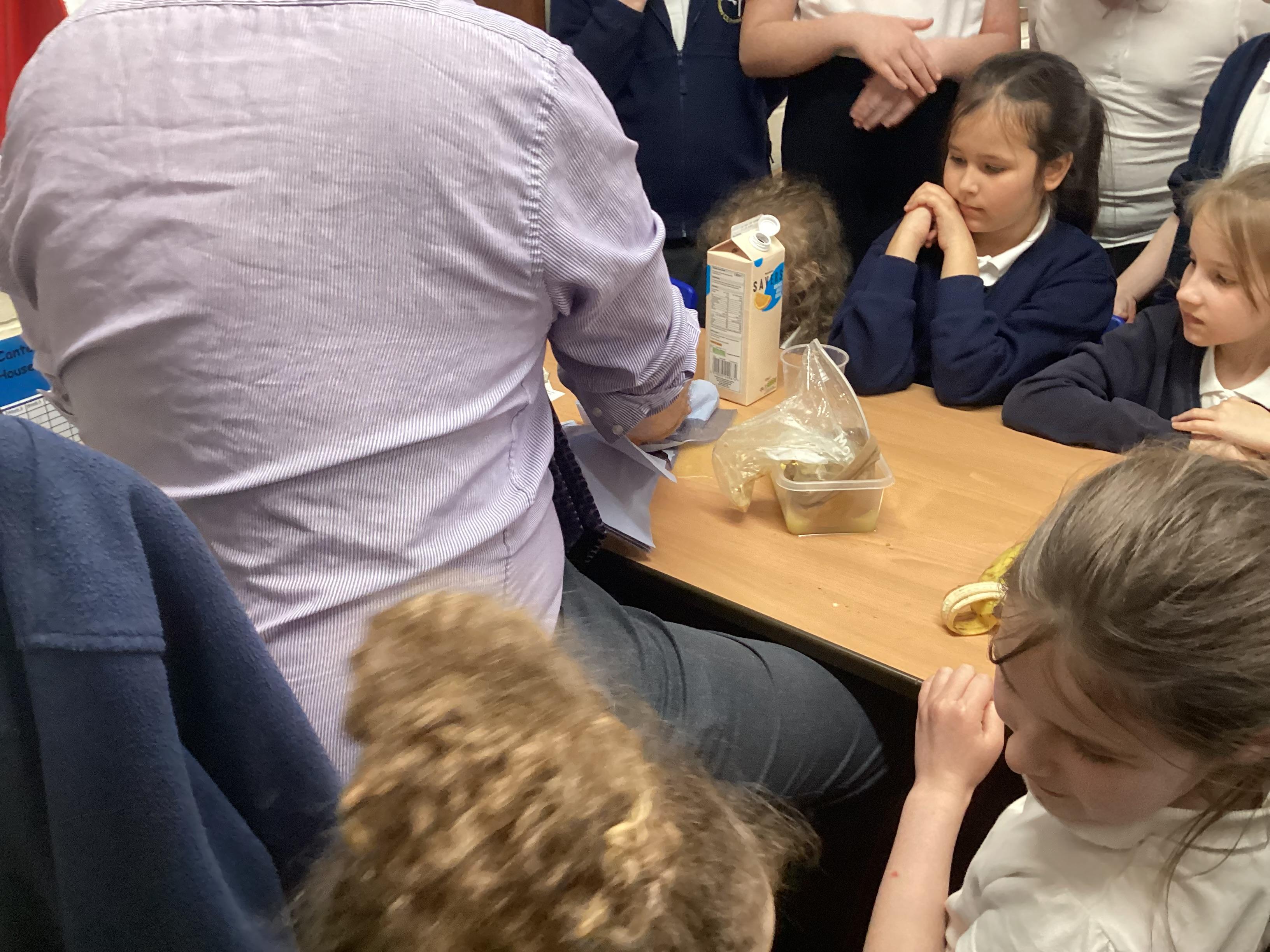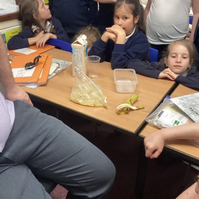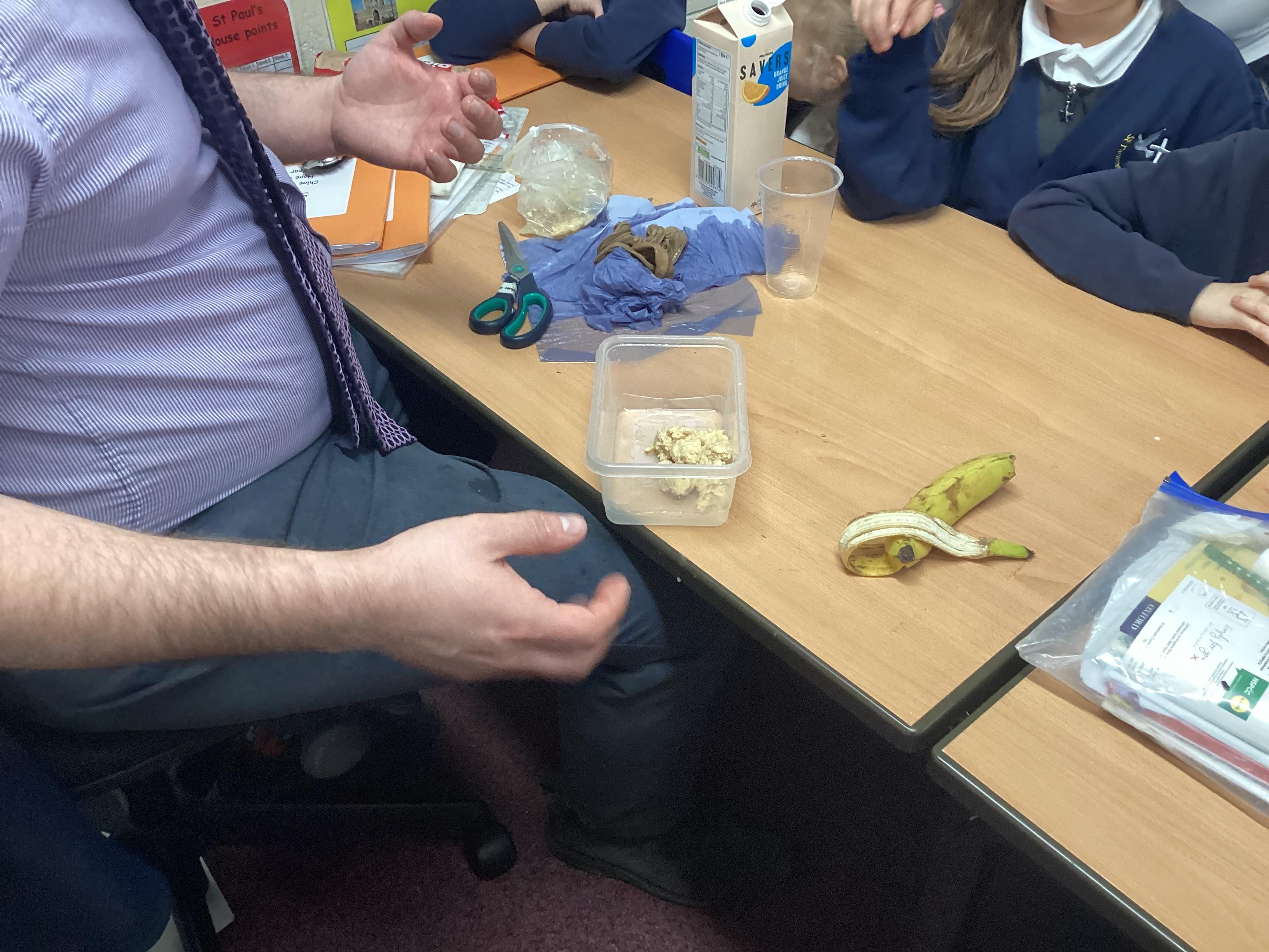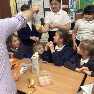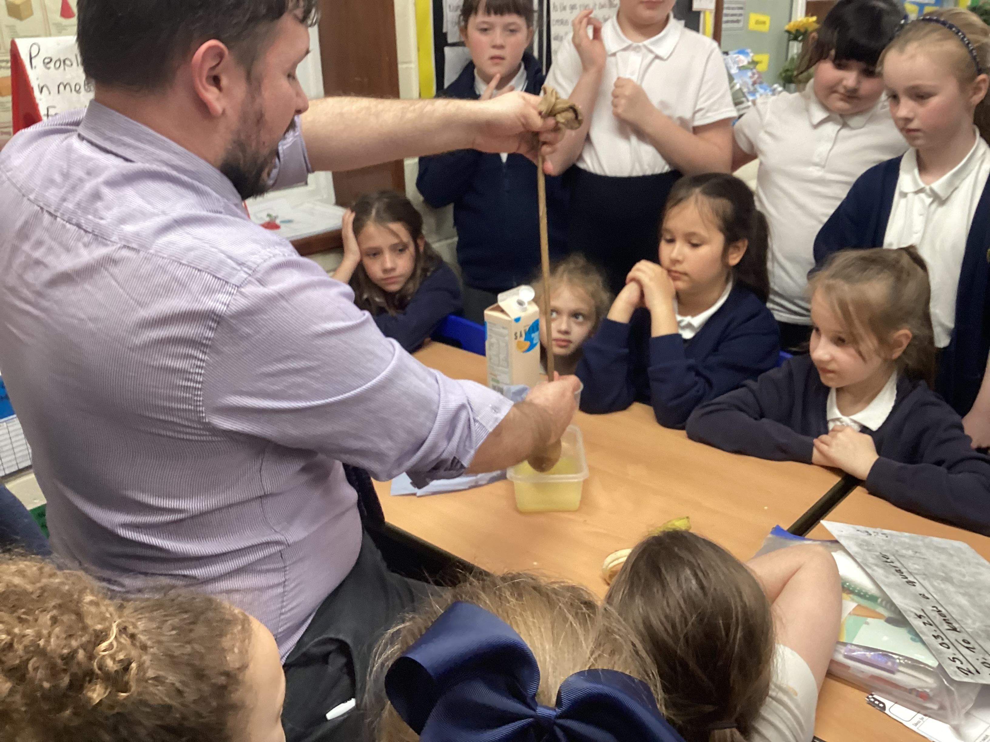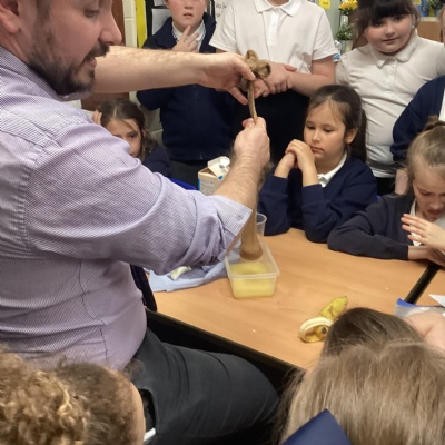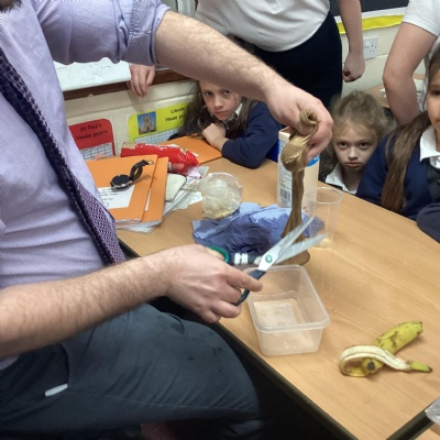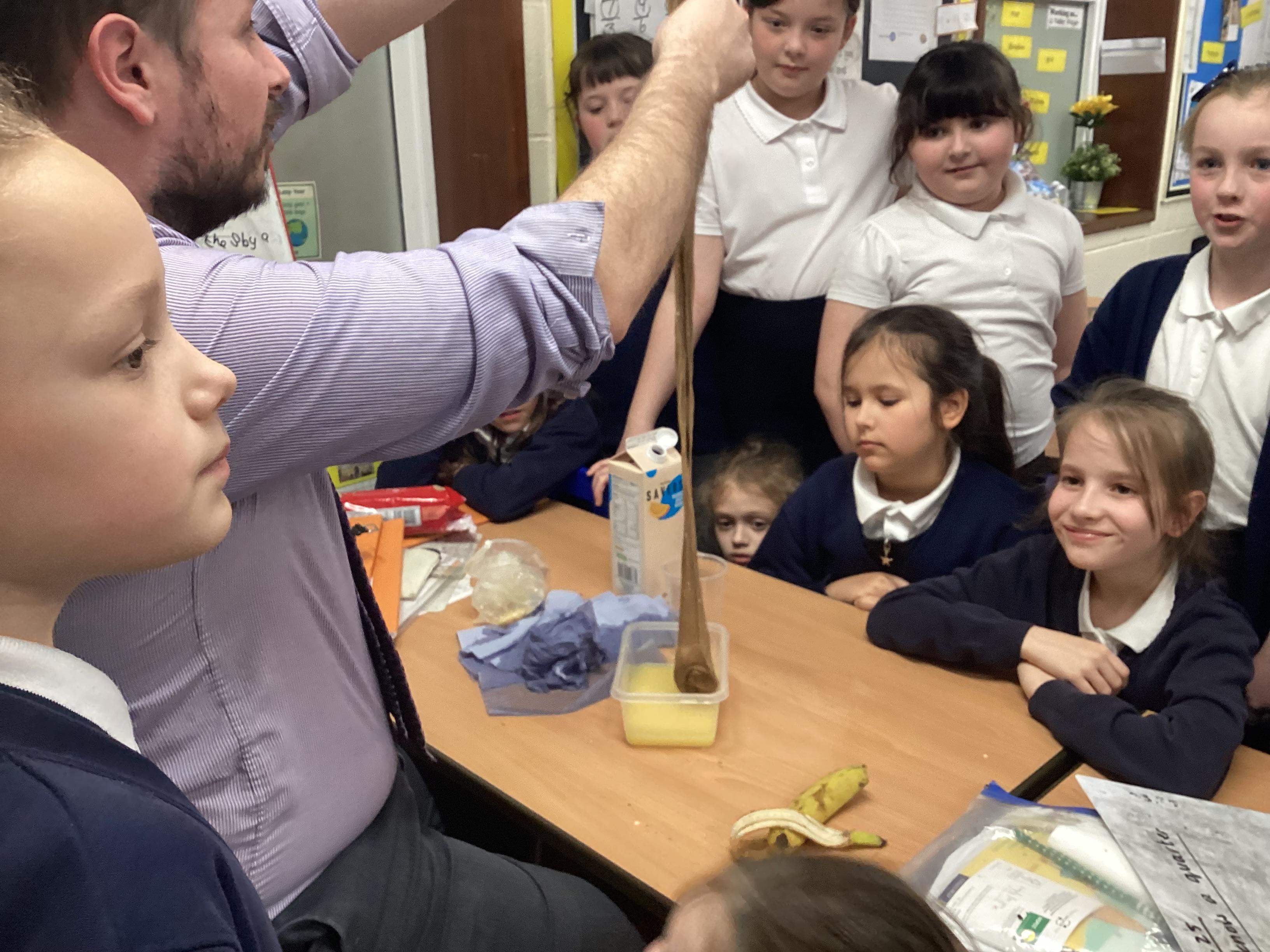As part of our learning linking to animals, including humans, we have been looking at the digestive system and what actually happens when we eat food. This was a lively experiment with lots of gross sections…..which we loved! Using household items such as tights, bananas, biscuits and orange juice, we recreated the digestive process.