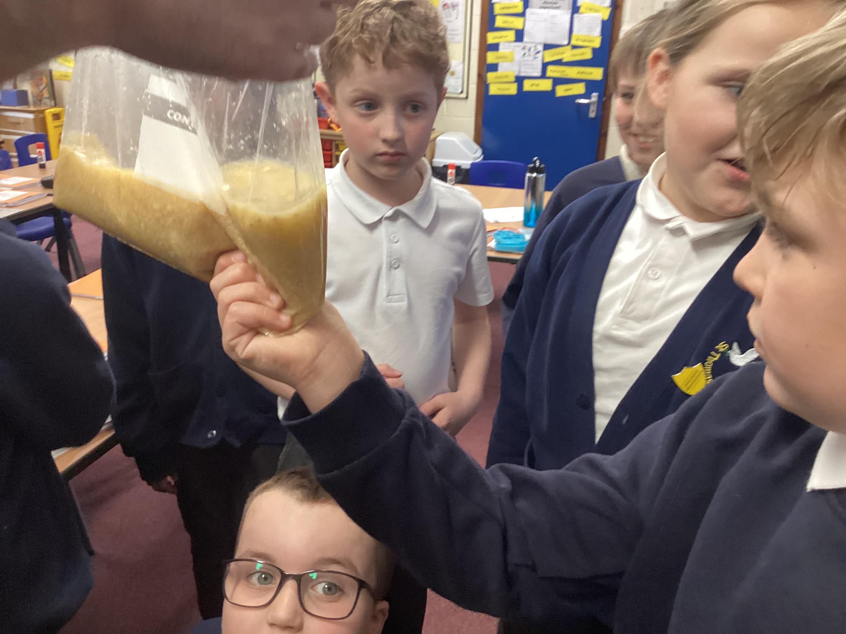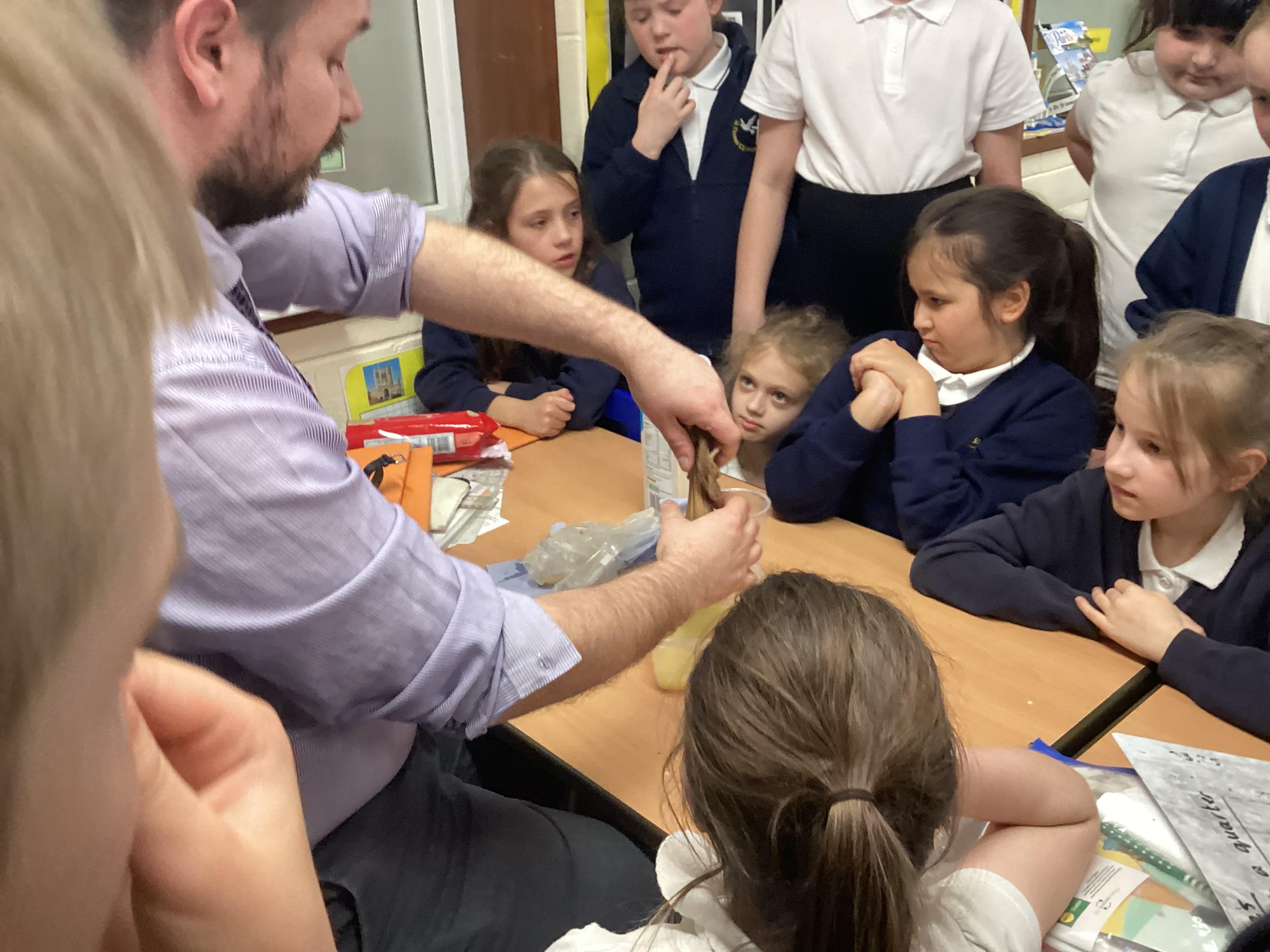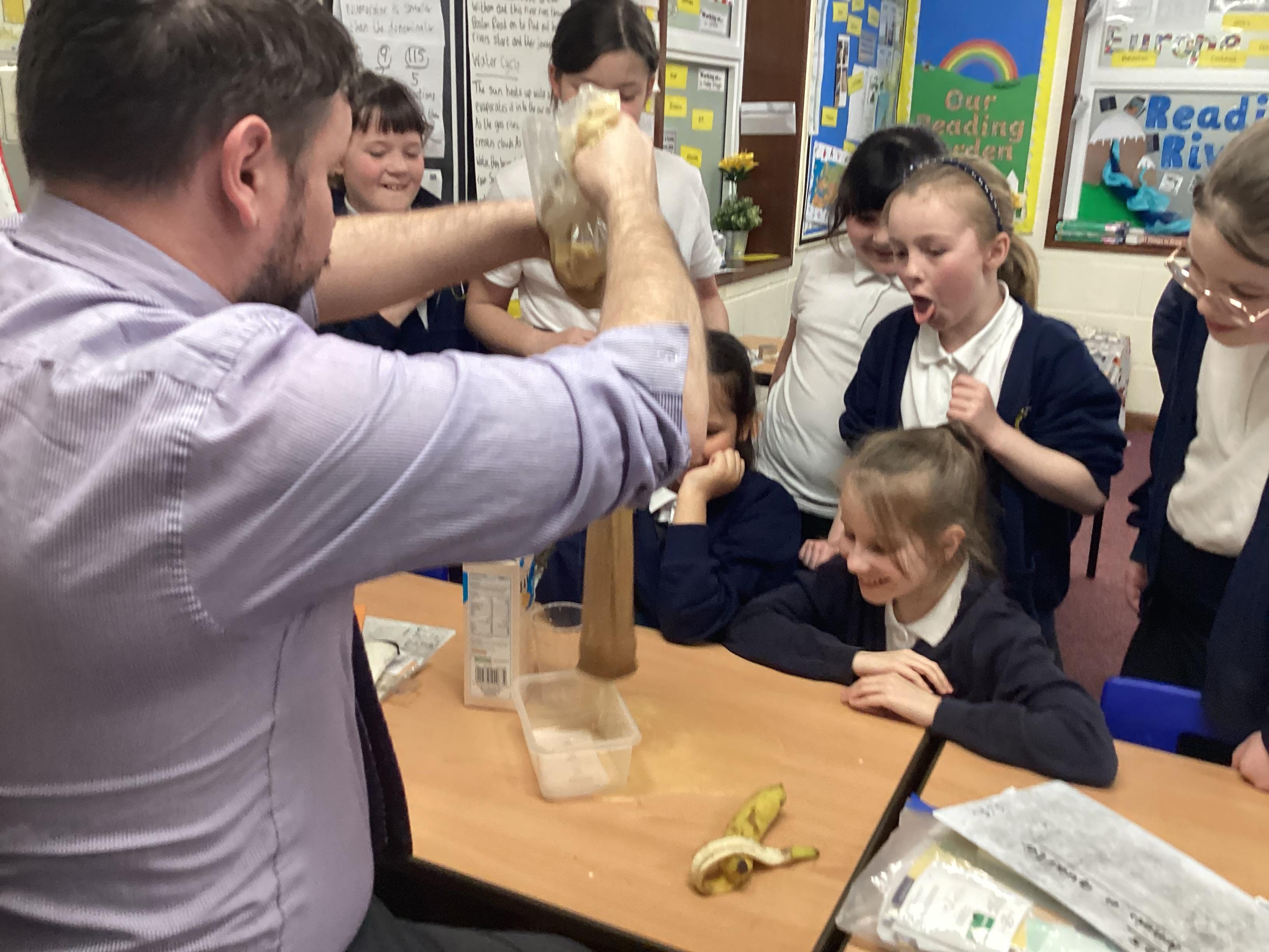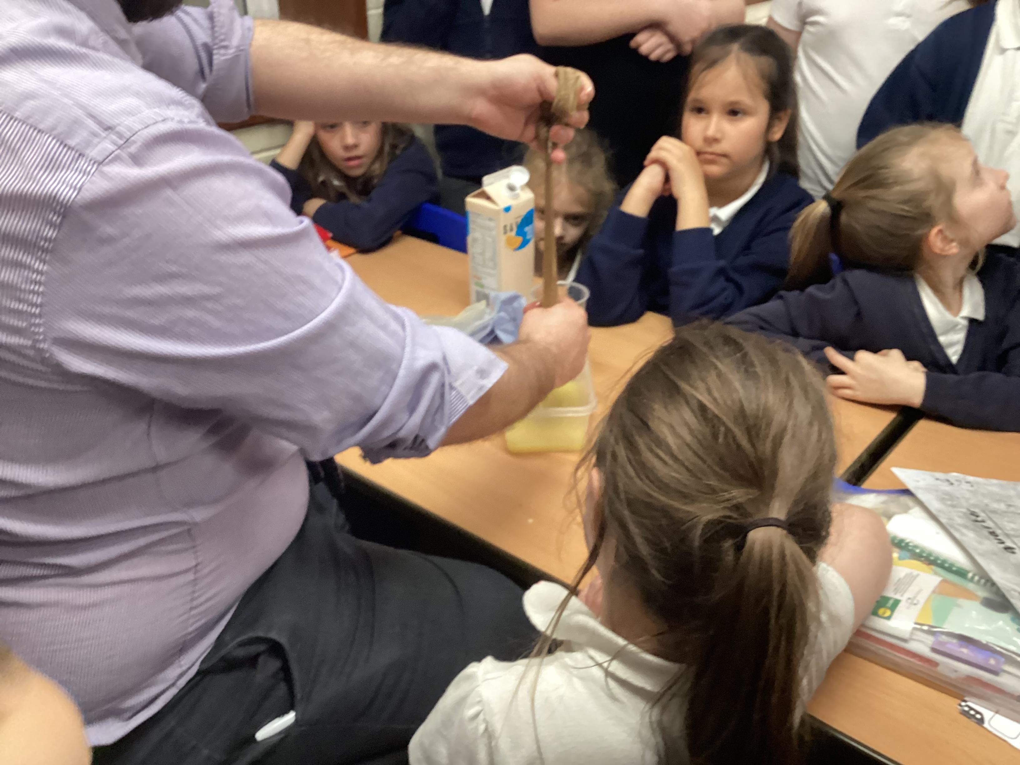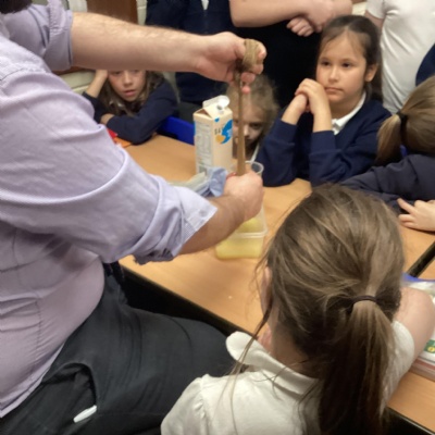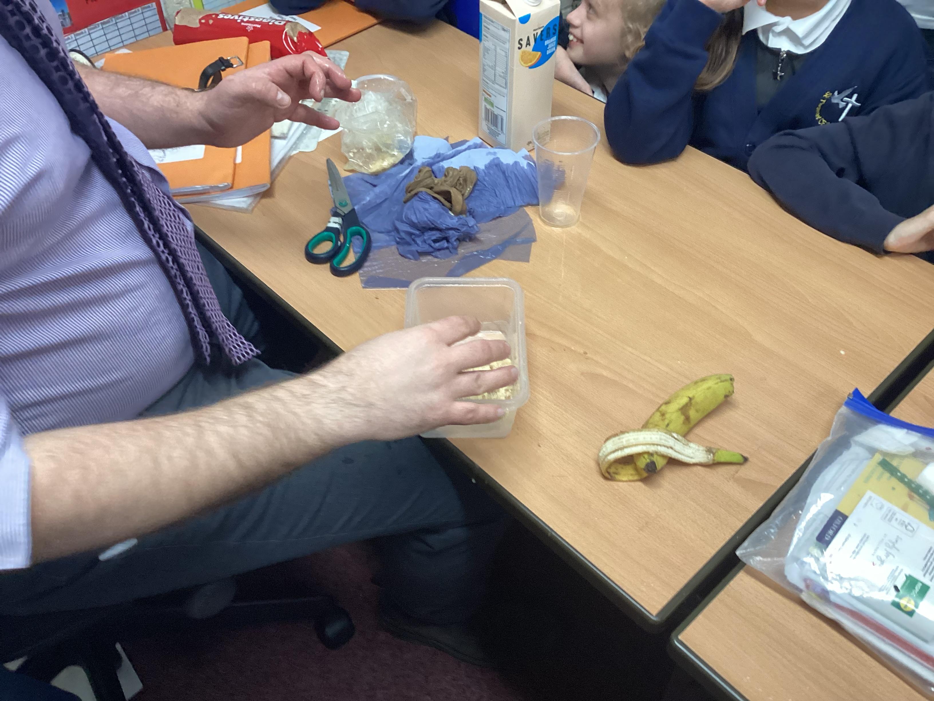 As part of our learning linking to animals, including humans, we have been looking at the digestive system and what actually happens when we eat food. This was a lively experiment with lots of gross sections…..which we loved! Using household items such as tights, bananas, biscuits and orange juice, we recreated the digestive process.