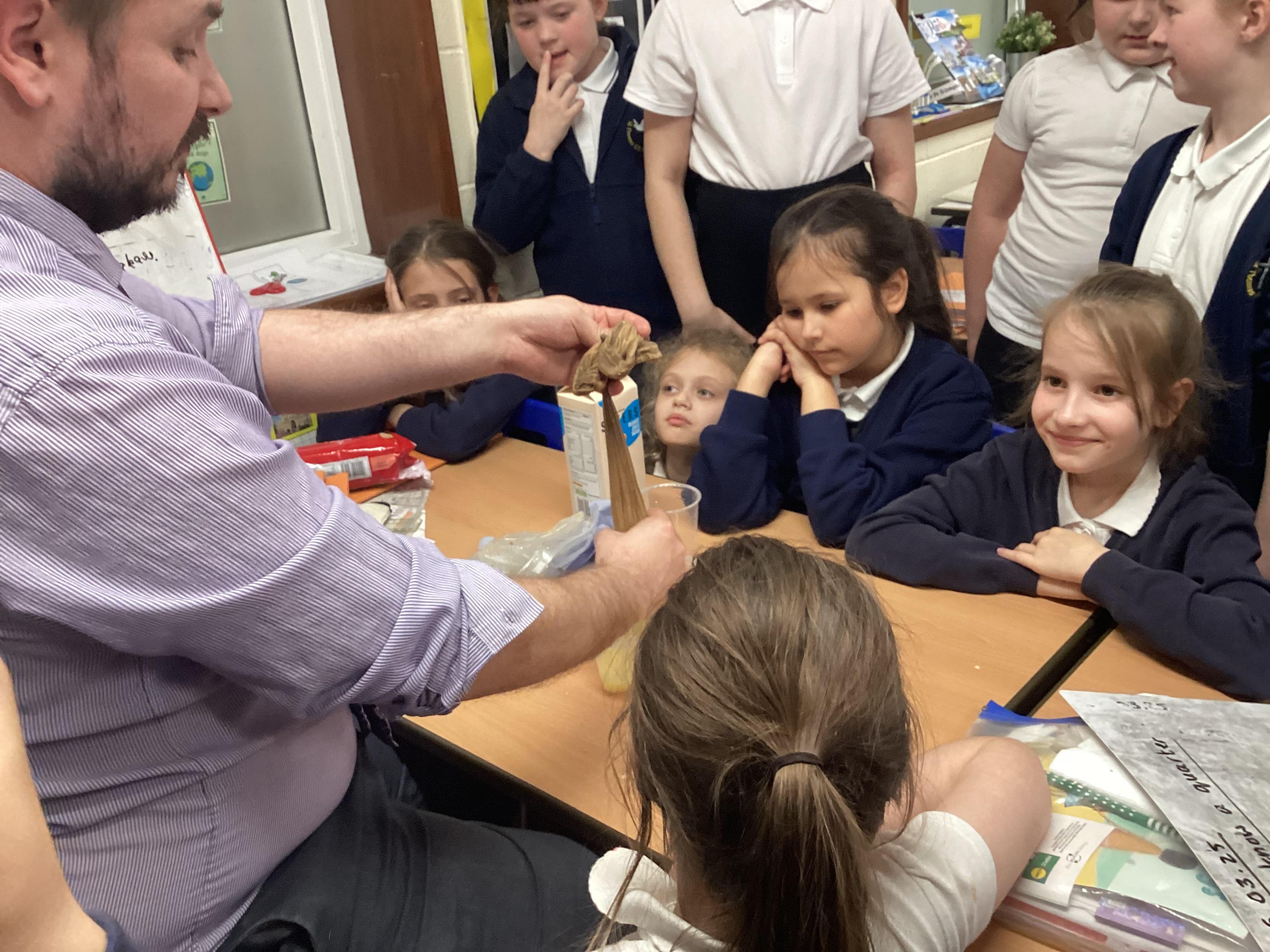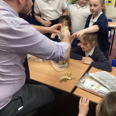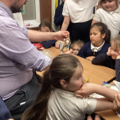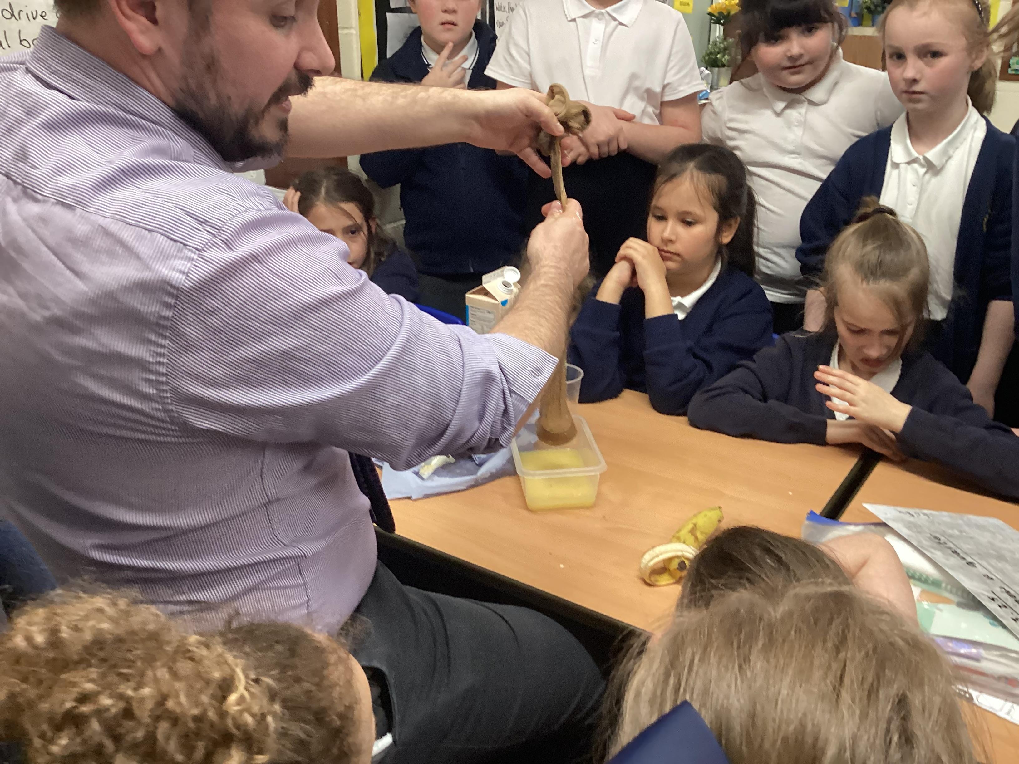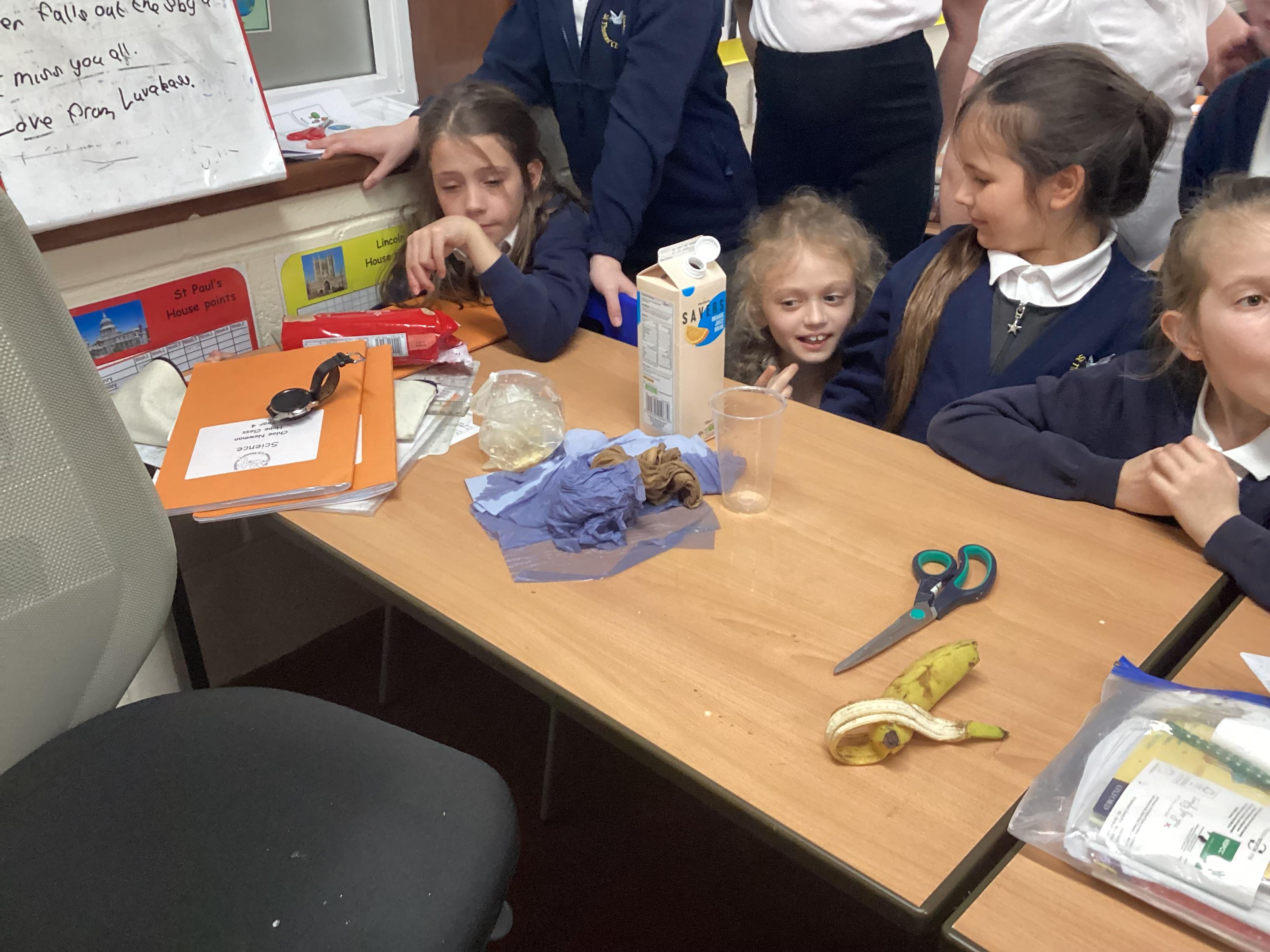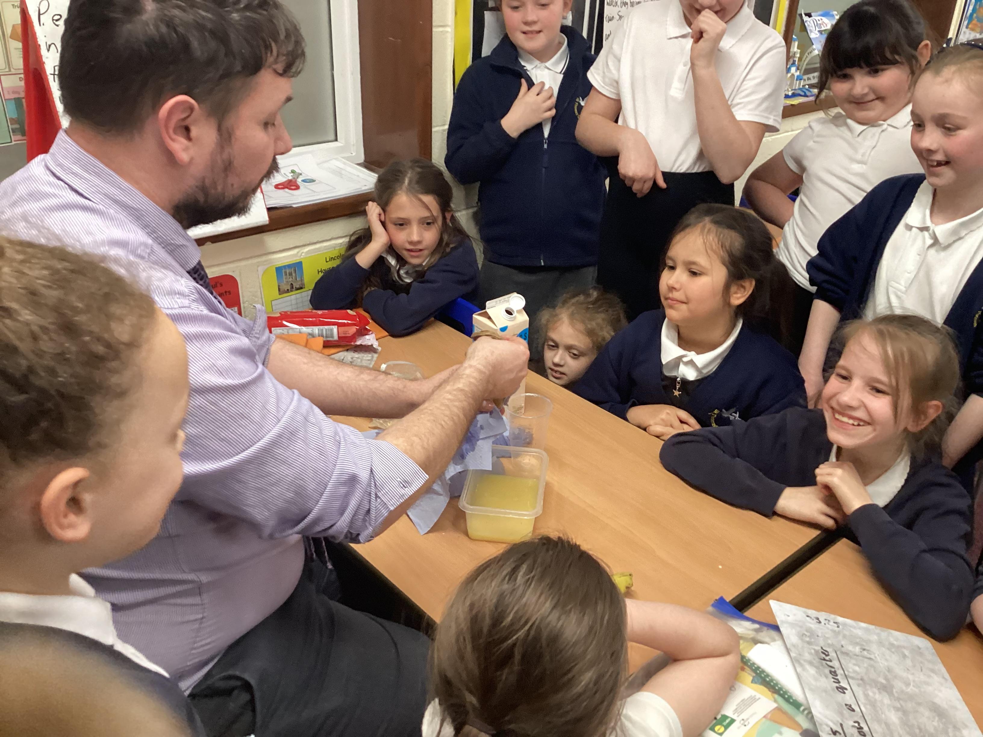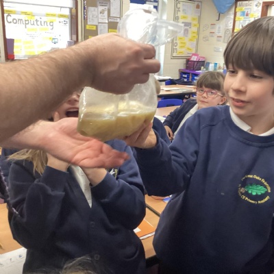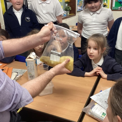 As part of our learning linking to animals, including humans, we have been looking at the digestive system and what actually happens when we eat food. This was a lively experiment with lots of gross sections…..which we loved! Using household items such as tights, bananas, biscuits and orange juice, we recreated the digestive process.