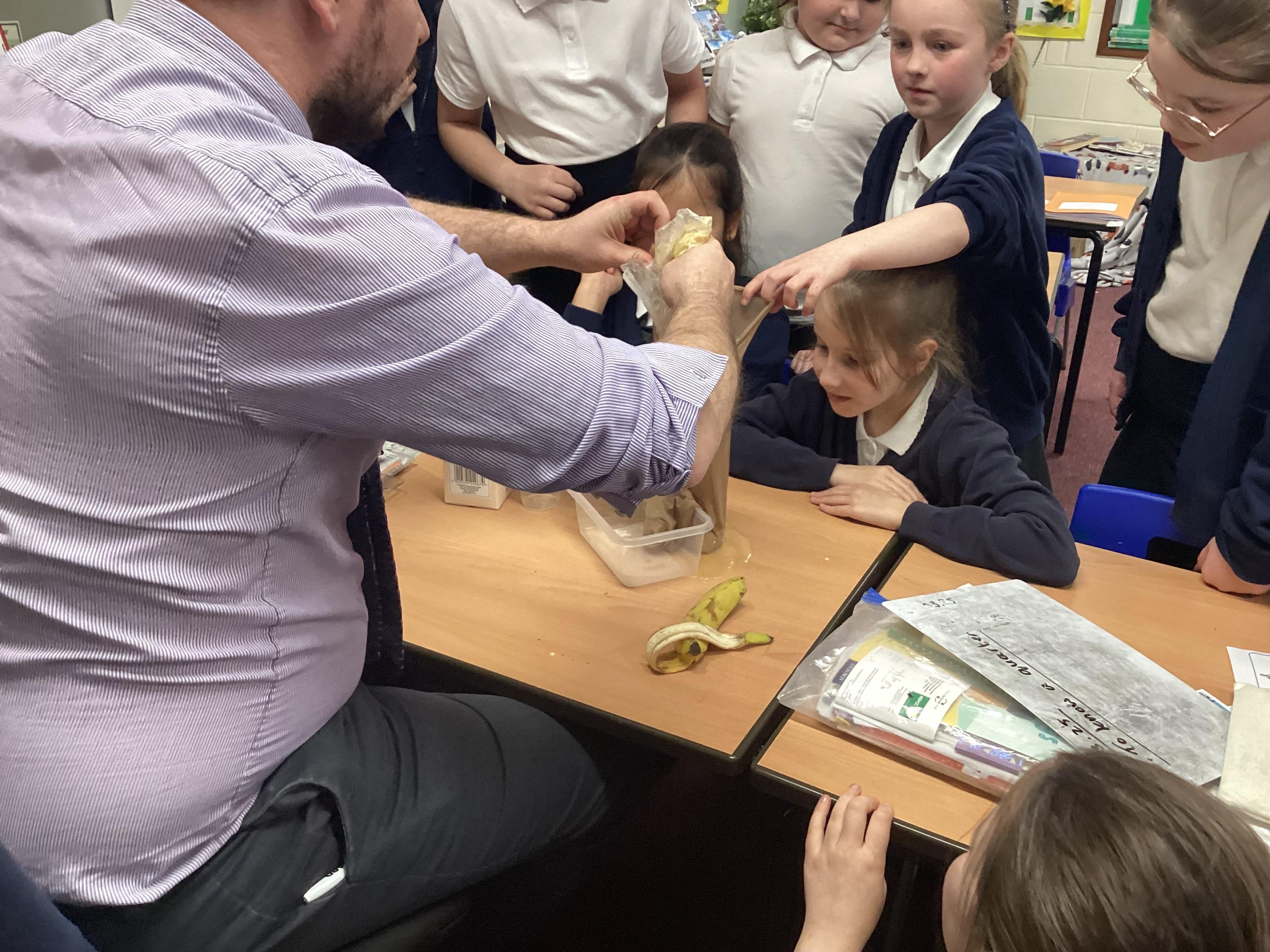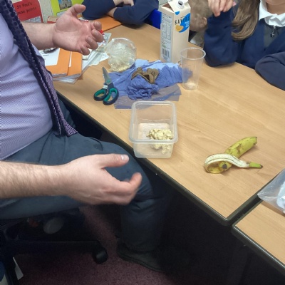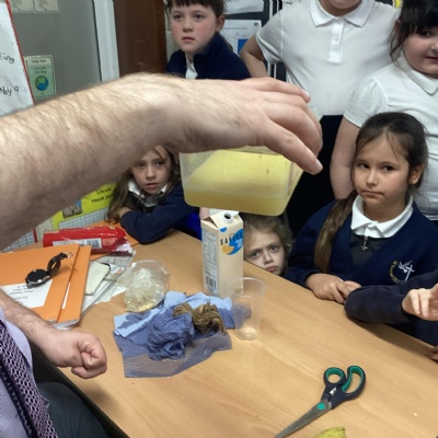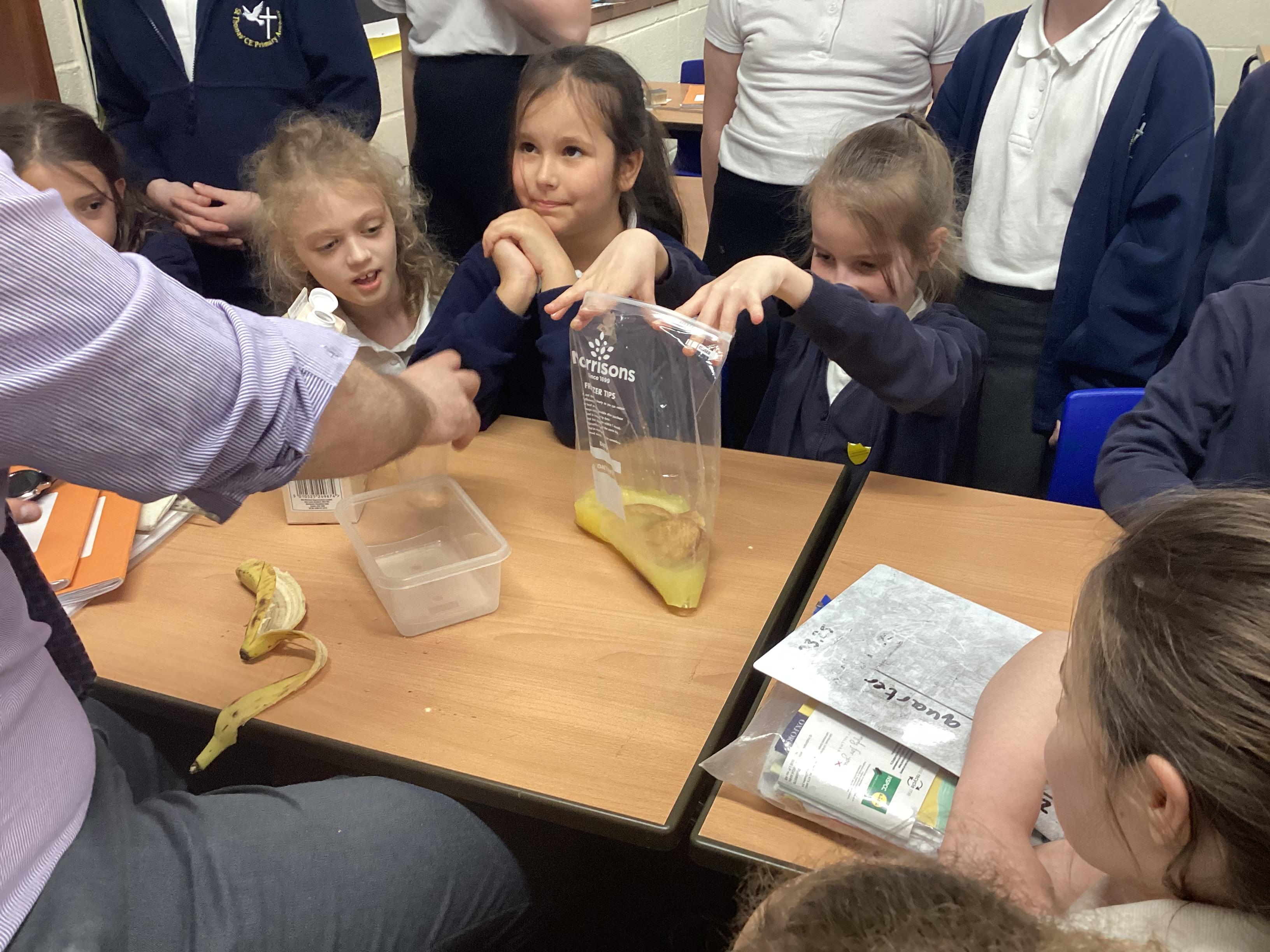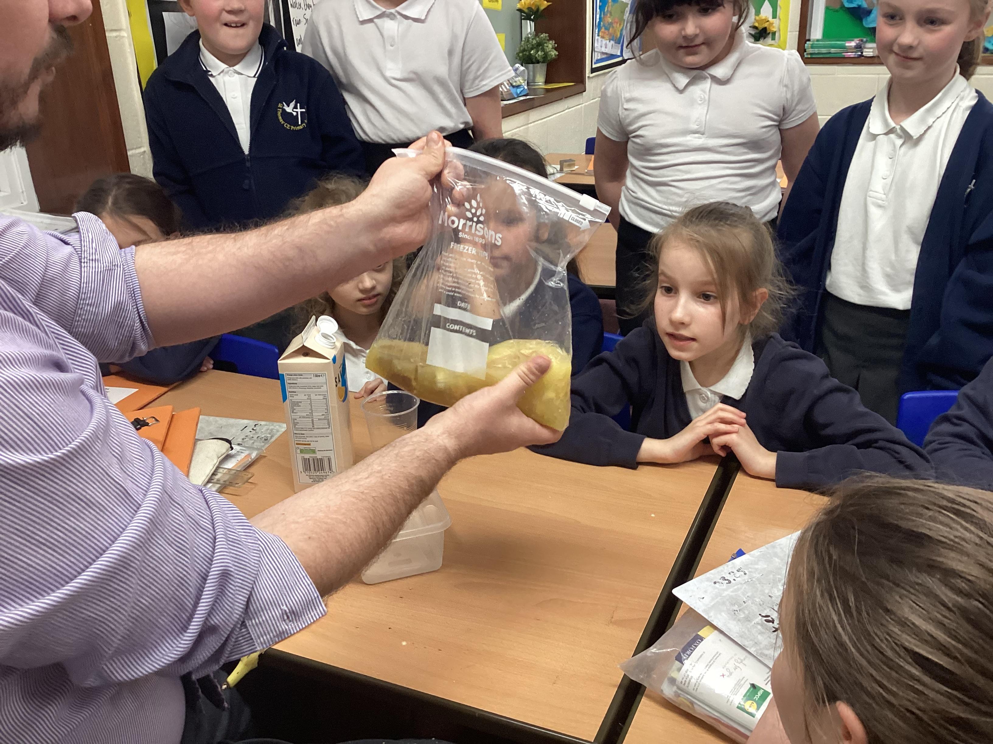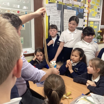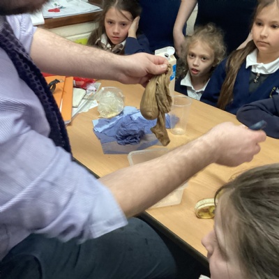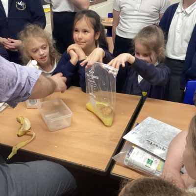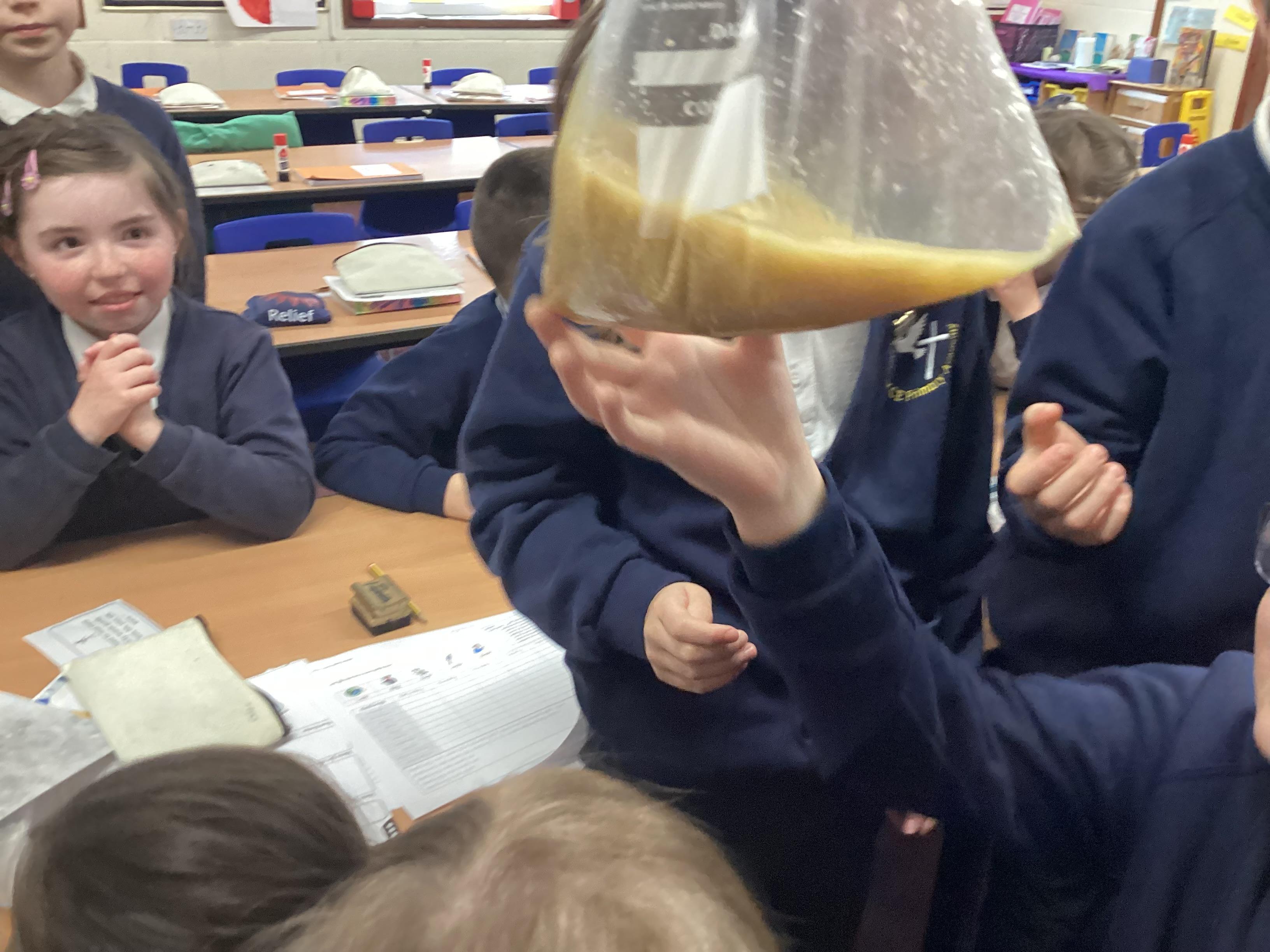 As part of our learning linking to animals, including humans, we have been looking at the digestive system and what actually happens when we eat food. This was a lively experiment with lots of gross sections…..which we loved! Using household items such as tights, bananas, biscuits and orange juice, we recreated the digestive process.