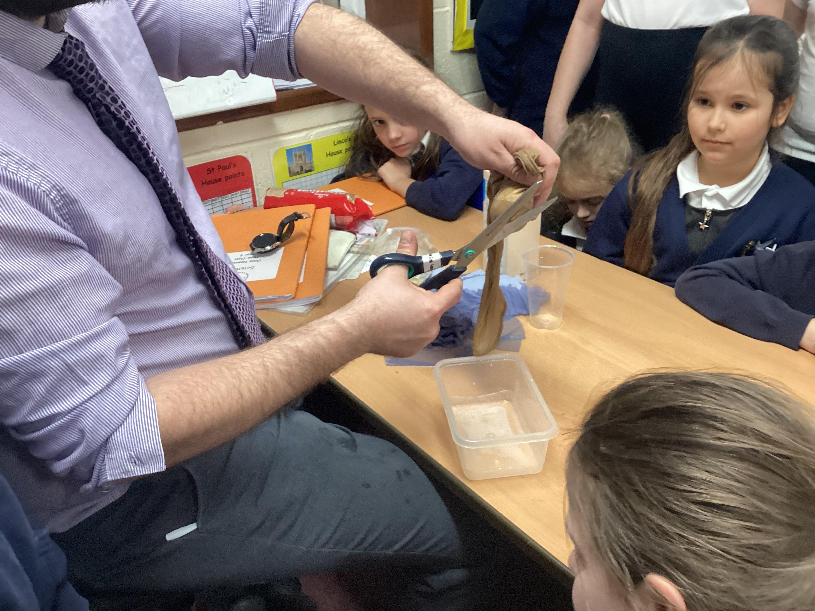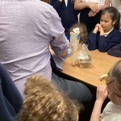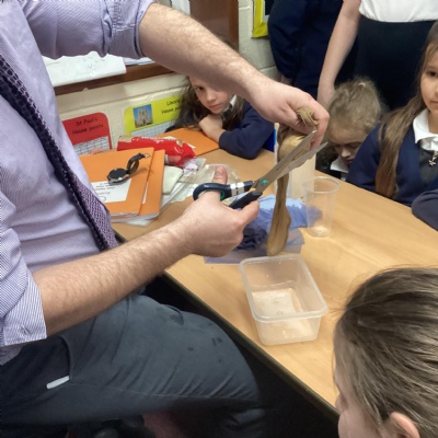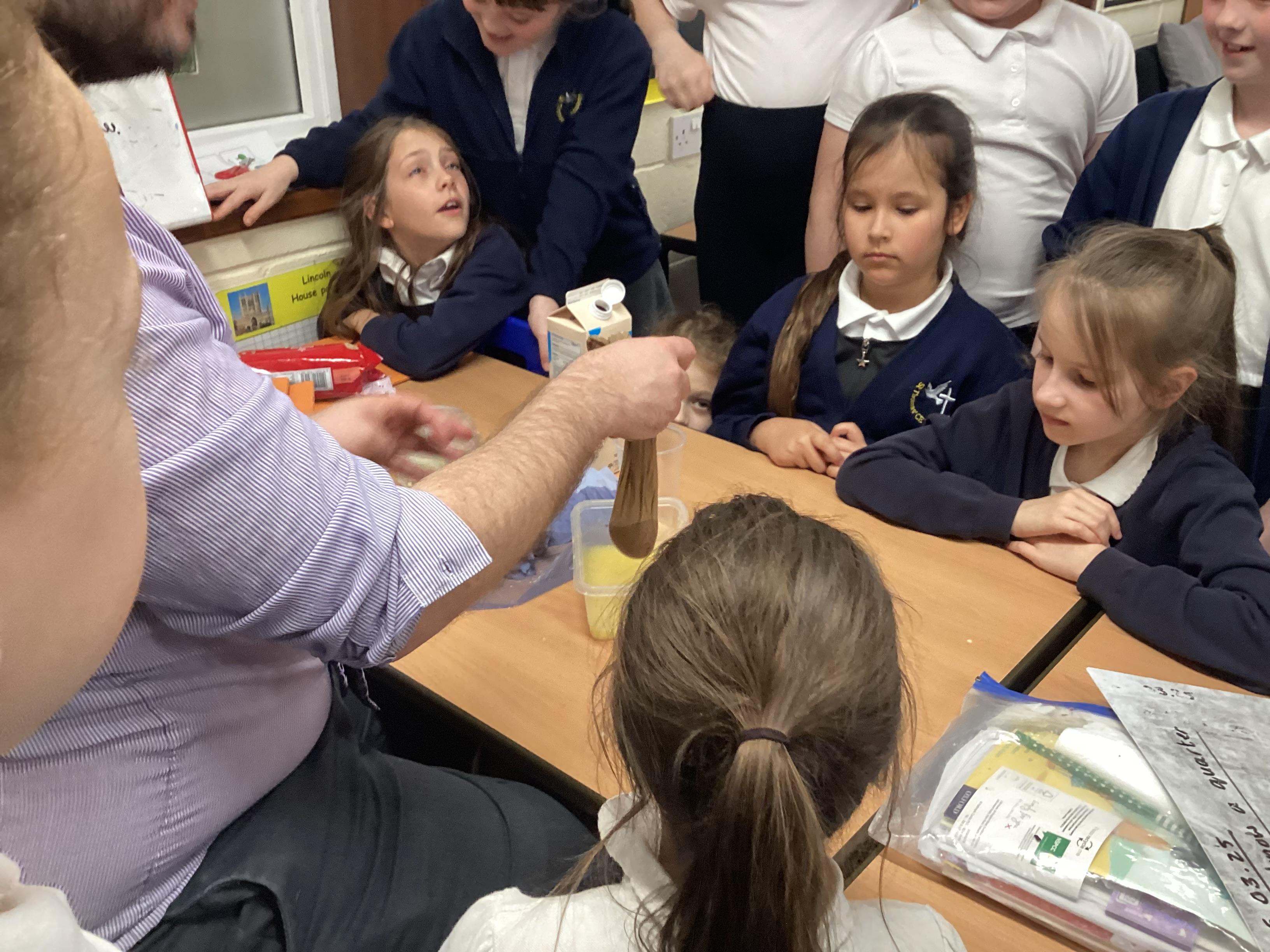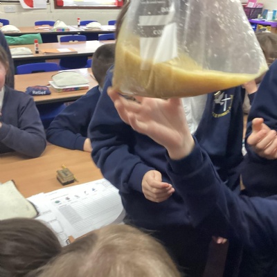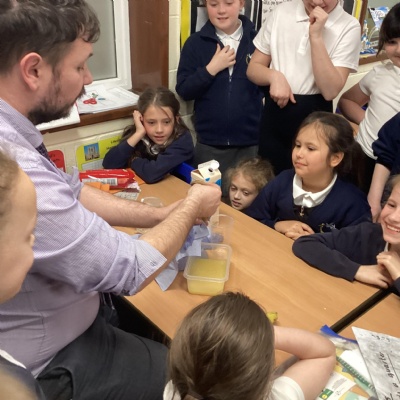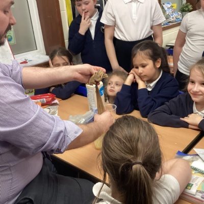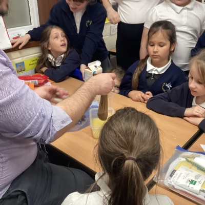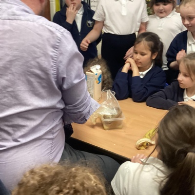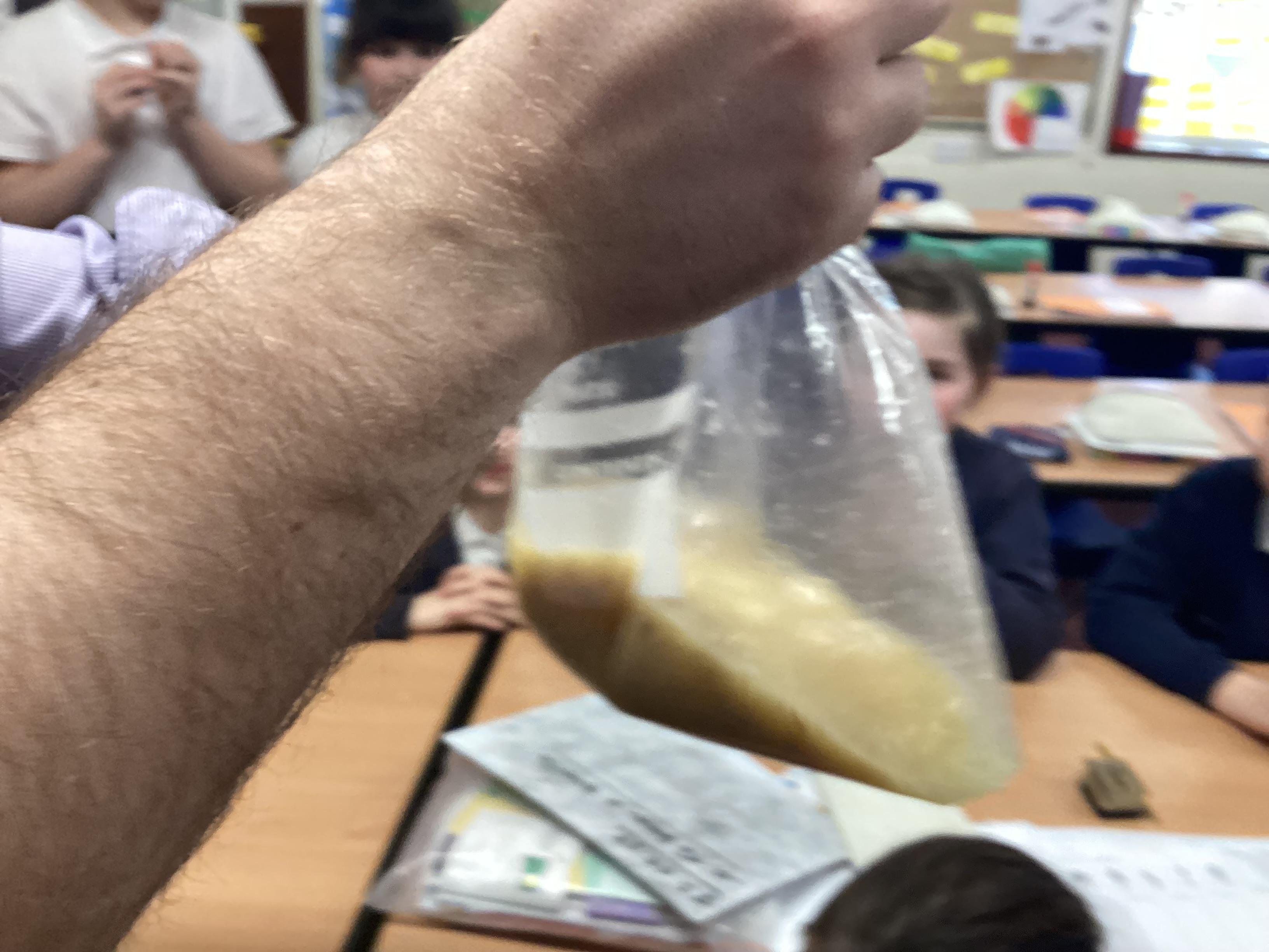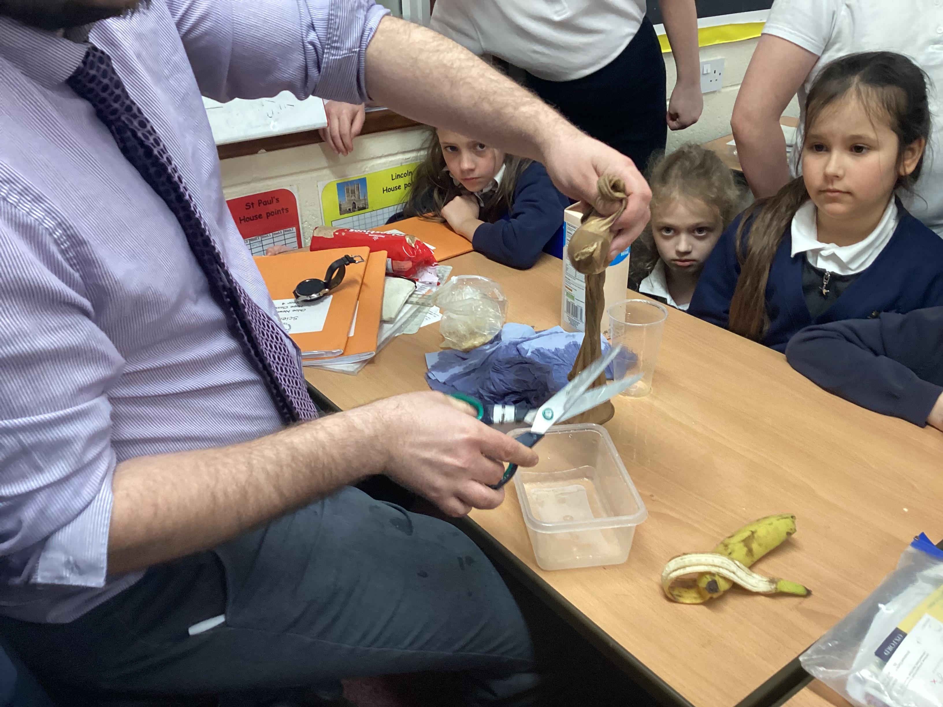 As part of our learning linking to animals, including humans, we have been looking at the digestive system and what actually happens when we eat food. This was a lively experiment with lots of gross sections…..which we loved! Using household items such as tights, bananas, biscuits and orange juice, we recreated the digestive process.
