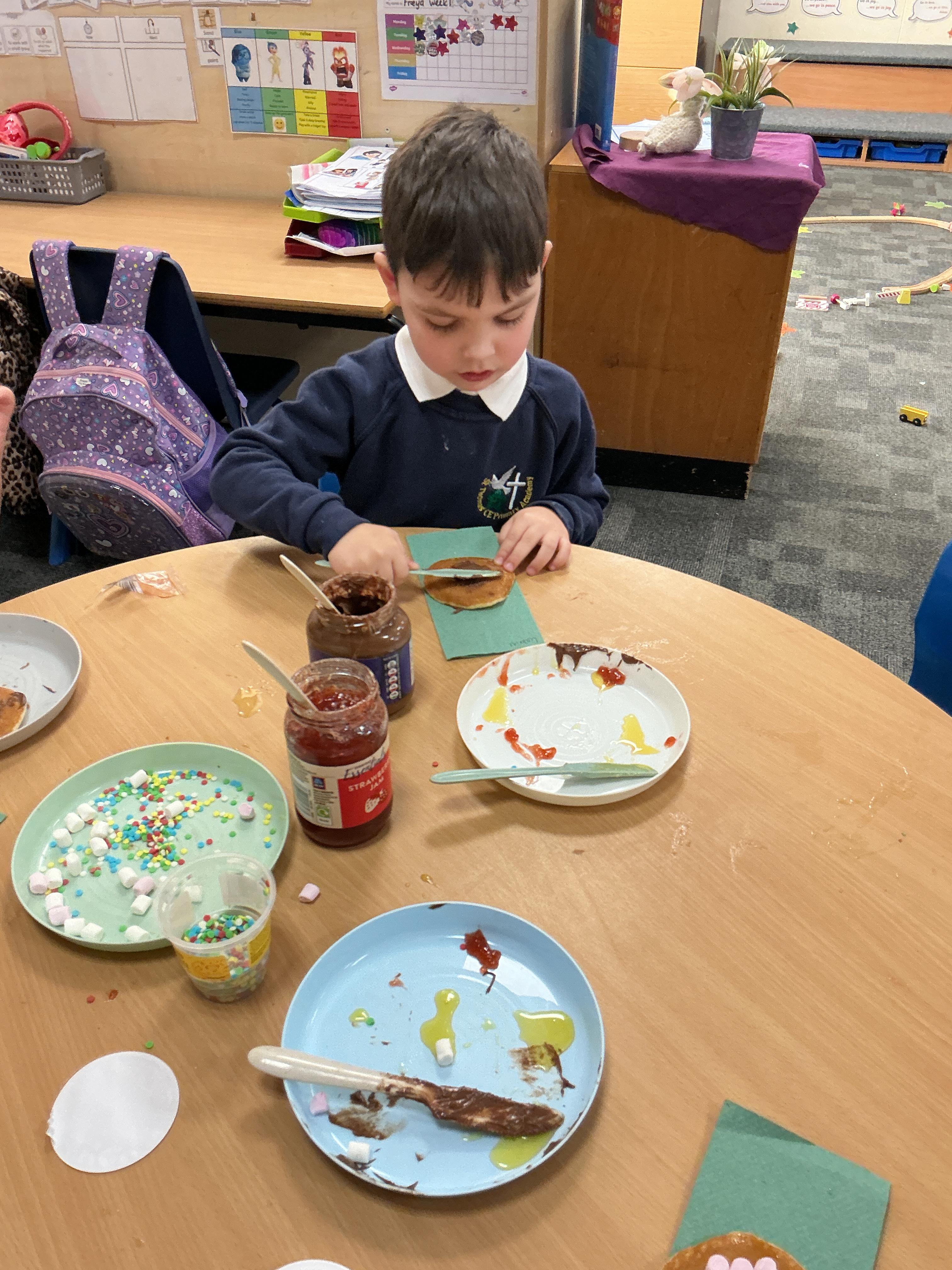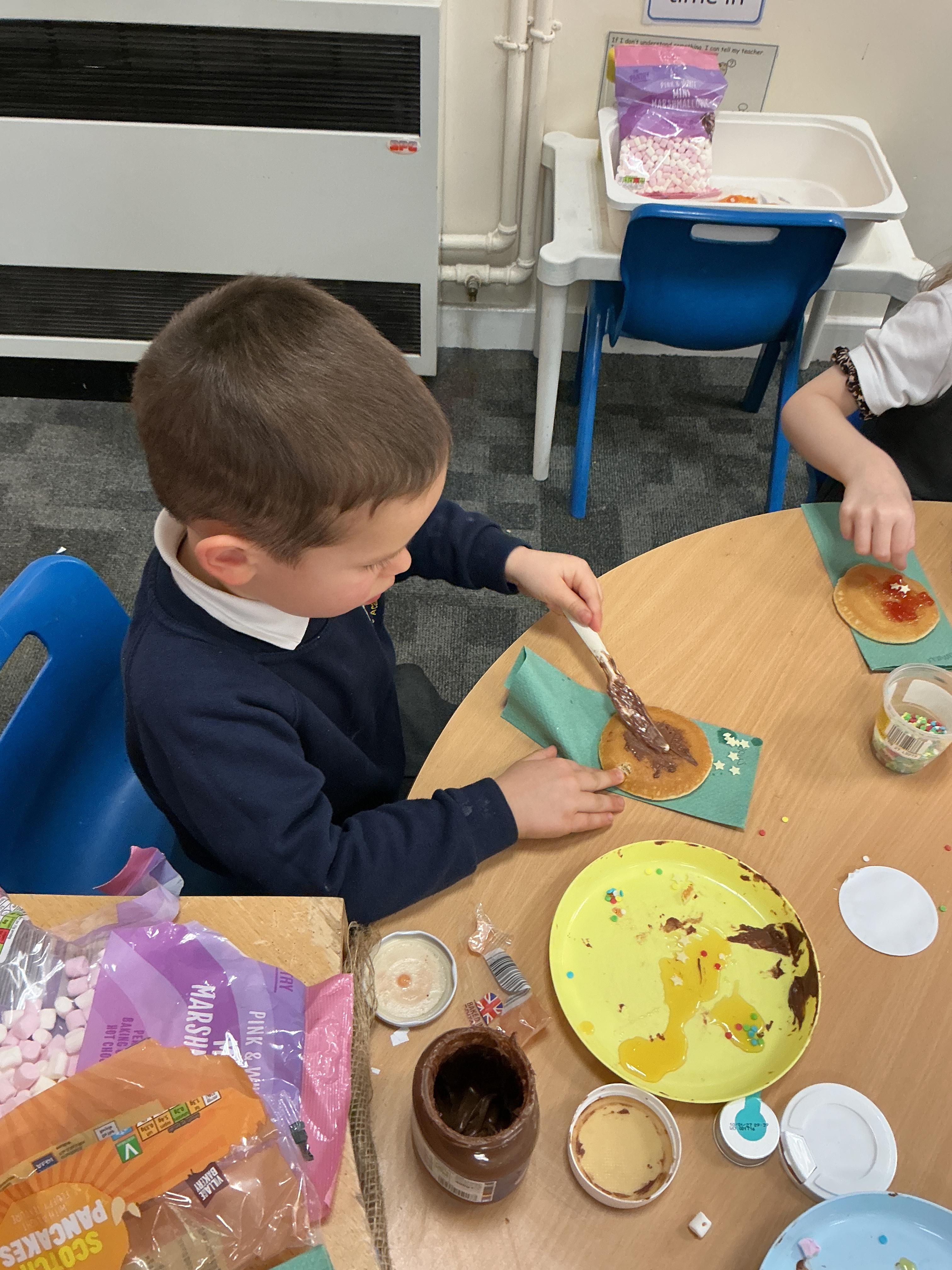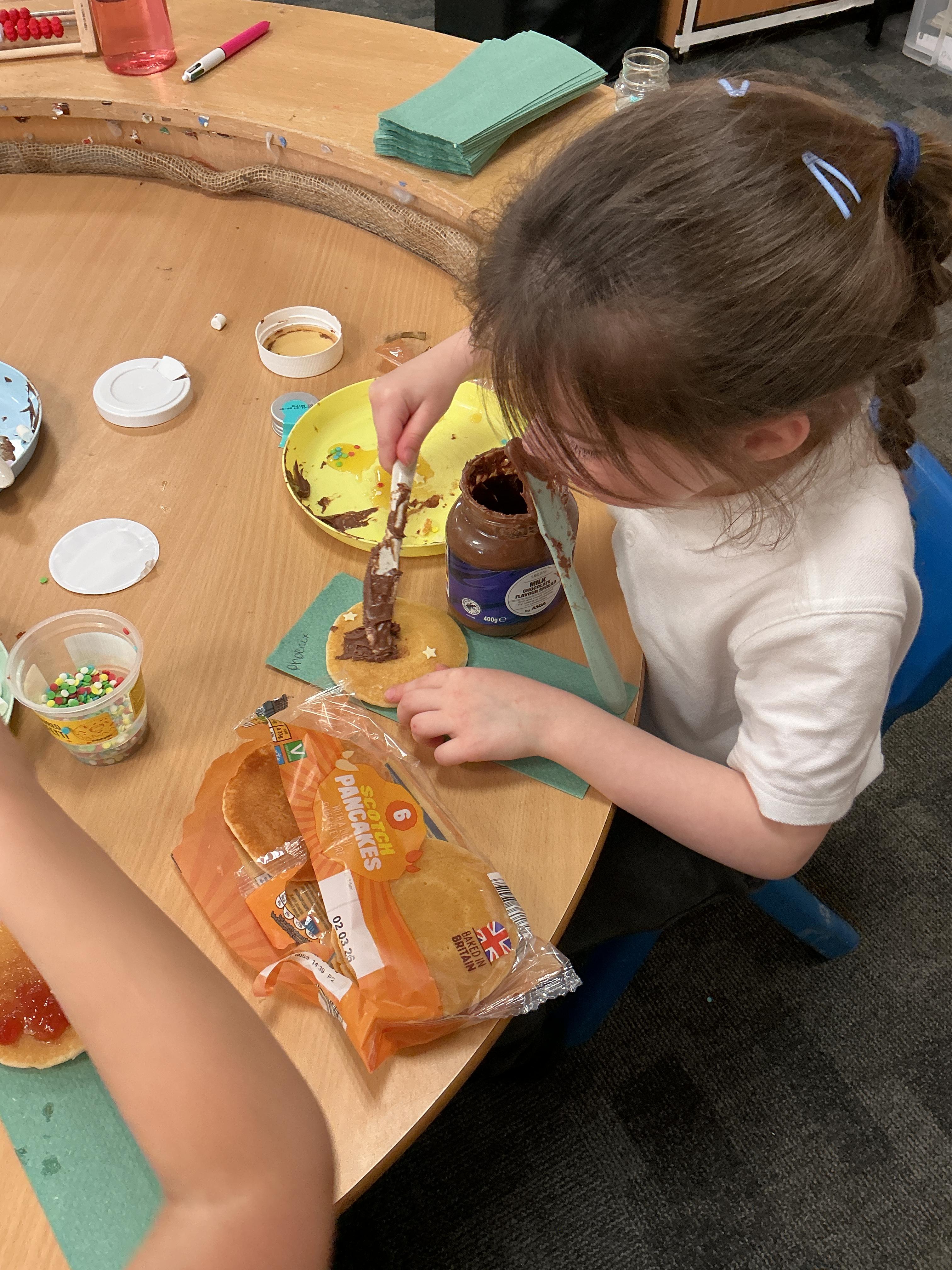 This week we have read the story 'Mr Wolf's pancakes'. The children have been busy making pretend pancakes, counting the toppings on pancakes, decorating pancakes and writing some instructions down. Once we had all decorated our pancakes, we sat down together and enjoyed eating them!