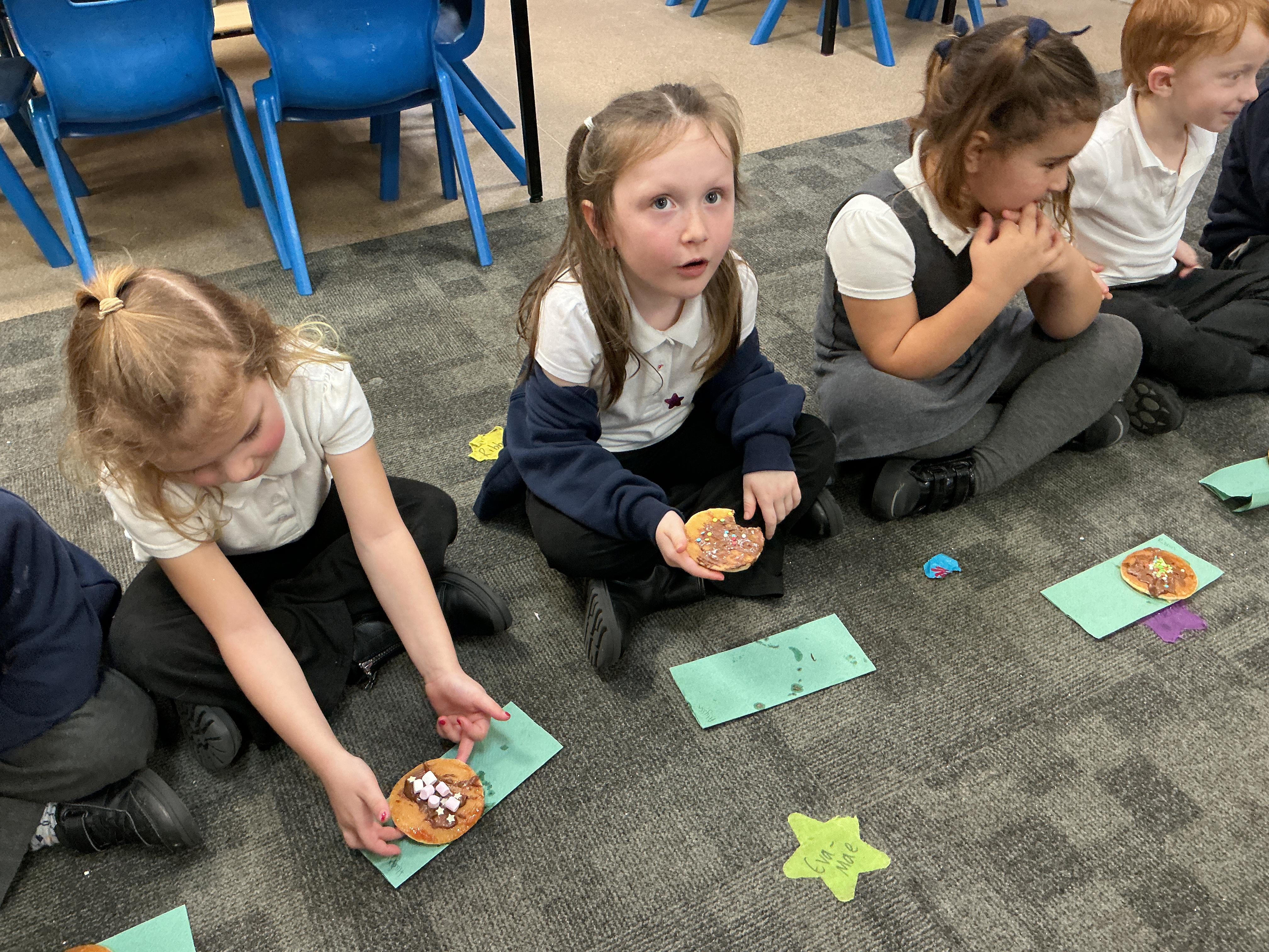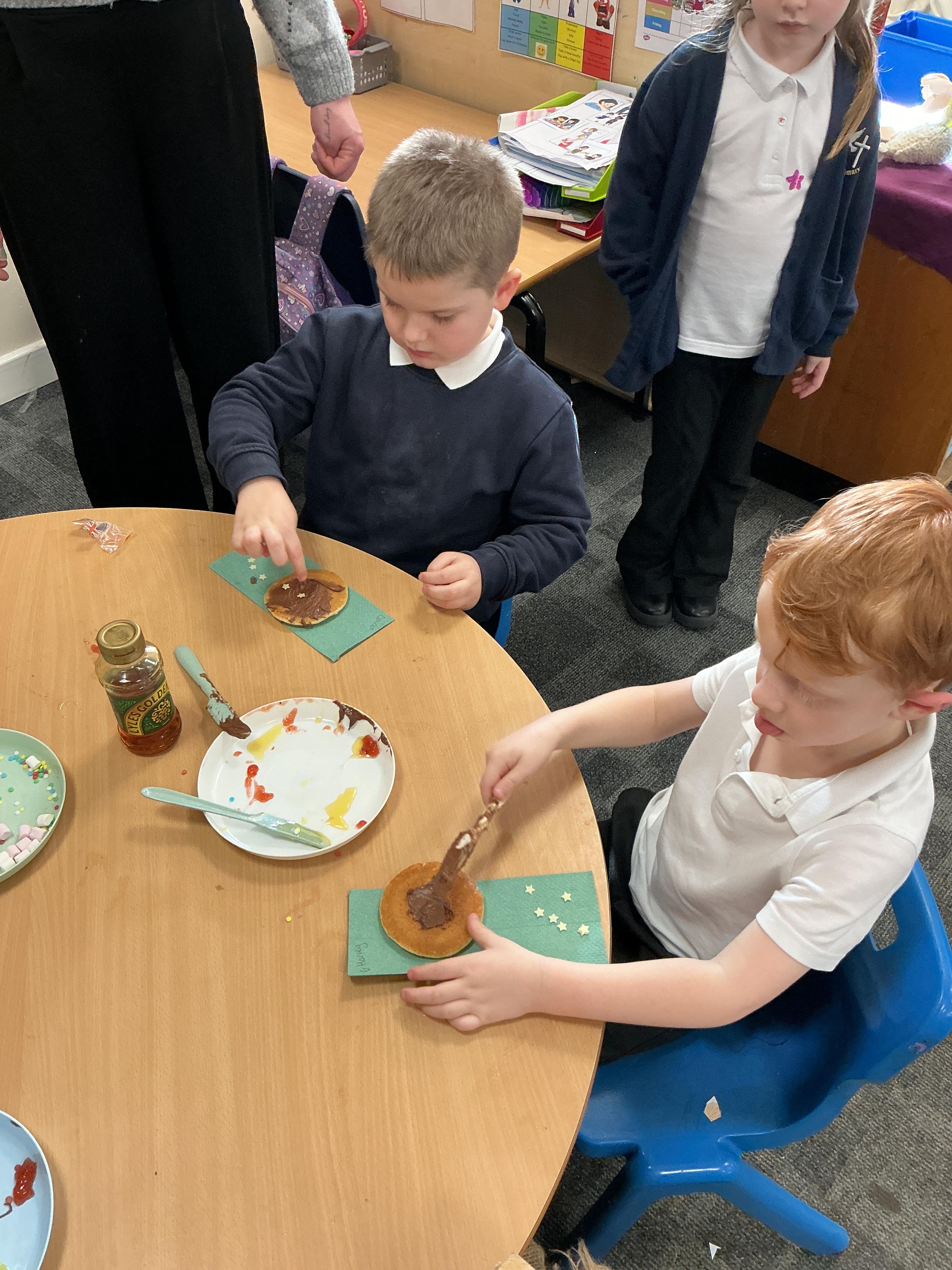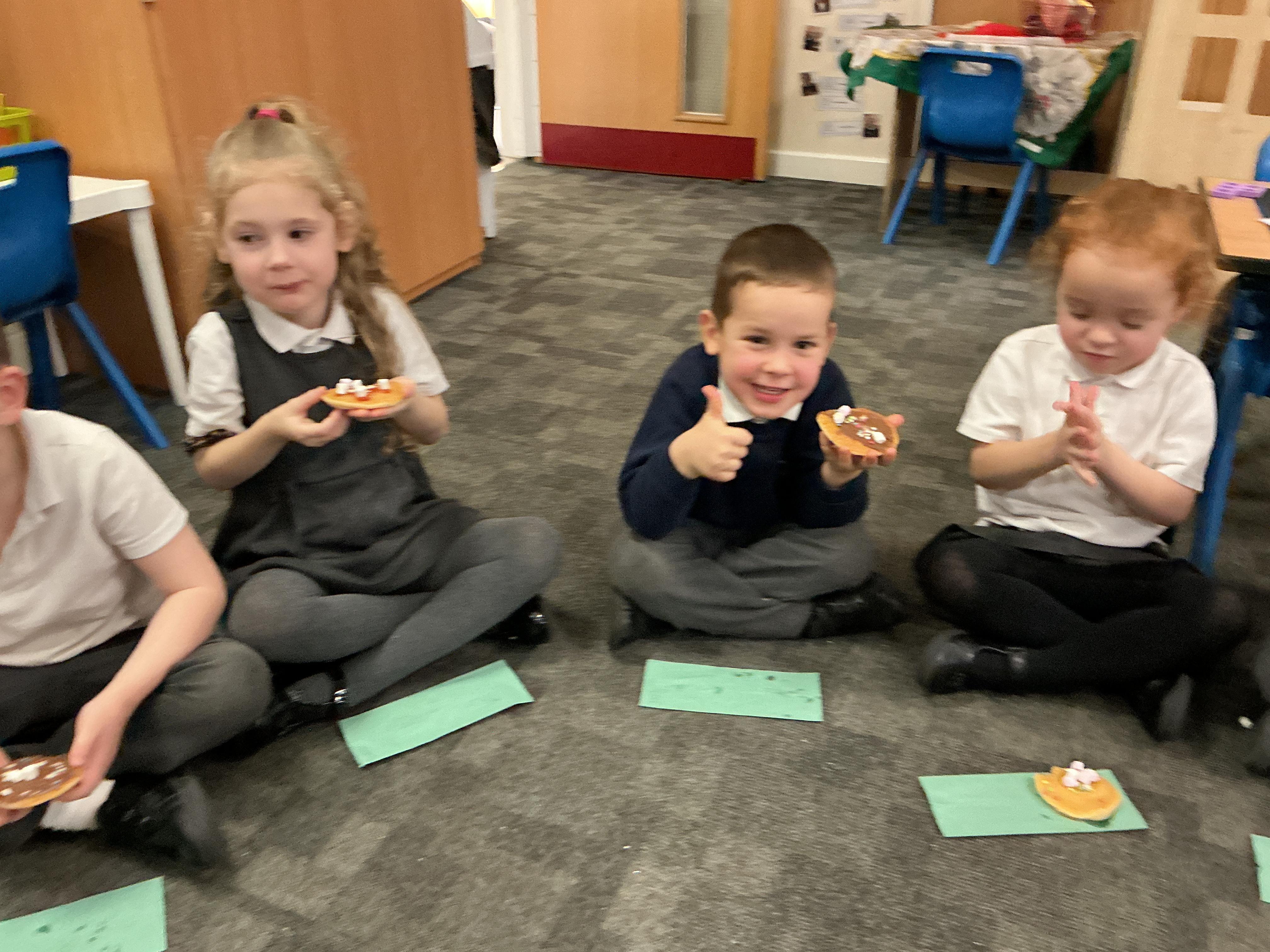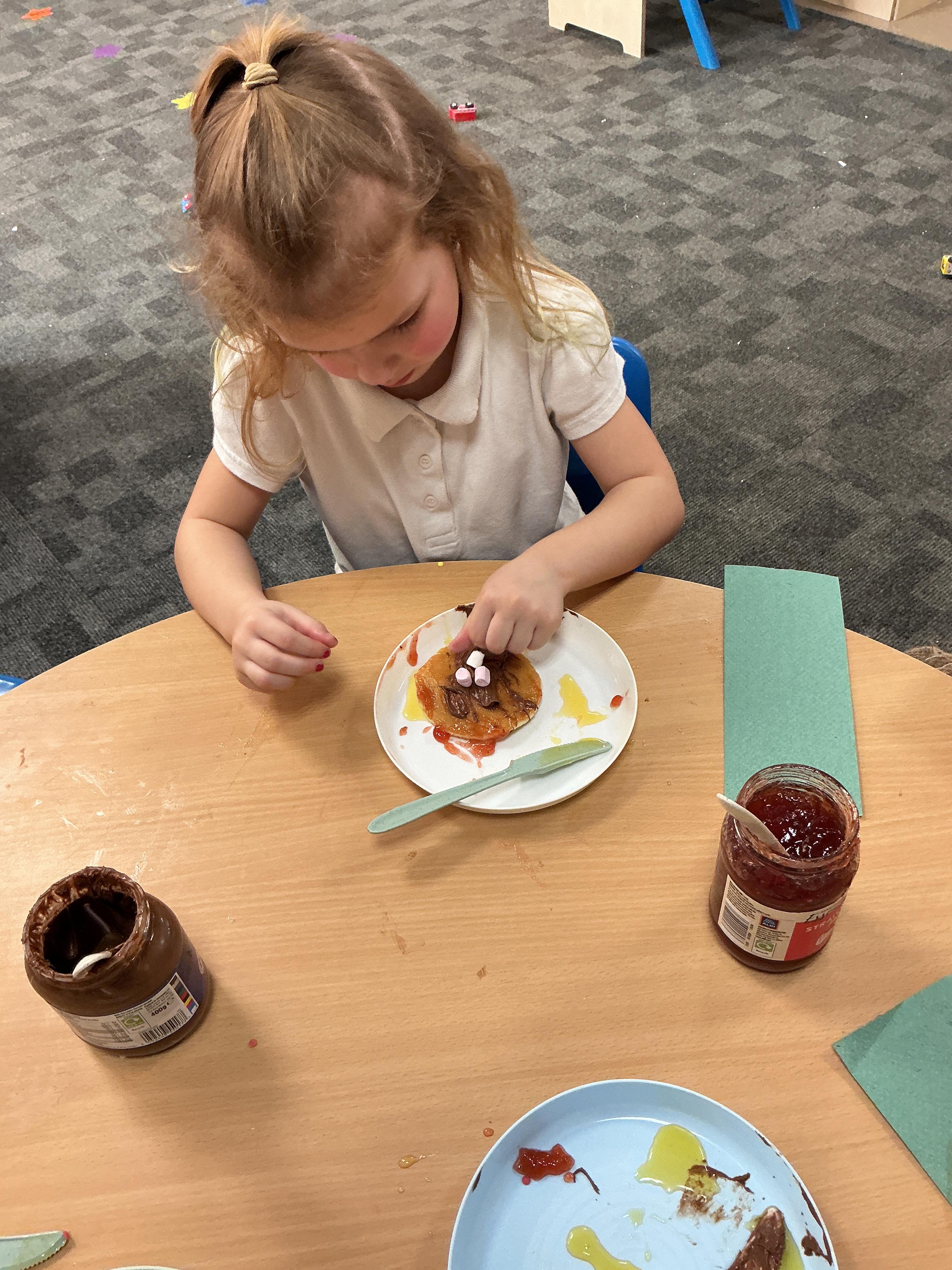 This week we have read the story 'Mr Wolf's pancakes'. The children have been busy making pretend pancakes, counting the toppings on pancakes, decorating pancakes and writing some instructions down. Once we had all decorated our pancakes, we sat down together and enjoyed eating them!