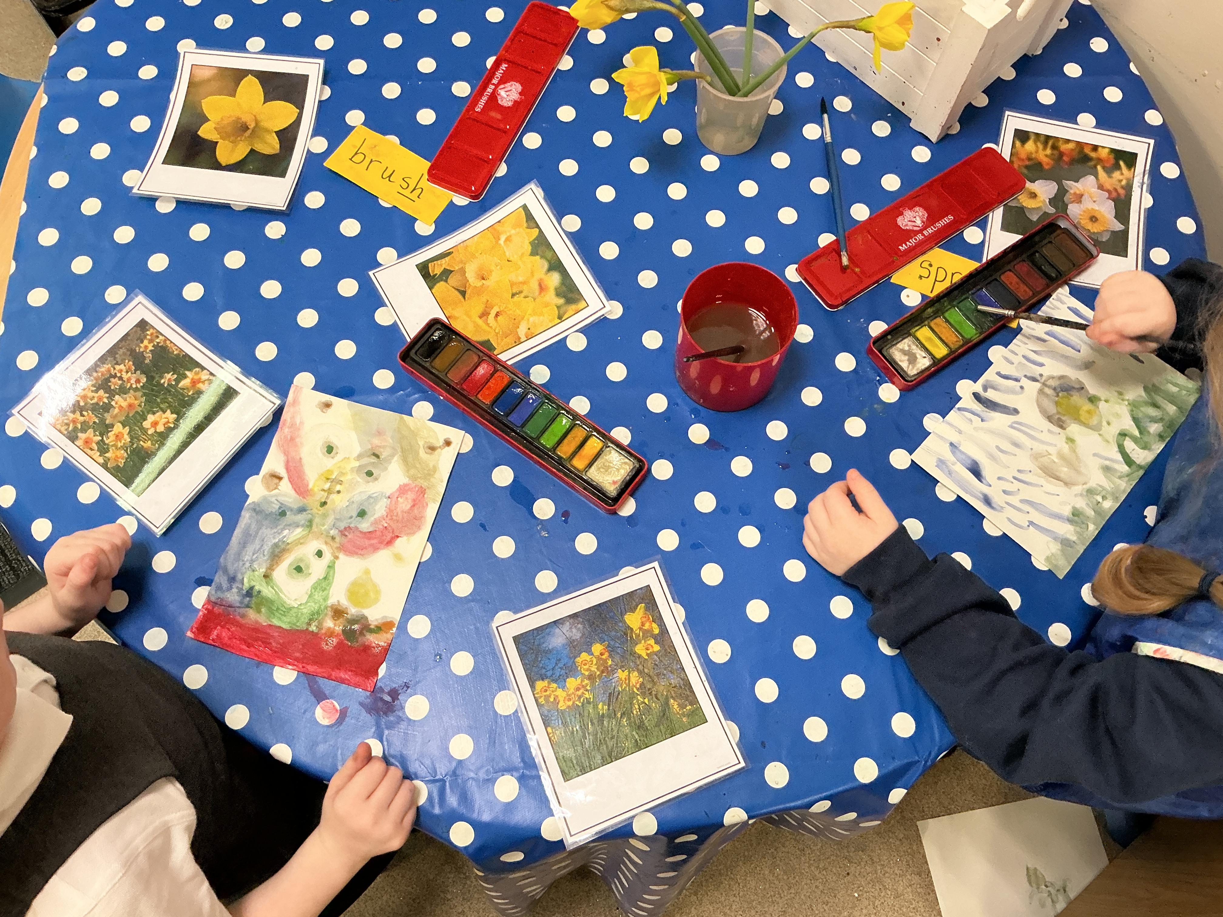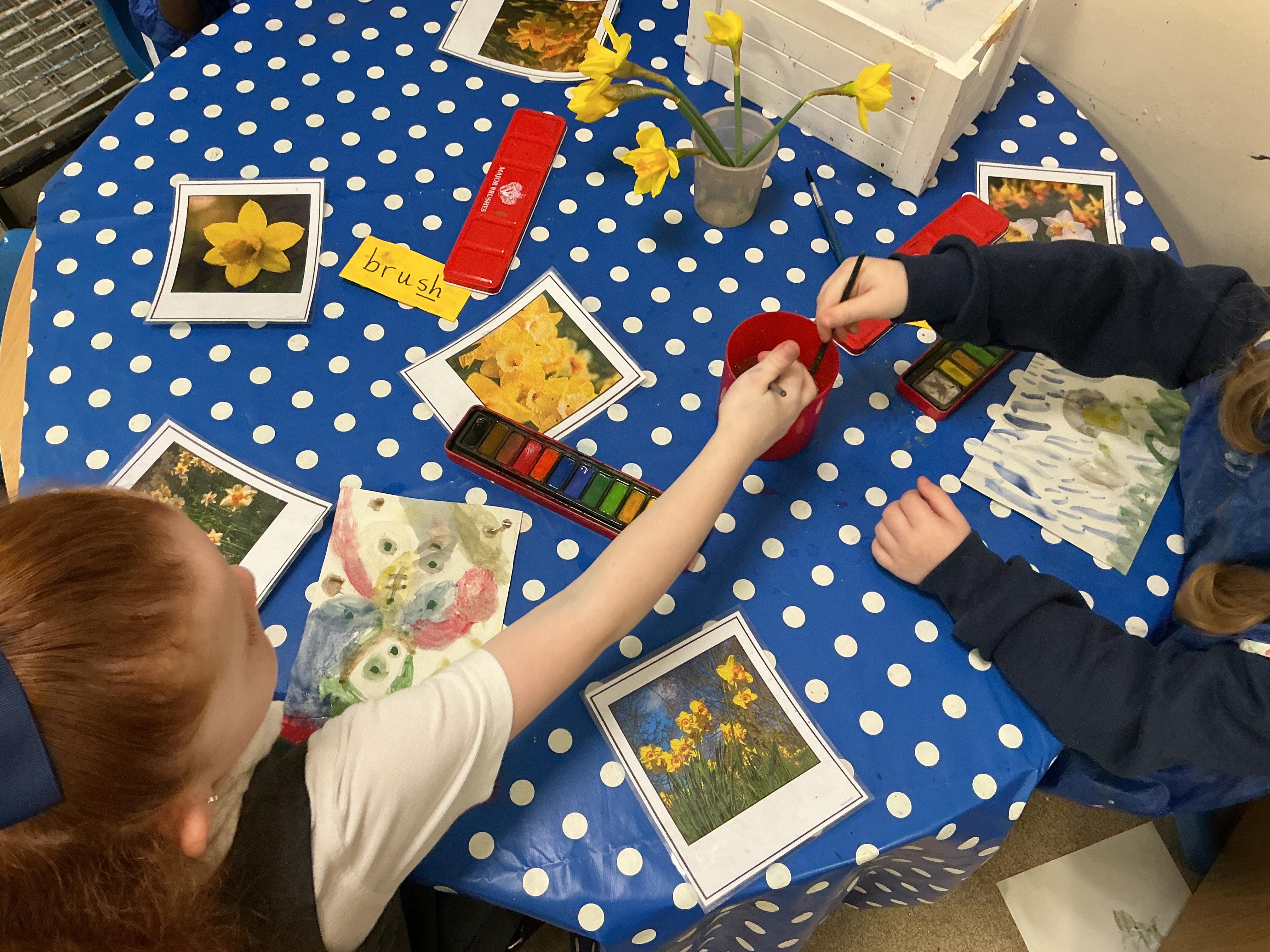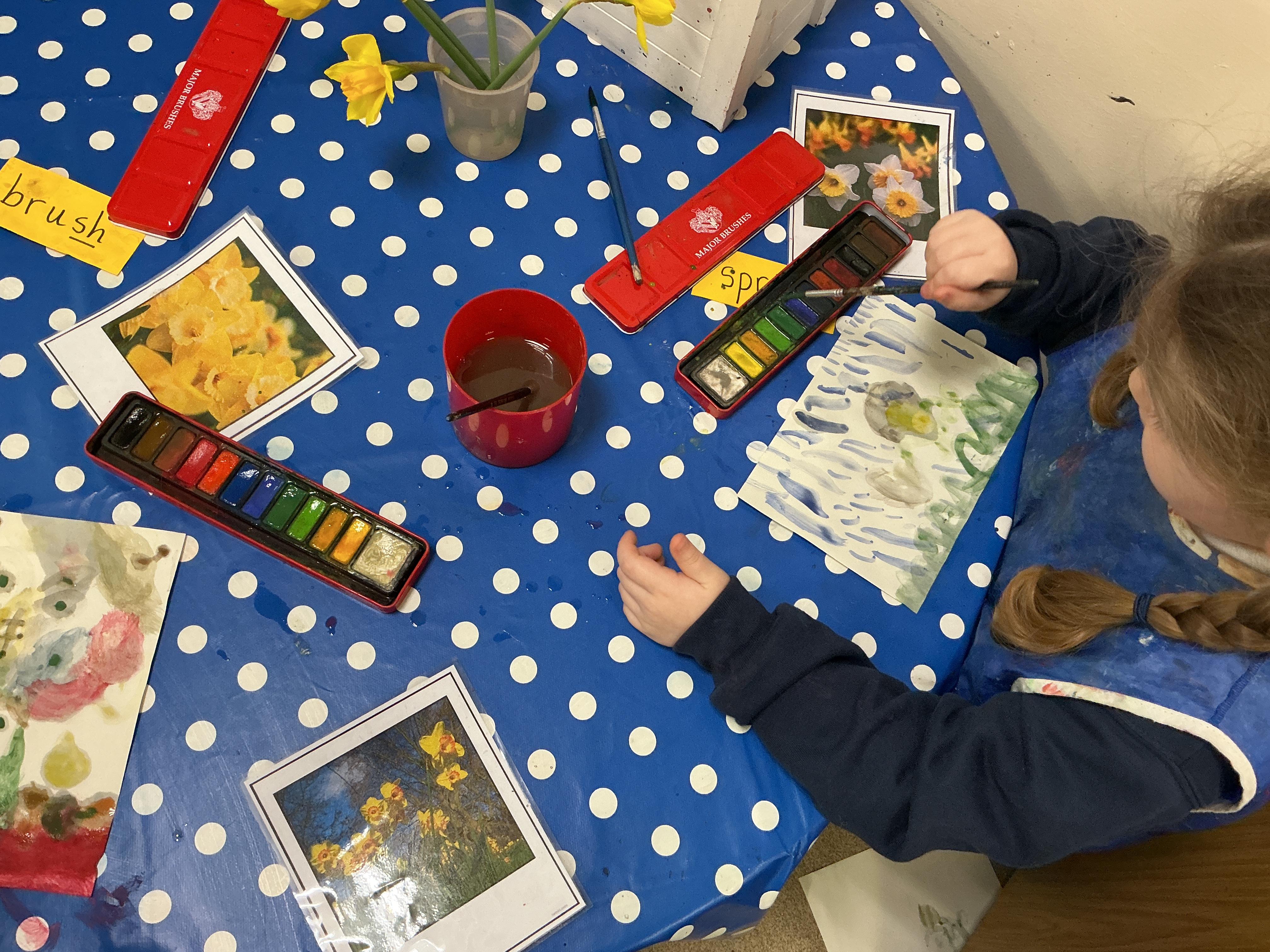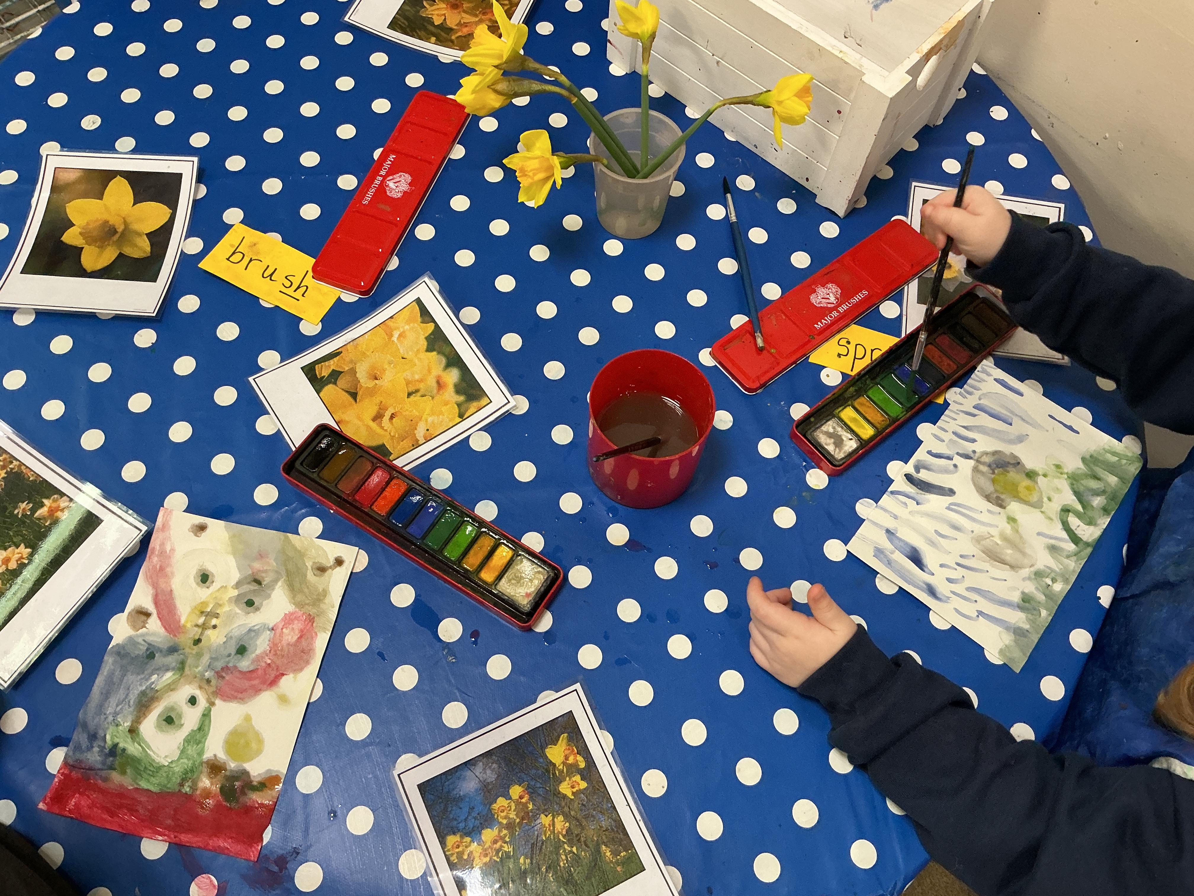 The children noticed whilst being outside this week how the weather is beginning to change. They went searching for some signs of spring and identified that some flowers are beginning to grow. The children enjoyed painting pictures of daffodils using the water colours once back inside.