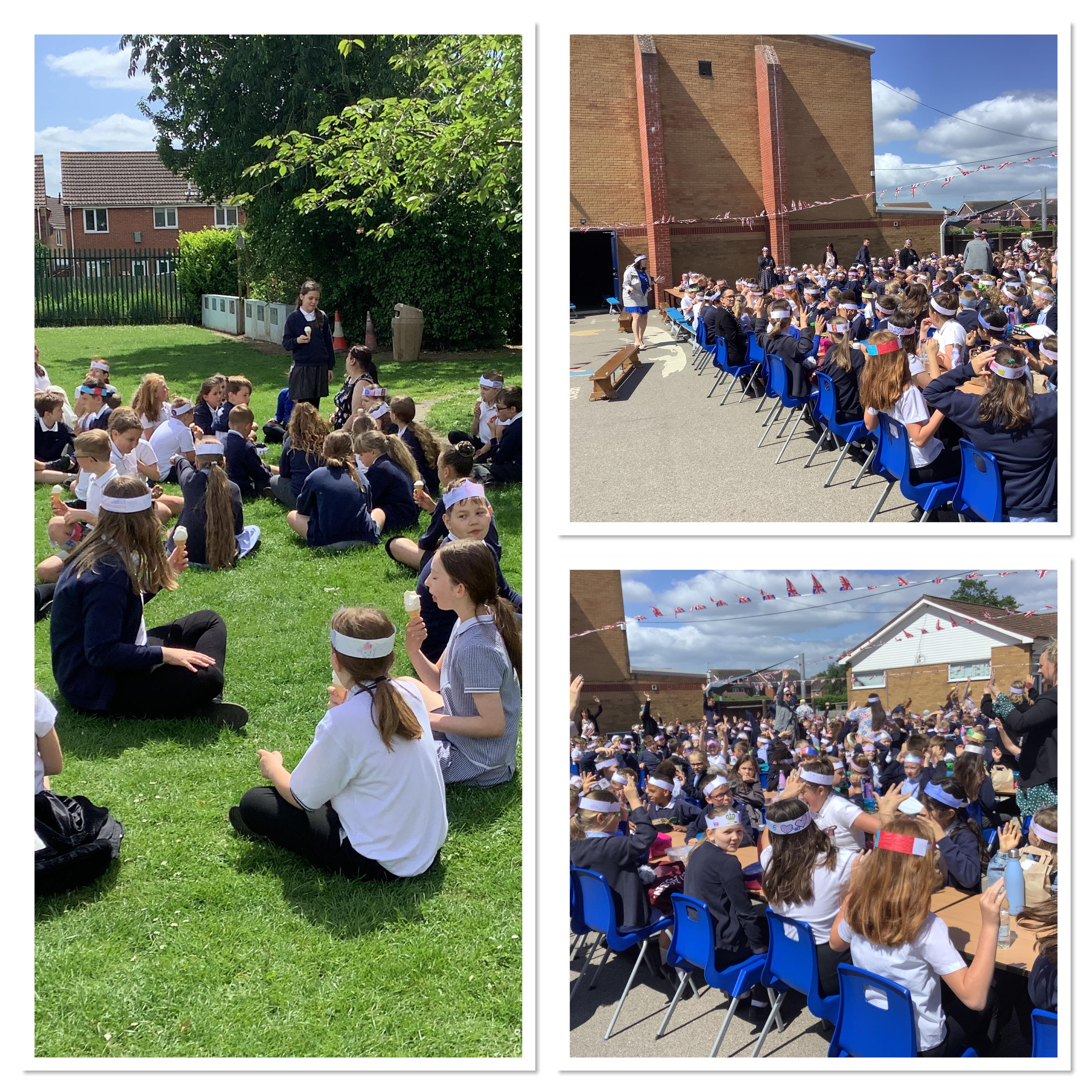 What a wonderful way to celebrate the Queen’s Platinum Jubilee! The whole school gathered together on the playground, listened to each year group sing an iconic song from each of the decades the Queen has been on the throne and ate lunch in the sun. This was followed by a memorable treat - Skinner’s ice cream for everyone!